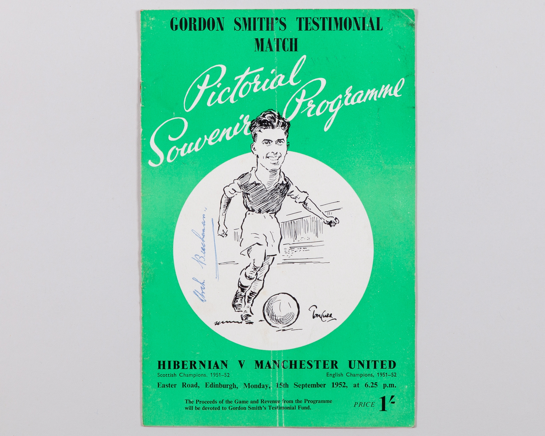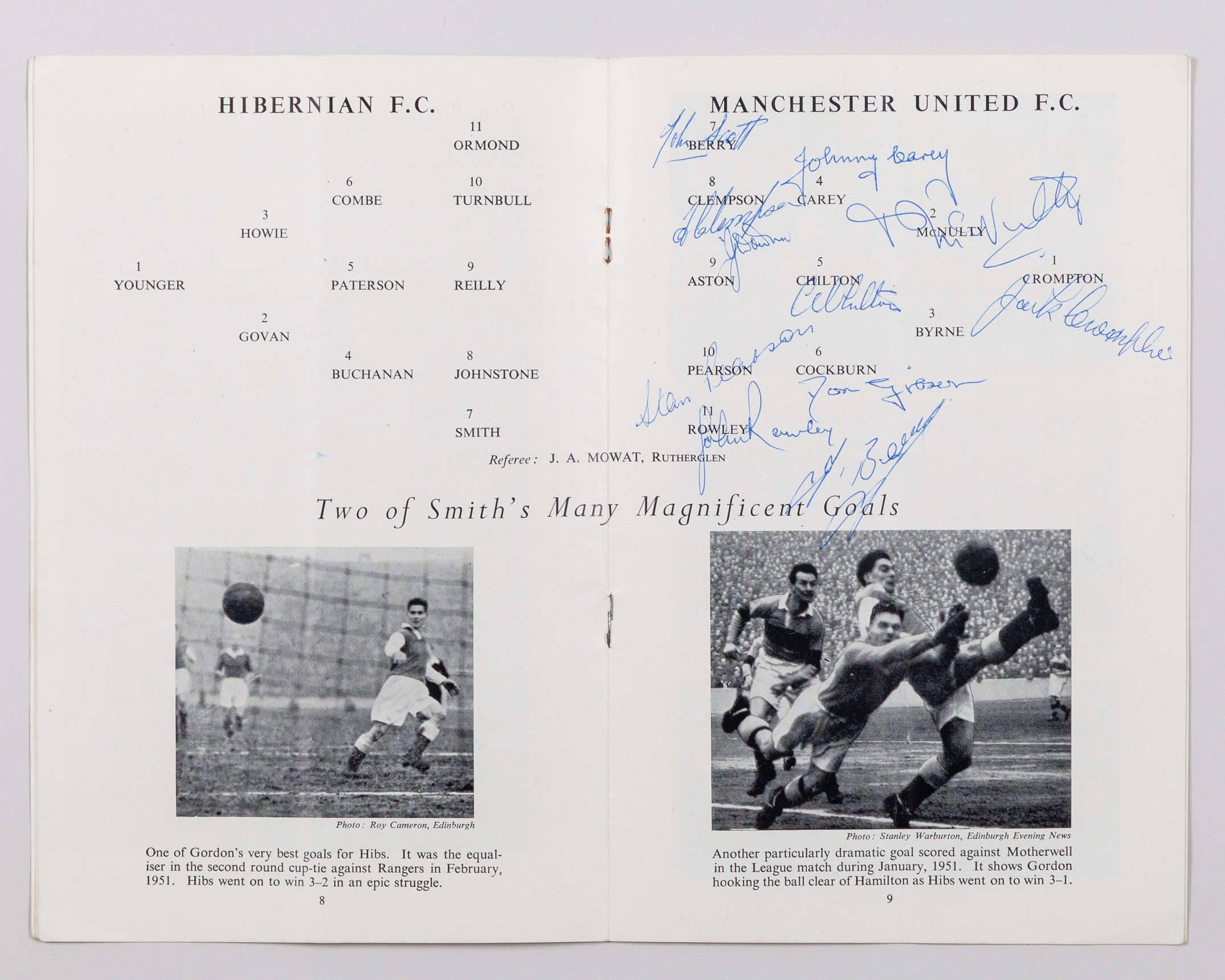 Jack Rowley Hibernian v. Manchester United, Gordon Smith's Testimonial match programme, 15th September 1952, the team pages fully autographed by the United side signs of fold