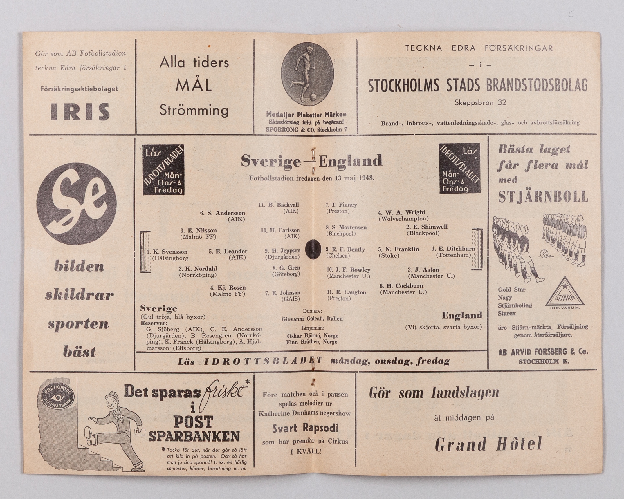 Jack Rowley Sweden v. England match programme, 13th May 1949