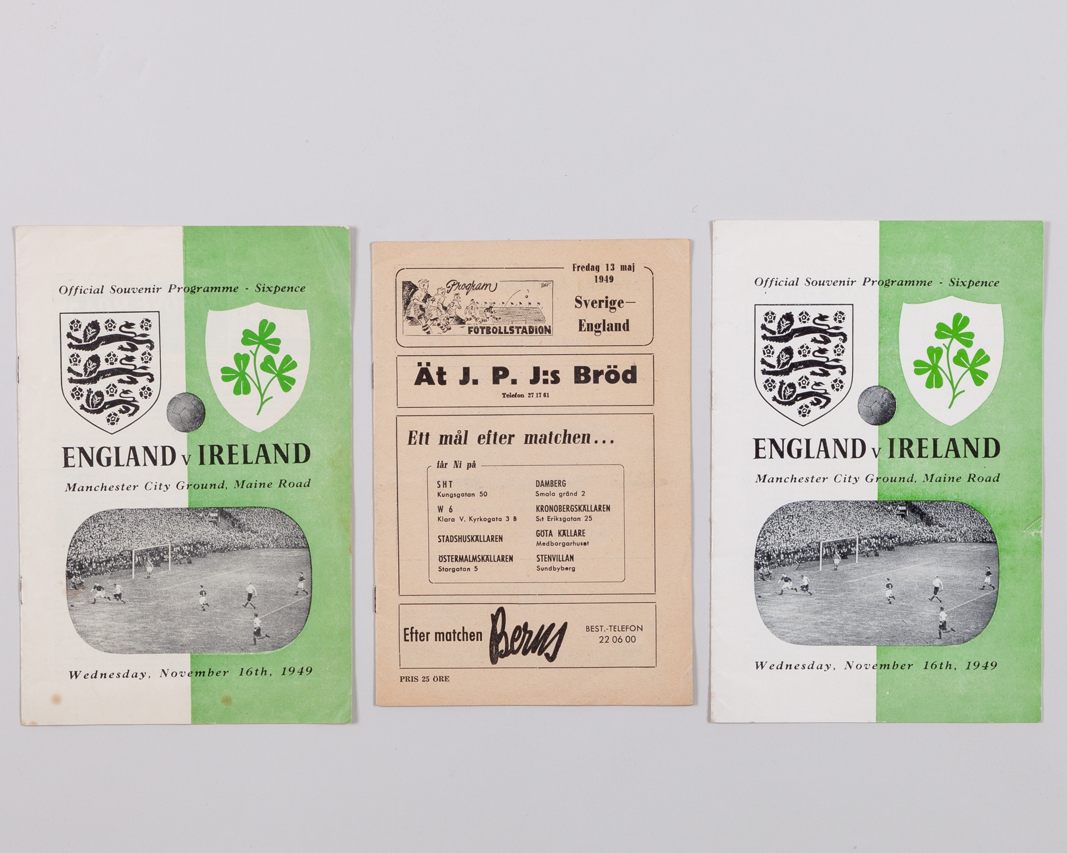 Jack Rowley Sweden v. England match programme, 13th May 1949, match played at the Rosunda Stadium, Solna, two England v. Ireland match programmes, 16th November 1949 (3)