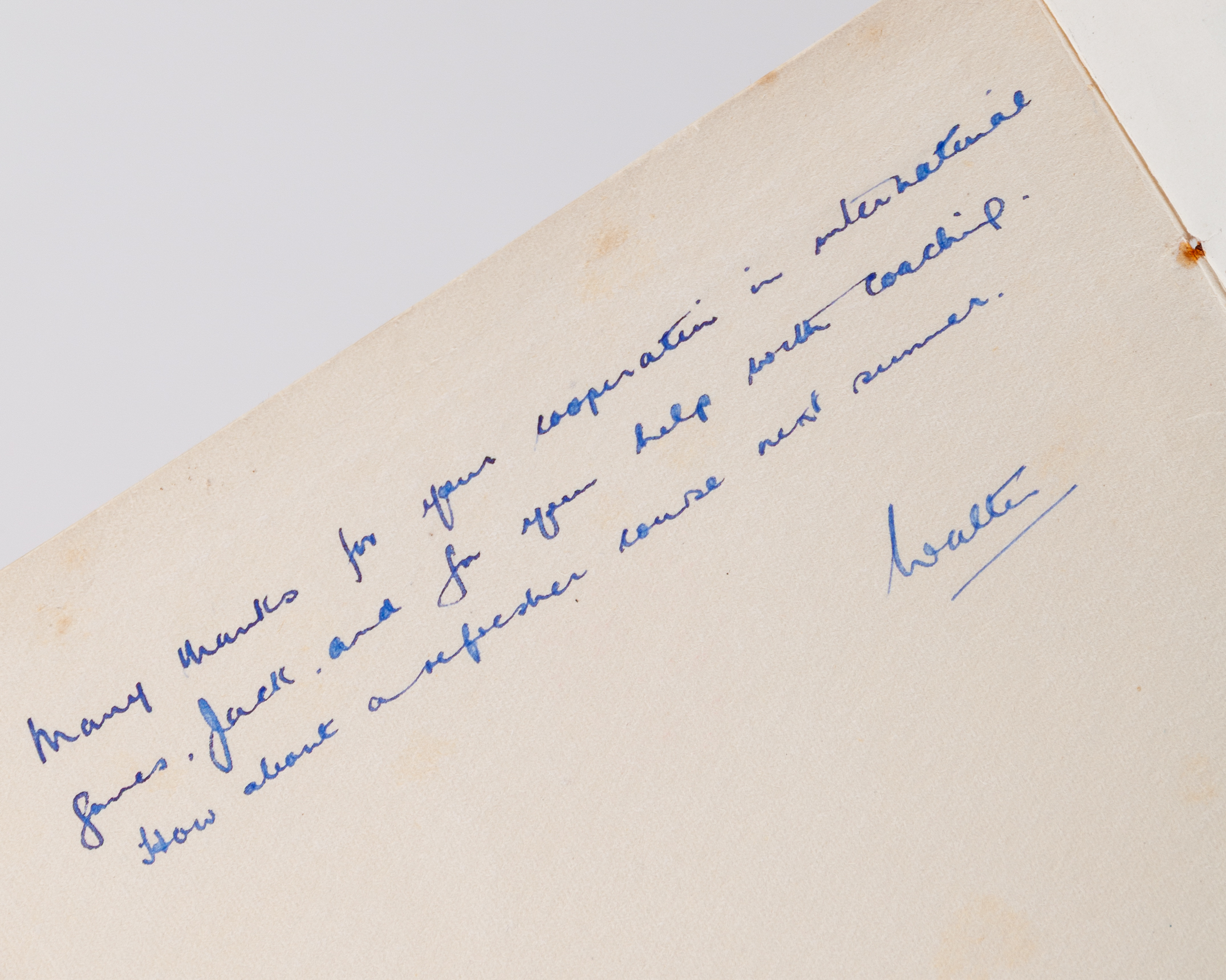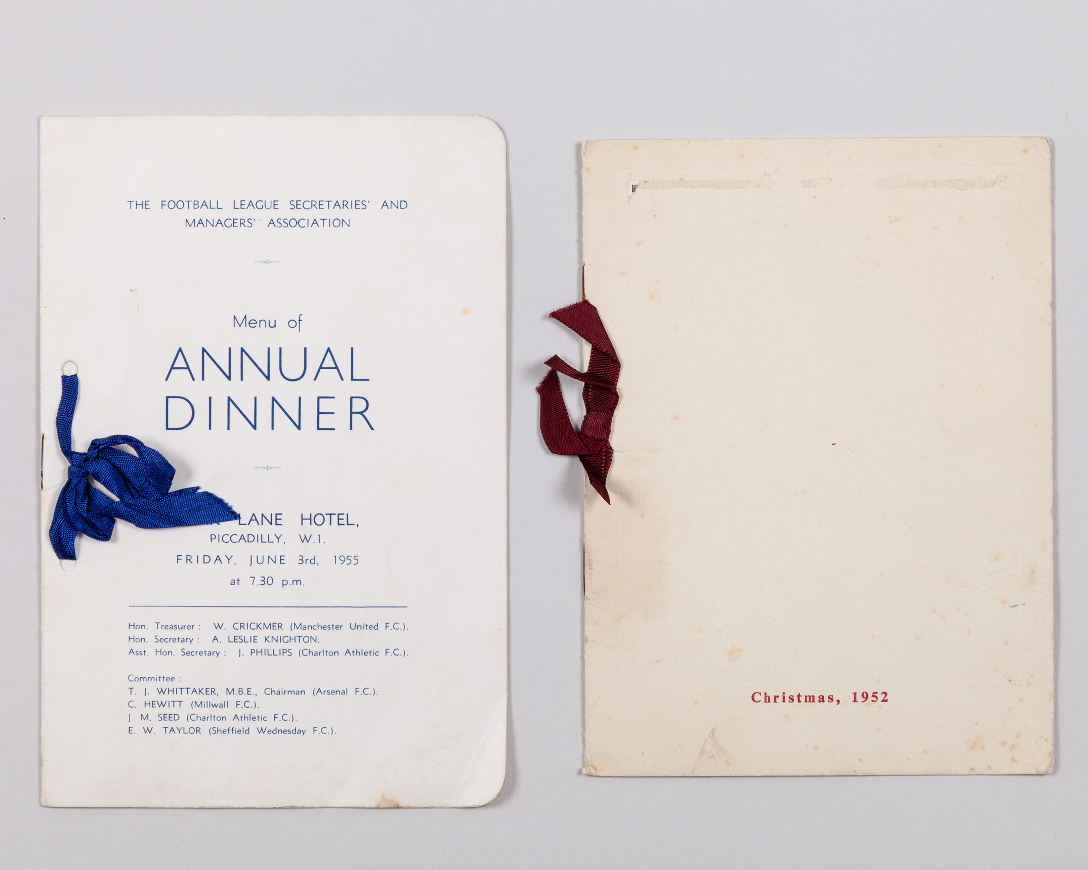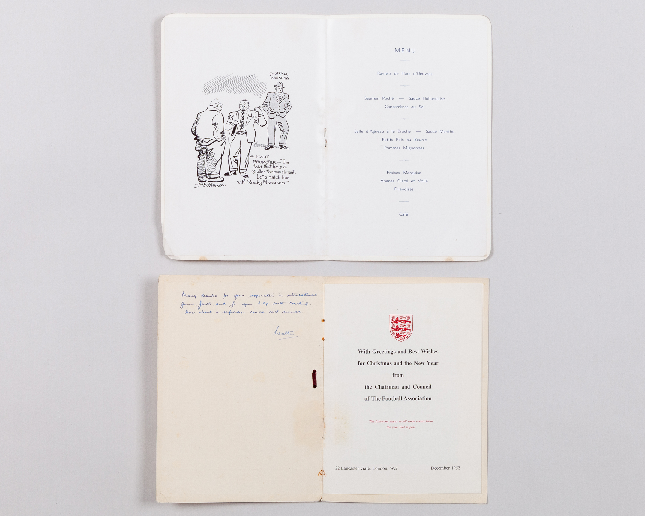 Jack Rowley a F.A. Christmas card from Walter Winterbottom, 1952, with handwritten message from Walter Winterbottom, Many thanks for your cooperation in the intermediate games Jack and for your help with coaching. How about a refresher course next summer, Walter and a Football League Secretaries and Managers Association menu card, held at the Park Lane, London, 3rd June 1955 (2)