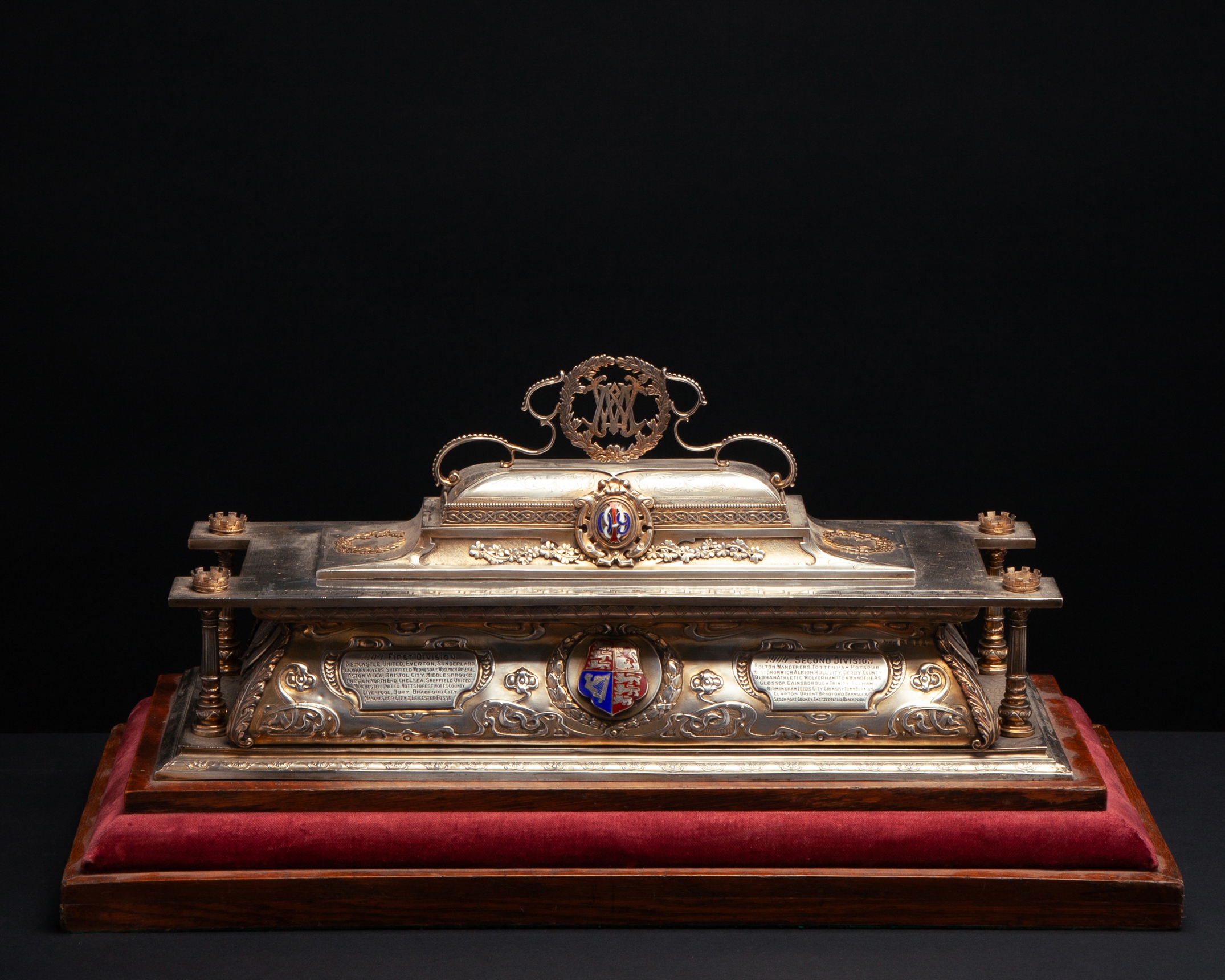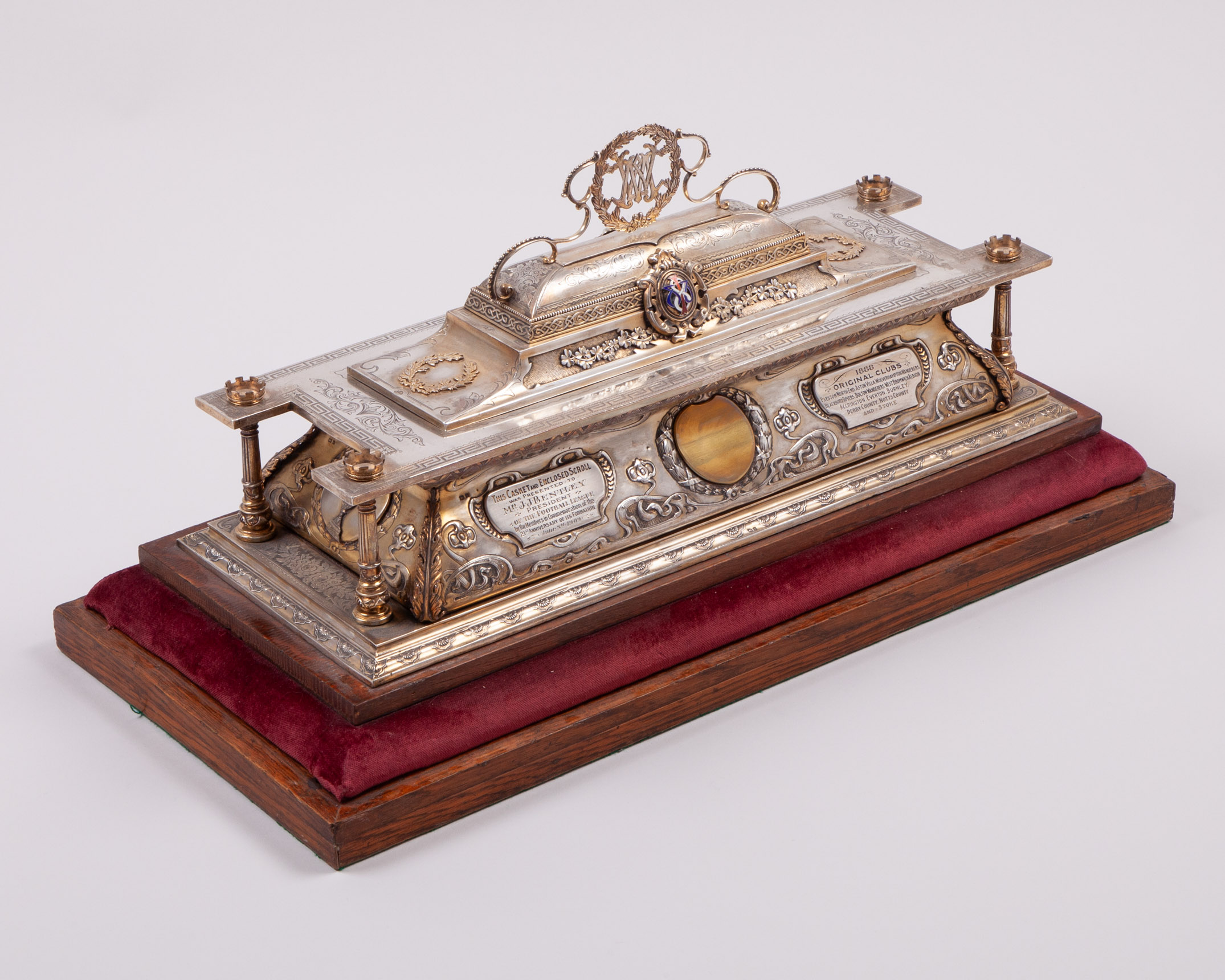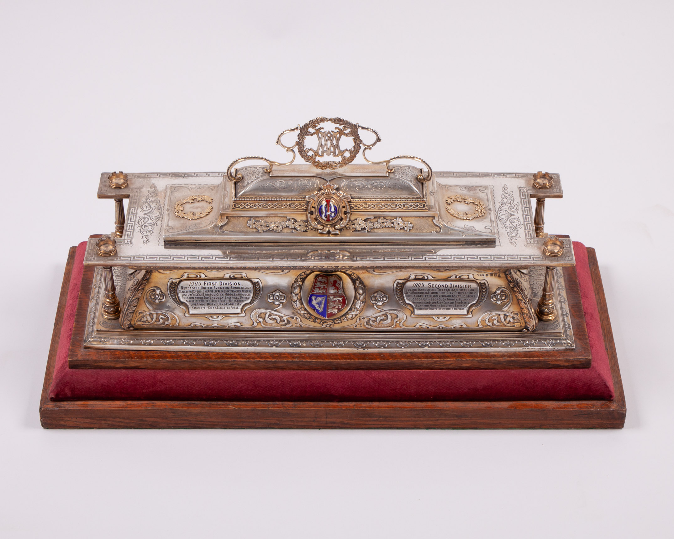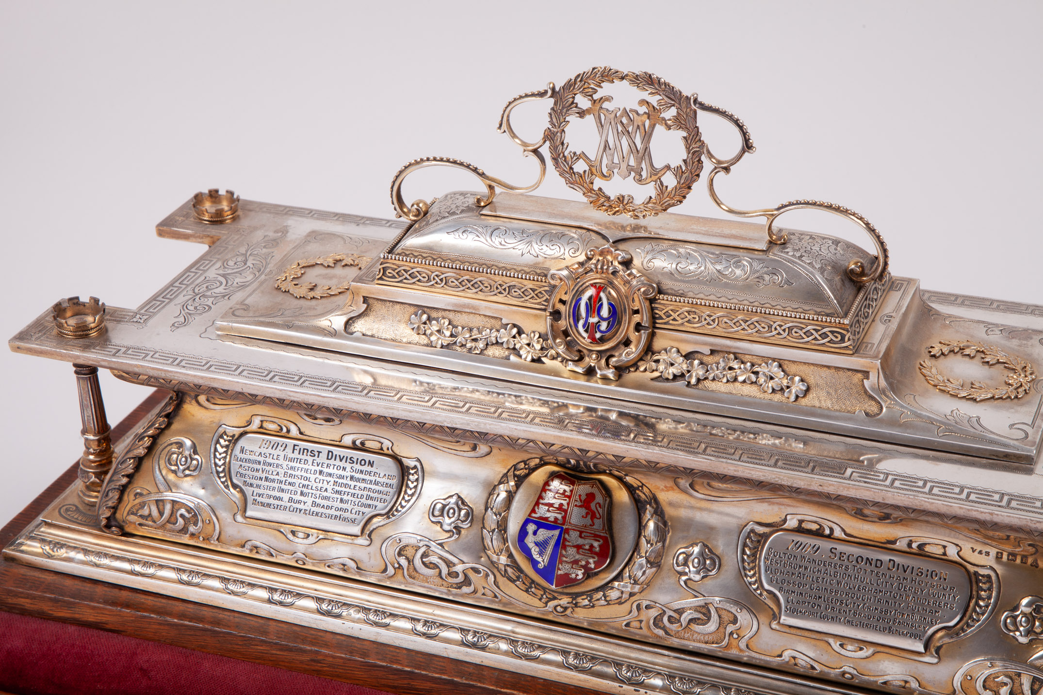 Rare and important silver-gilt and enamel casket presented to J.J.Bentley, from The Football League in 1909, chased and engraved all-over with scrolling foliage, the detachable lid enclosing a silk-lined interior and monogrammed in enamel to one side with the date 1888 and 1909 to the other, the frieze centred by a shield-shaped enamel plaque enclosed by a laurel wreath and flanked on either side by a shaped rectangular raised panel engraved with the member clubs of the 1st Division and 2nd Division in the year 1909, including Newcastle United, Everton, Sunderland, Blackburn Rovers, Woolwich Arsenal, Preston North End, Chelsea, Manchester United, Liverpool, Bradford, Bolton Wanderers, Tottenham Hotspur, Derby County, Wolverhampton Wanderers, Gainsborough Trinity, Fulham, Leeds City etc, the reverse with two further raised shaped rectangular panels, one inscribed This Casket and Enclosed scroll was presented to Mr. J.J. Bentley President of the Football League by the Members in Commemoration of the 21st Anniversary of its Formation, June 8th 1909, the other inscribed 1888 Original Clubs Preston North End, Aston Villa, Wolverhampton Wanderers, Blackburn Rovers, Bolton Wanderers, West Bromwich Albion, Accrington, Everton, Burnley, Derby County, Notts County and Stoke, the sides mounted with relief panels depicting the Division 1 Championship Trophy and the Division II Championship Shield, the angles with fluted Corinthian pillars, on rectangular base and maroon velvet-covered leather plinth, lacking scroll, finial to lid and a plaque to the reverse, gilding rubbed, damages, 21cm high, 56cm wide