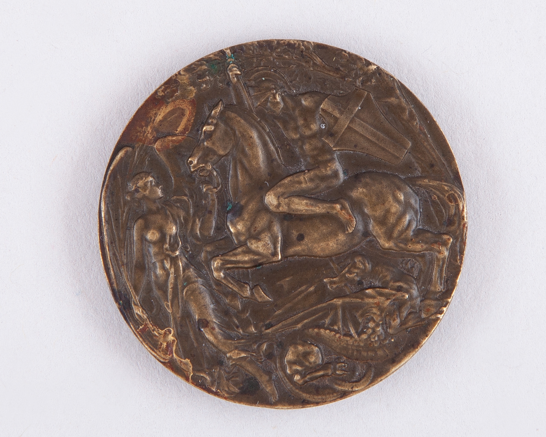 London 1908 Olympic Games Clay Birds bronze medal, designed by Bertram Mackennal, the obverse with two young maidens are crowning a winning athlete and inscribed OLYMPIC GAMES LONDON 1908, the reverse with St George slaying the dragon, the rim inscribed THIRD PRIZE CLAY BIRDS TEAM and stamped Vaughton, with foundry stamp