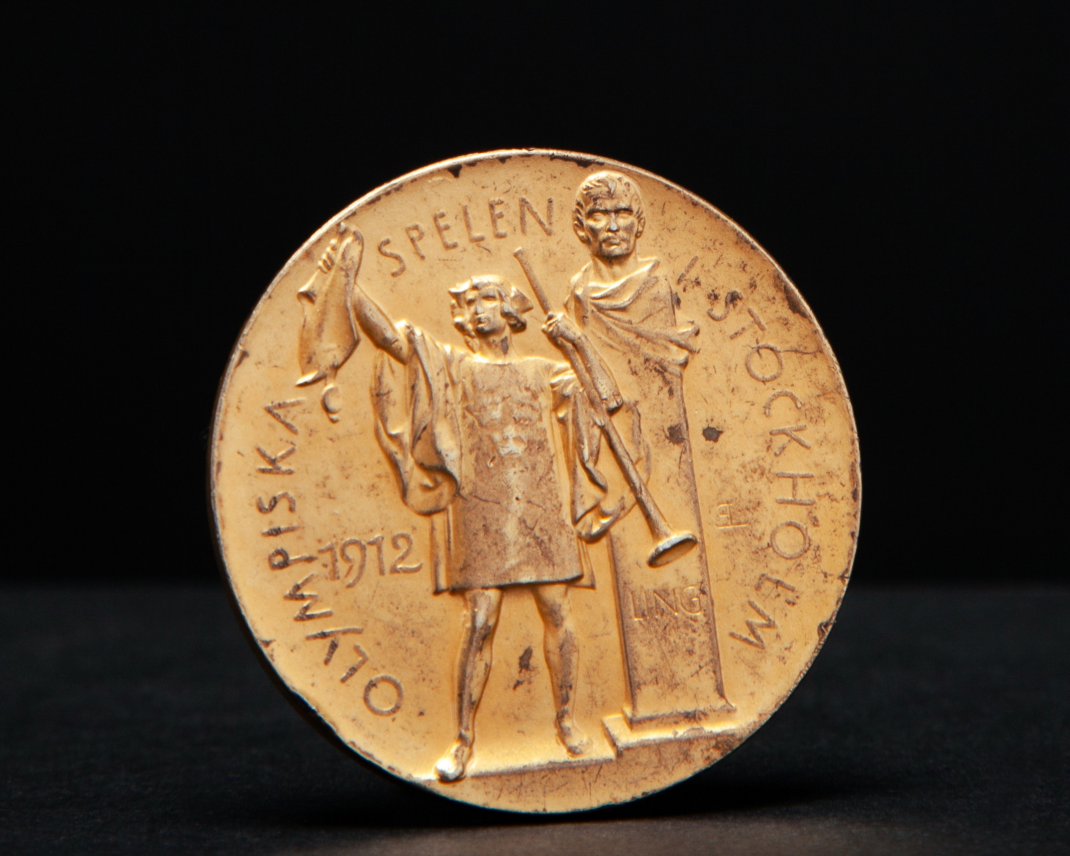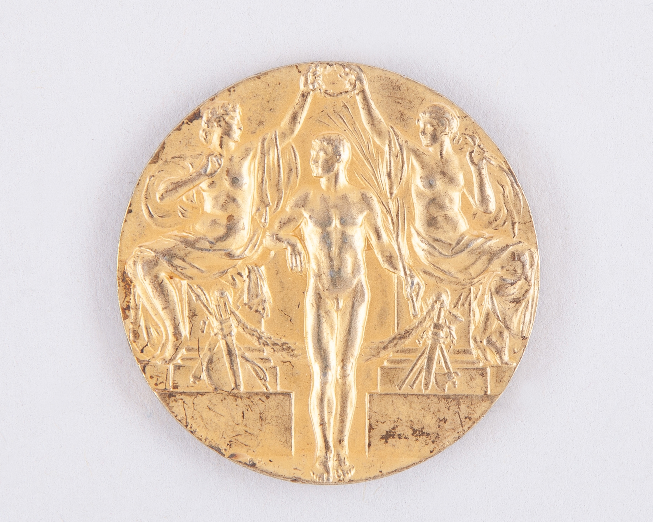 Joseph Dines a rare 1912 Olympic Football gold medal, struck in silver-gilt (as usual for 1912 1st Place team awards), designed by Erik Lindberg and Bertram Mackennal, two maidens crowning a victorious athlete, the reverse inscribed OLYMPISKA SPELEN STOCKHOLM, 1913, 35mm, surface scratches and some rubbing