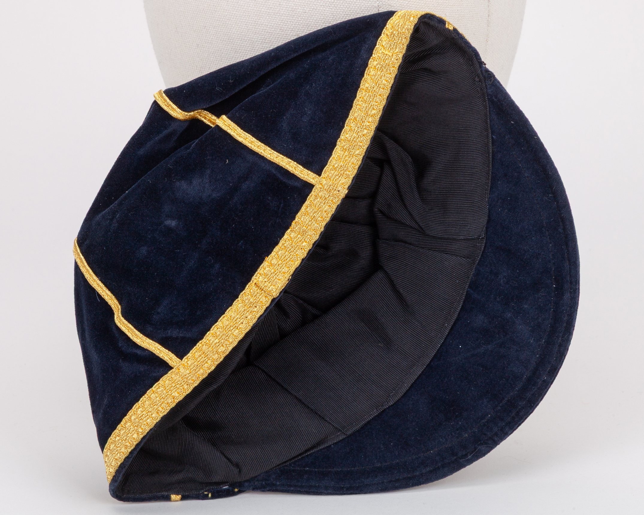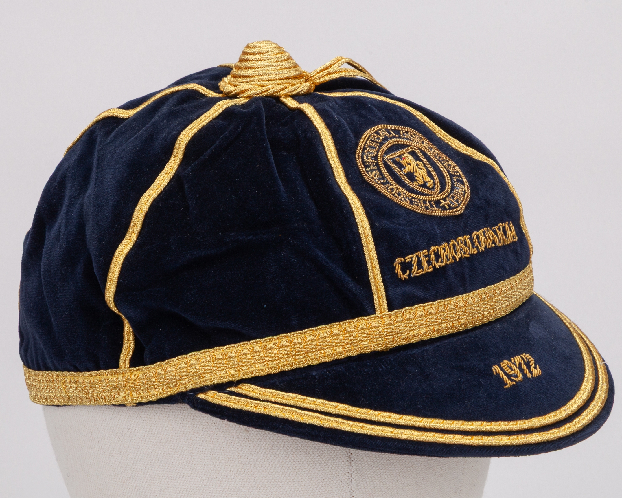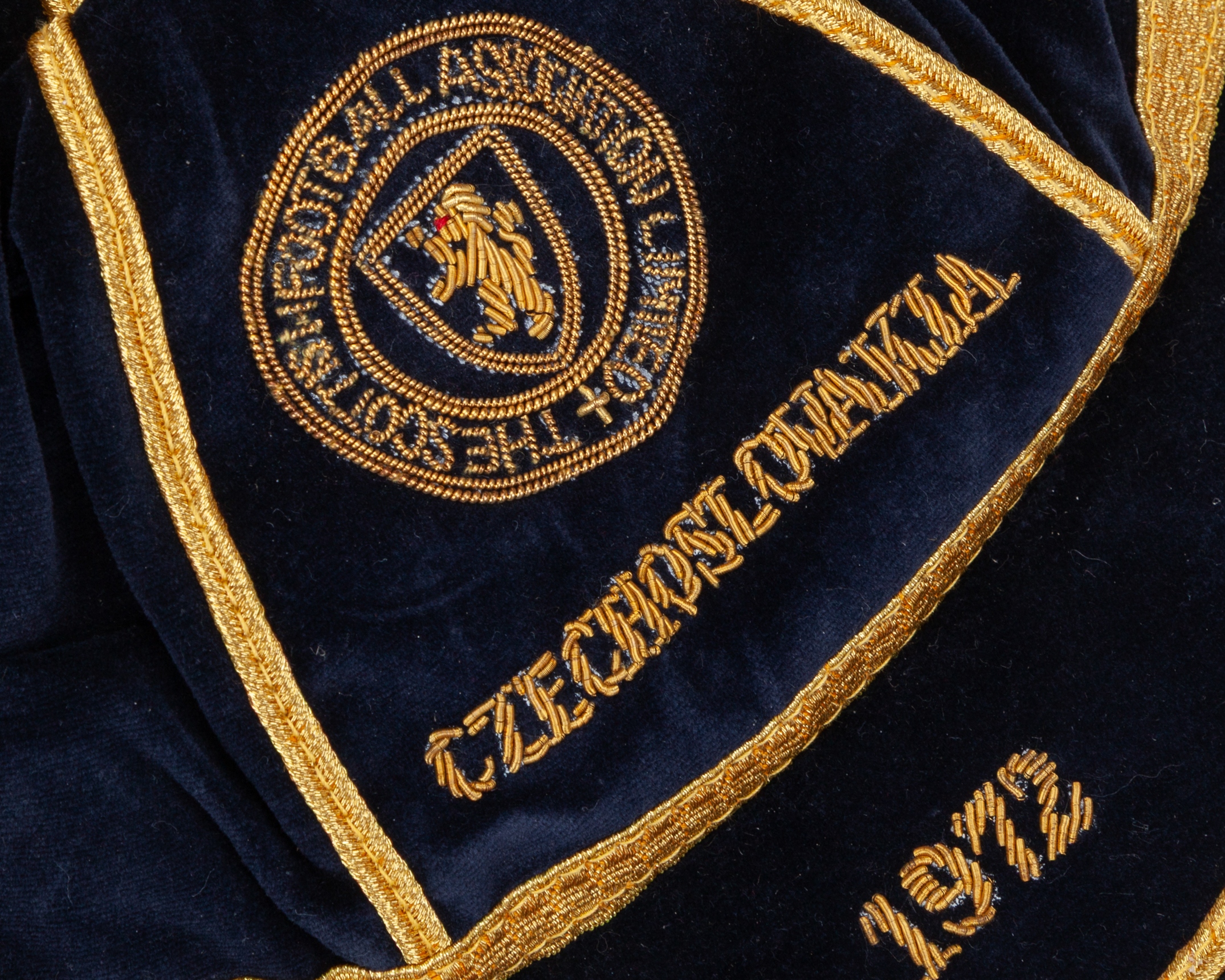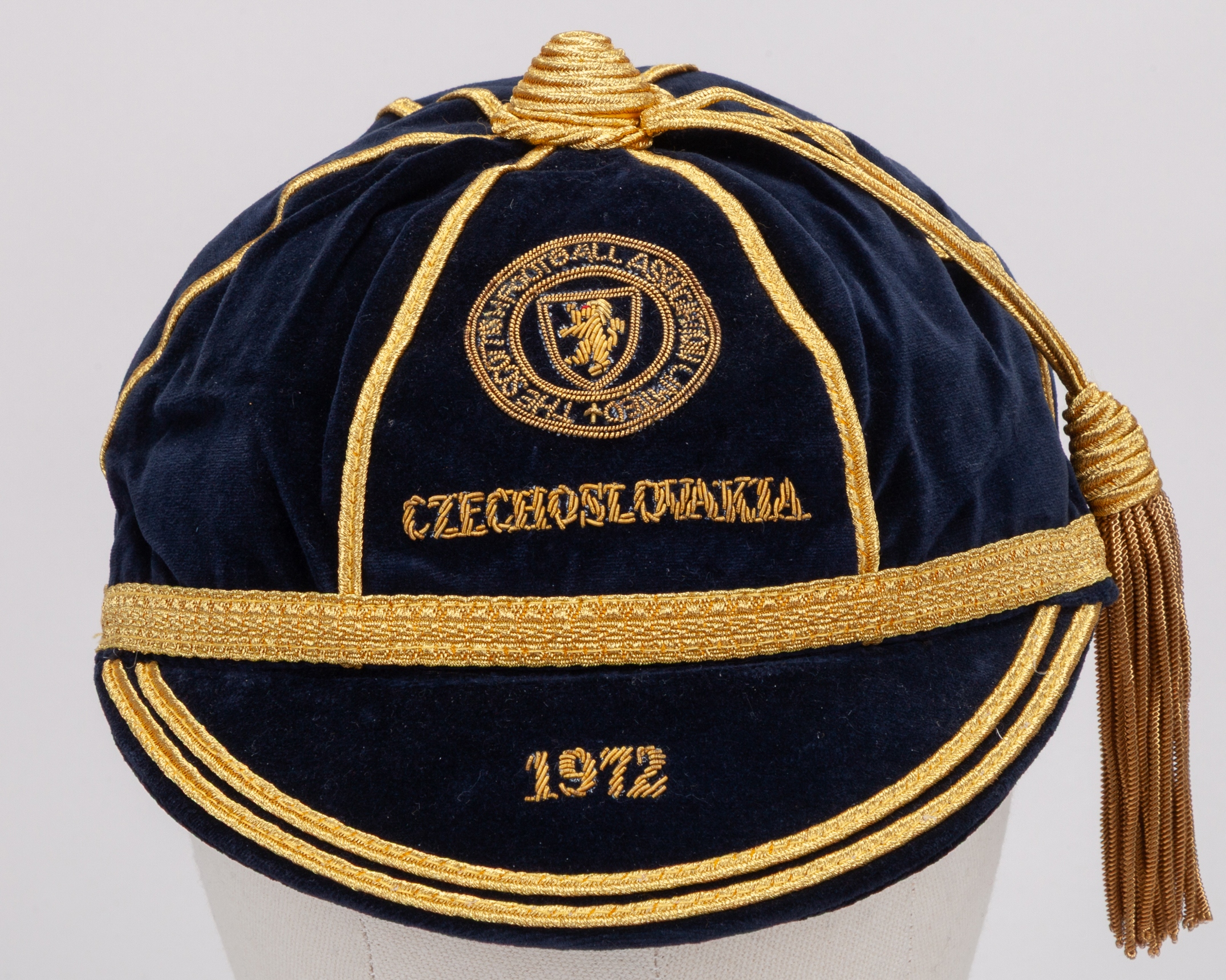 Willie Morgan blue Scotland v. Czechoslovakia International cap, 1972, the blue velvet cap with gilt tassel and gilt braiding, embroidered with crest inscribed CZECHOSLOVAKIA 1972