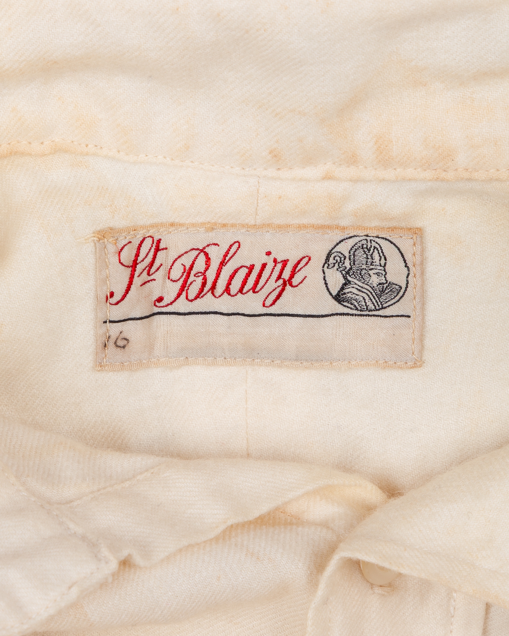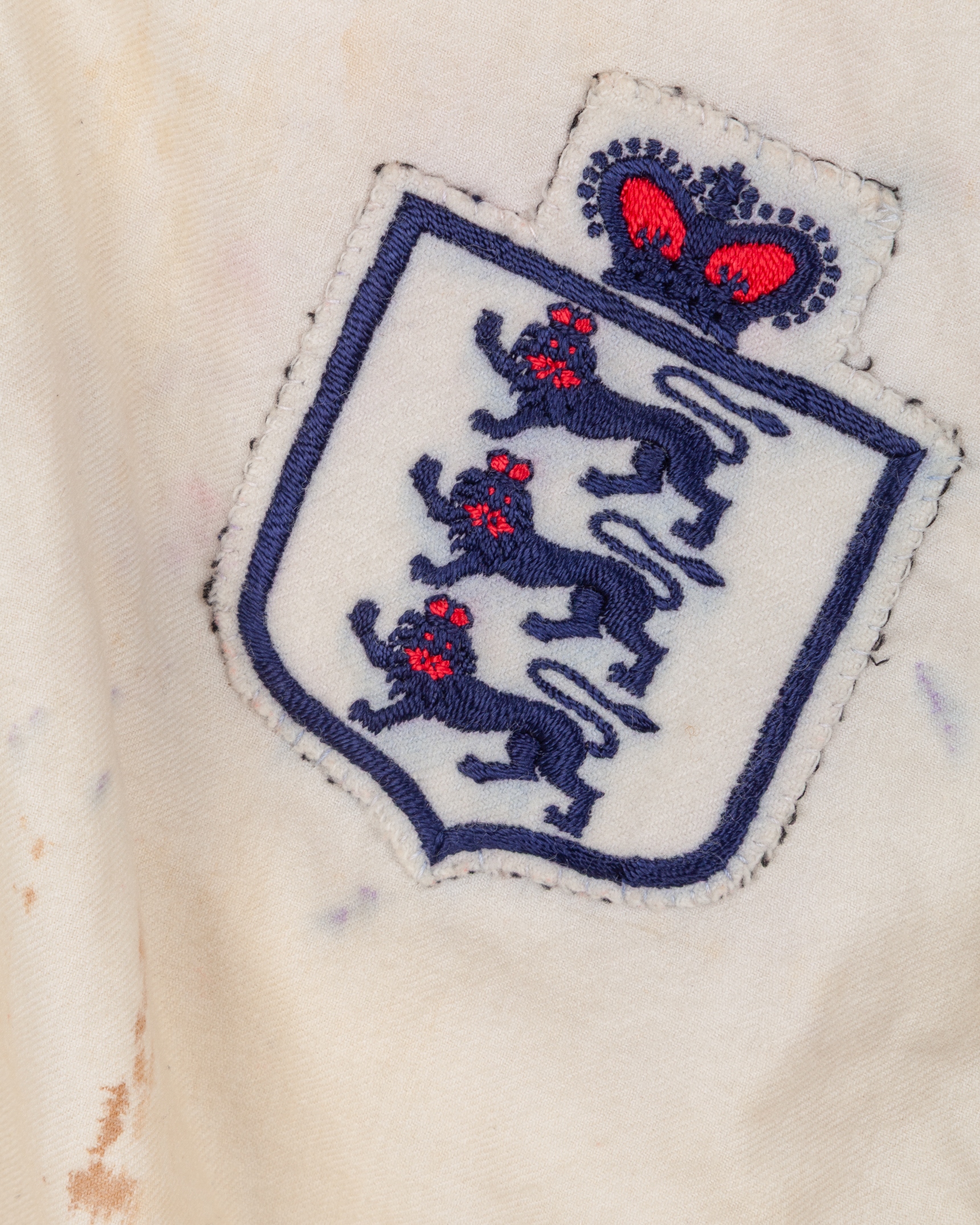 Stanley Matthews white No.7 England long-sleeved shirt, 1940s, St Blaize, with button-up collar and embroidered cloth badge, areas of staining all over, with letter of provenance relating to the shirt