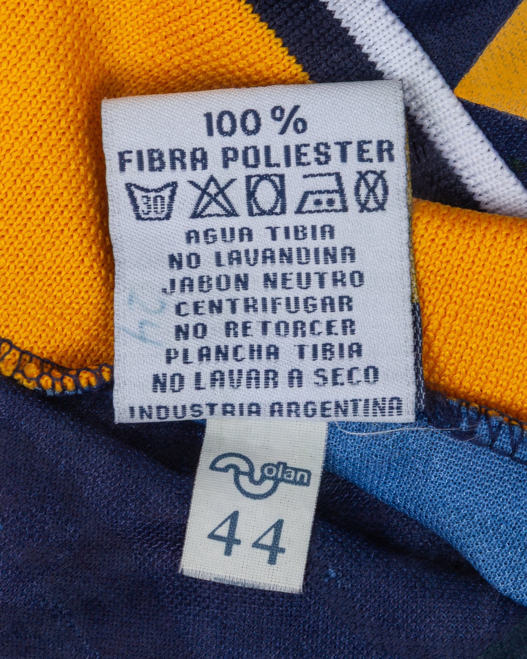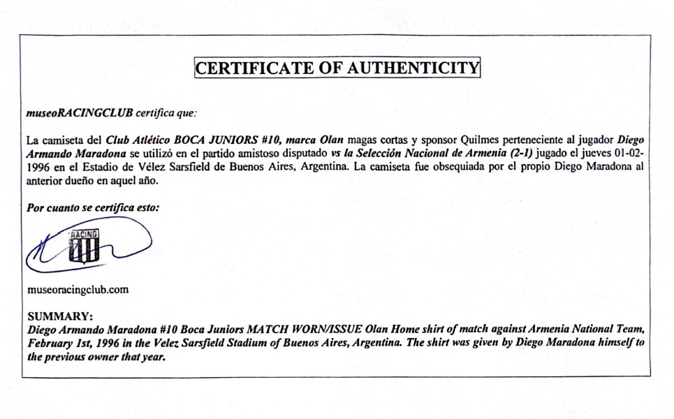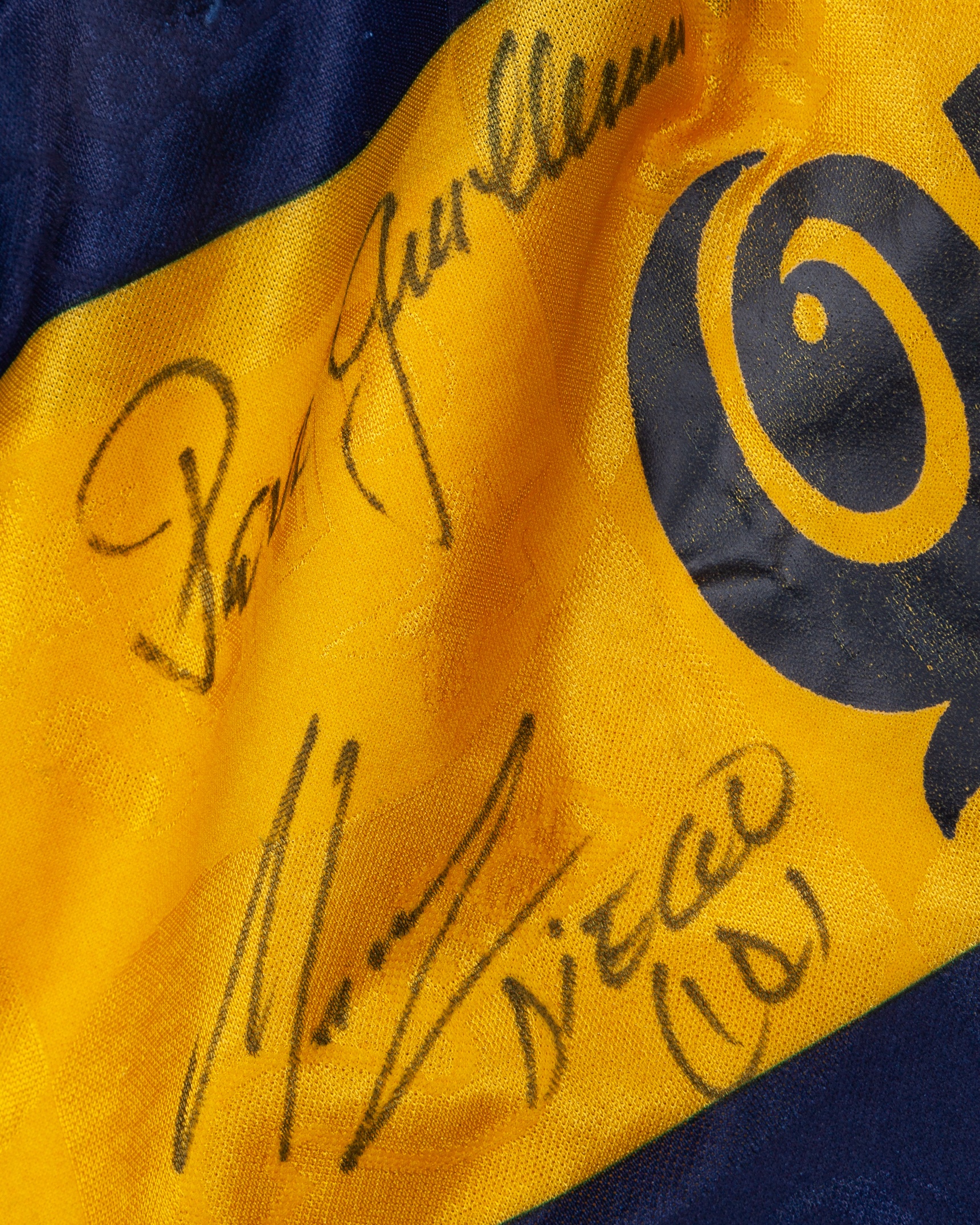 Maradona blue and yellow No.10 Boca Juniors match worn short-sleeved shirt vs. Armenia National Team, friendly played on 1st February 1996, Olan, size 44, with v-neck collar and printed badge, the front of the shirt autographed with digital COA from Racing Club Museum