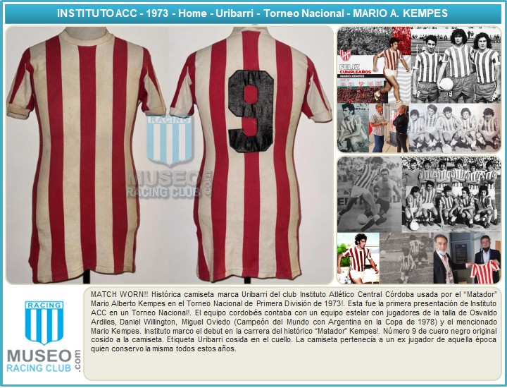 Mario Kempes red and white No.9 Instituto match worn short-sleeved shirt, 1973