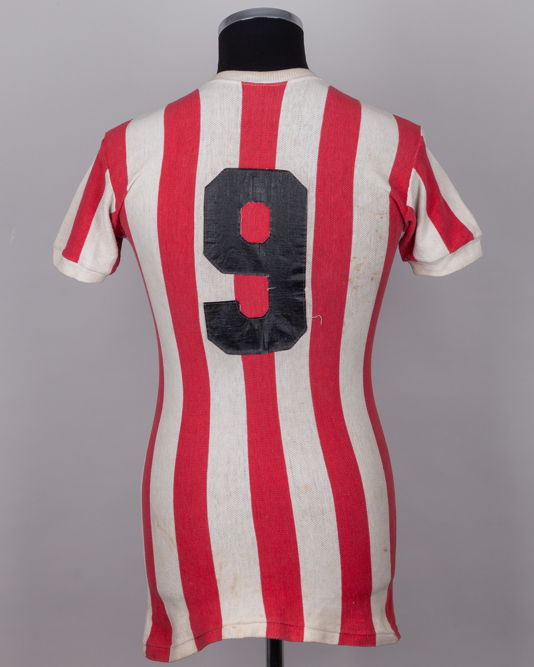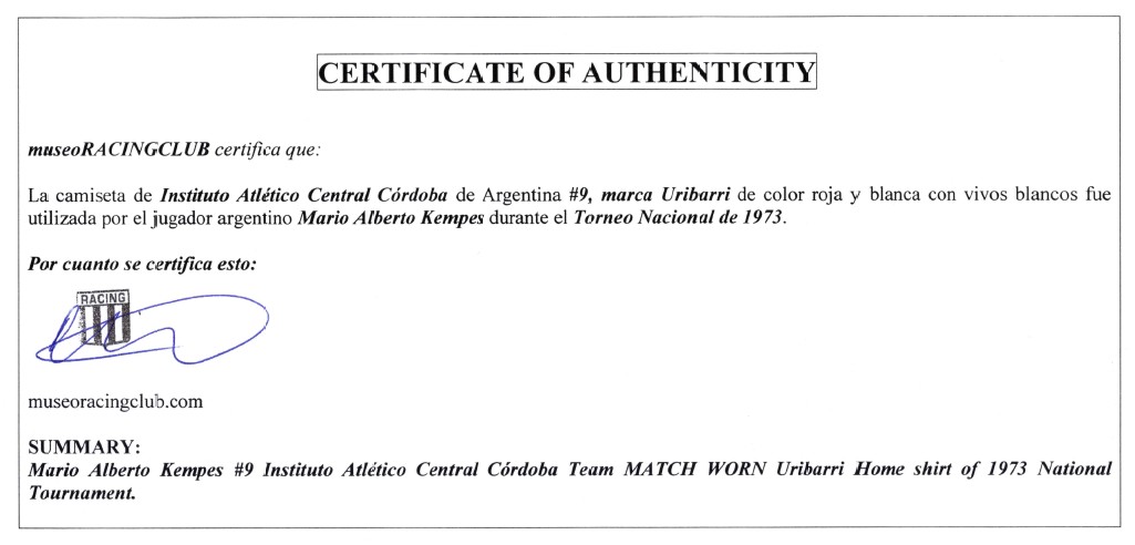 Mario Kempes red and white No.9 Instituto match worn short-sleeved shirt, 1973, with crew-neck collar, staining and fading, with digital COA from Racing Club Museum