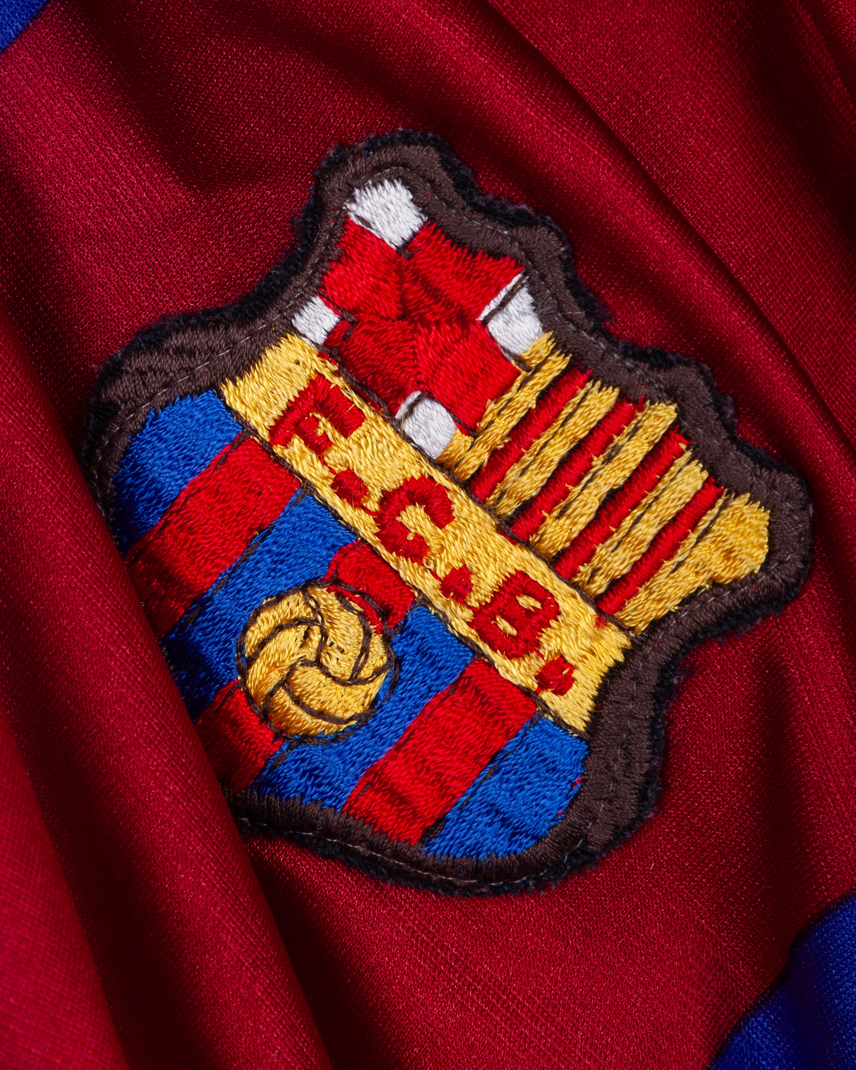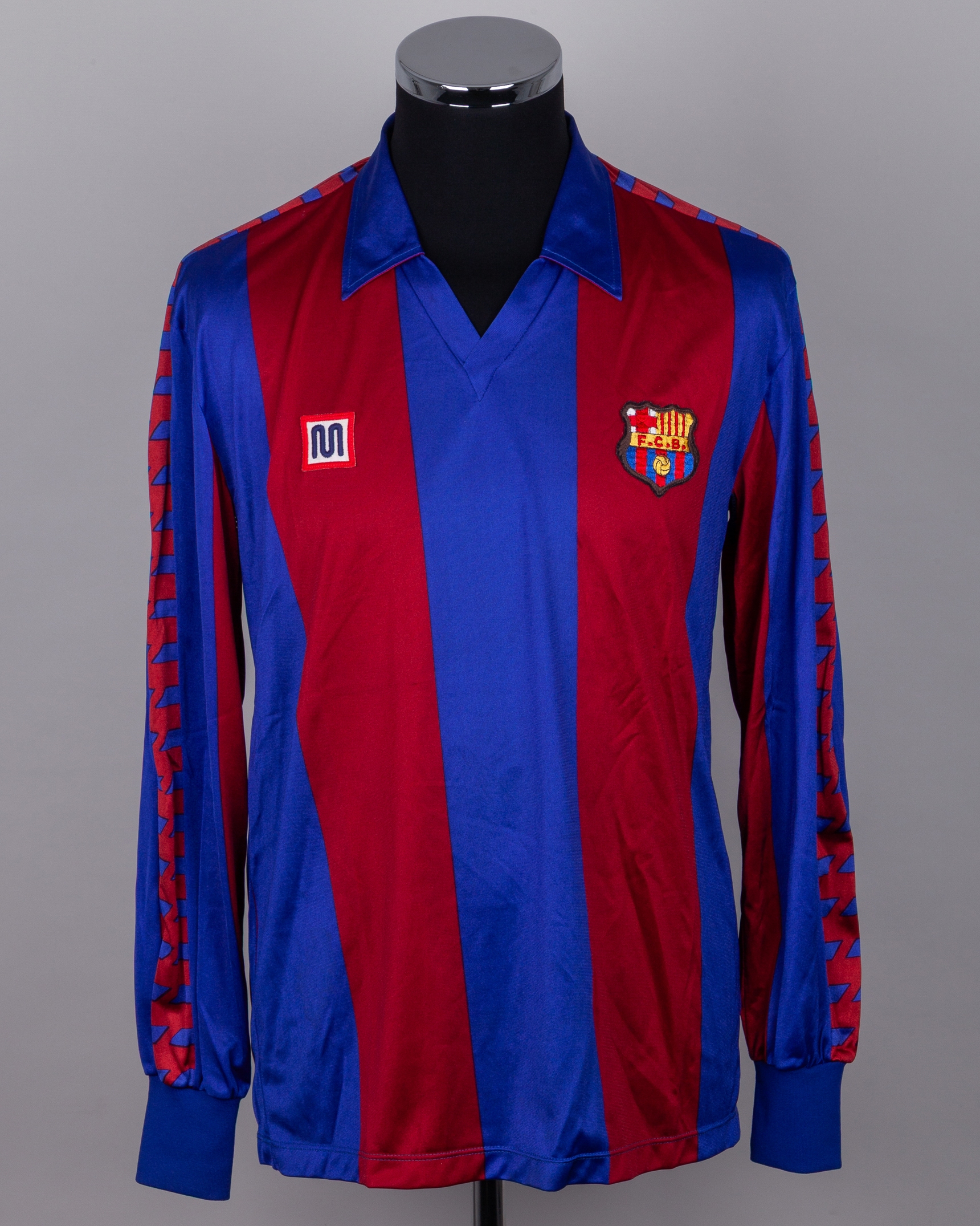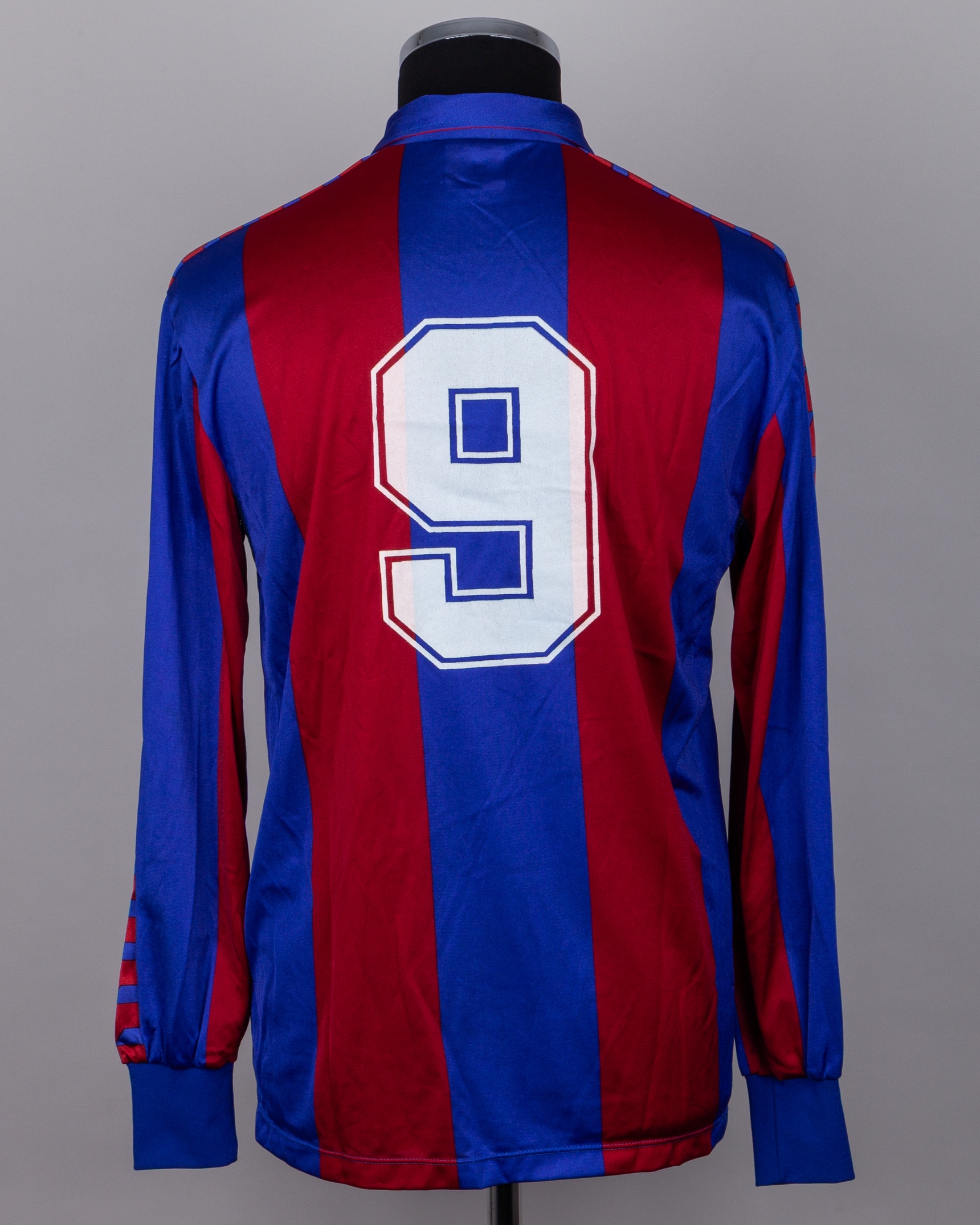 Enrique Castro Quini garnet and blue No.9 Barcelona match worn long-sleeved shirt, 1984