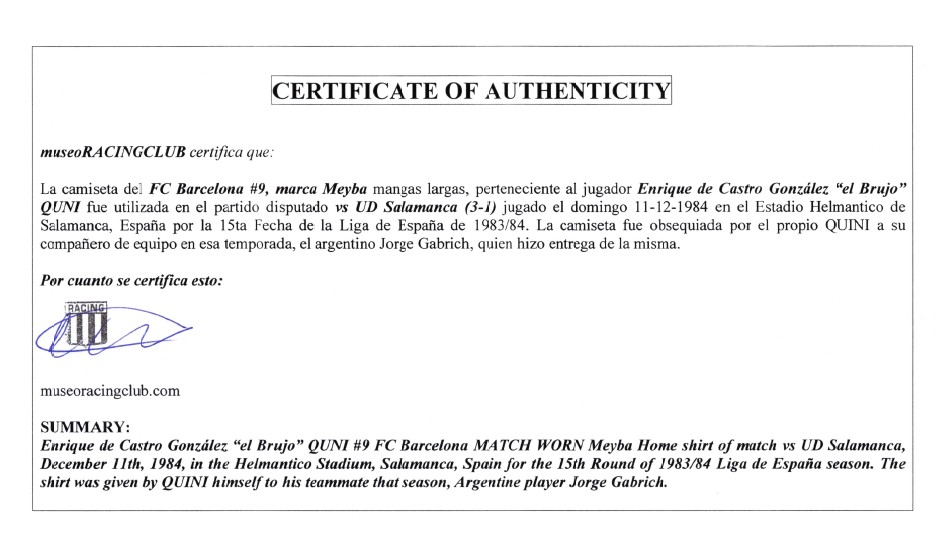 Enrique Castro Quini garnet and blue No.9 Barcelona match worn long-sleeved shirt, 1984, Meyba, with v-neck collar and embroidered cloth badge inscribed F.C.B., with digital COA from Racing Club Museum