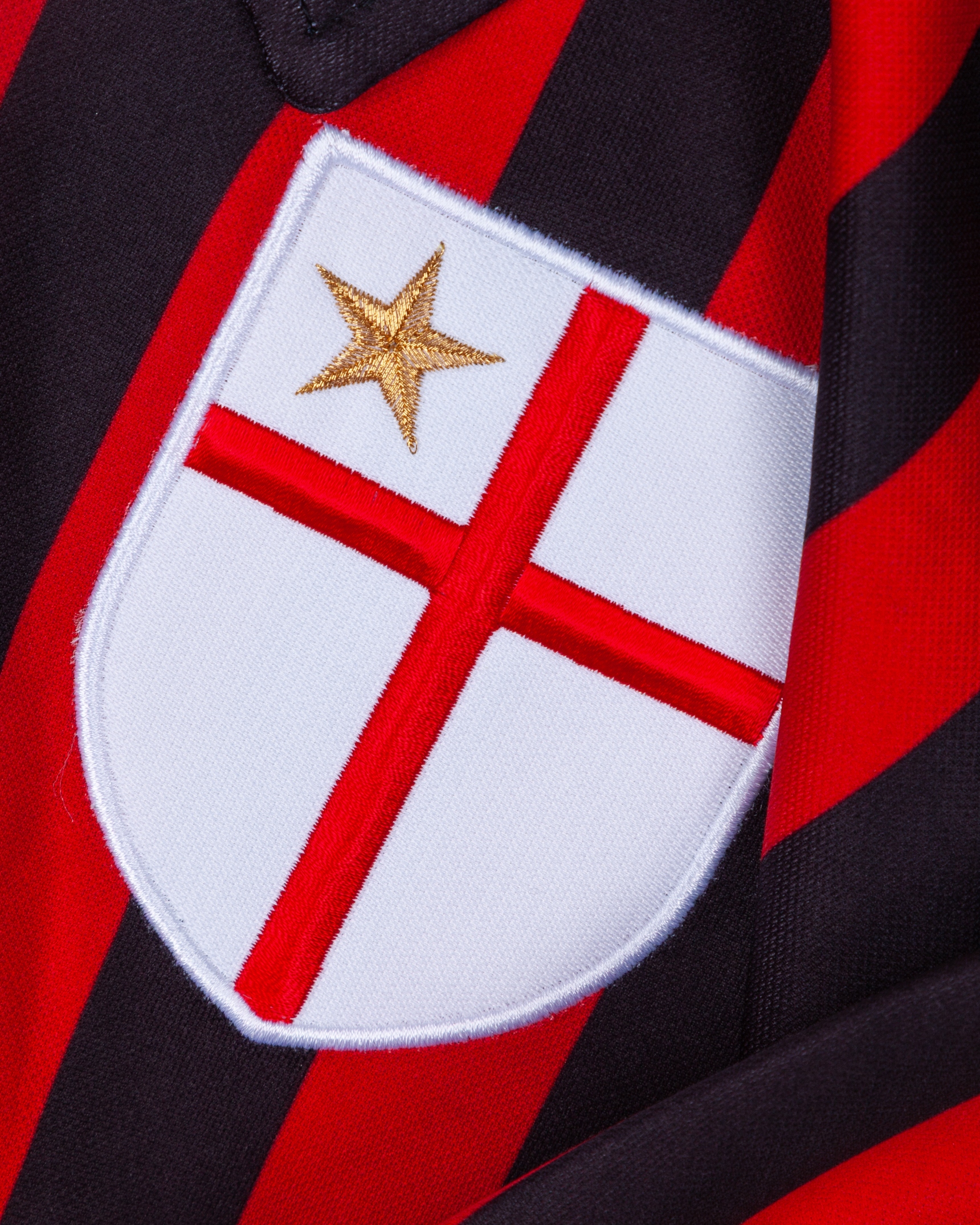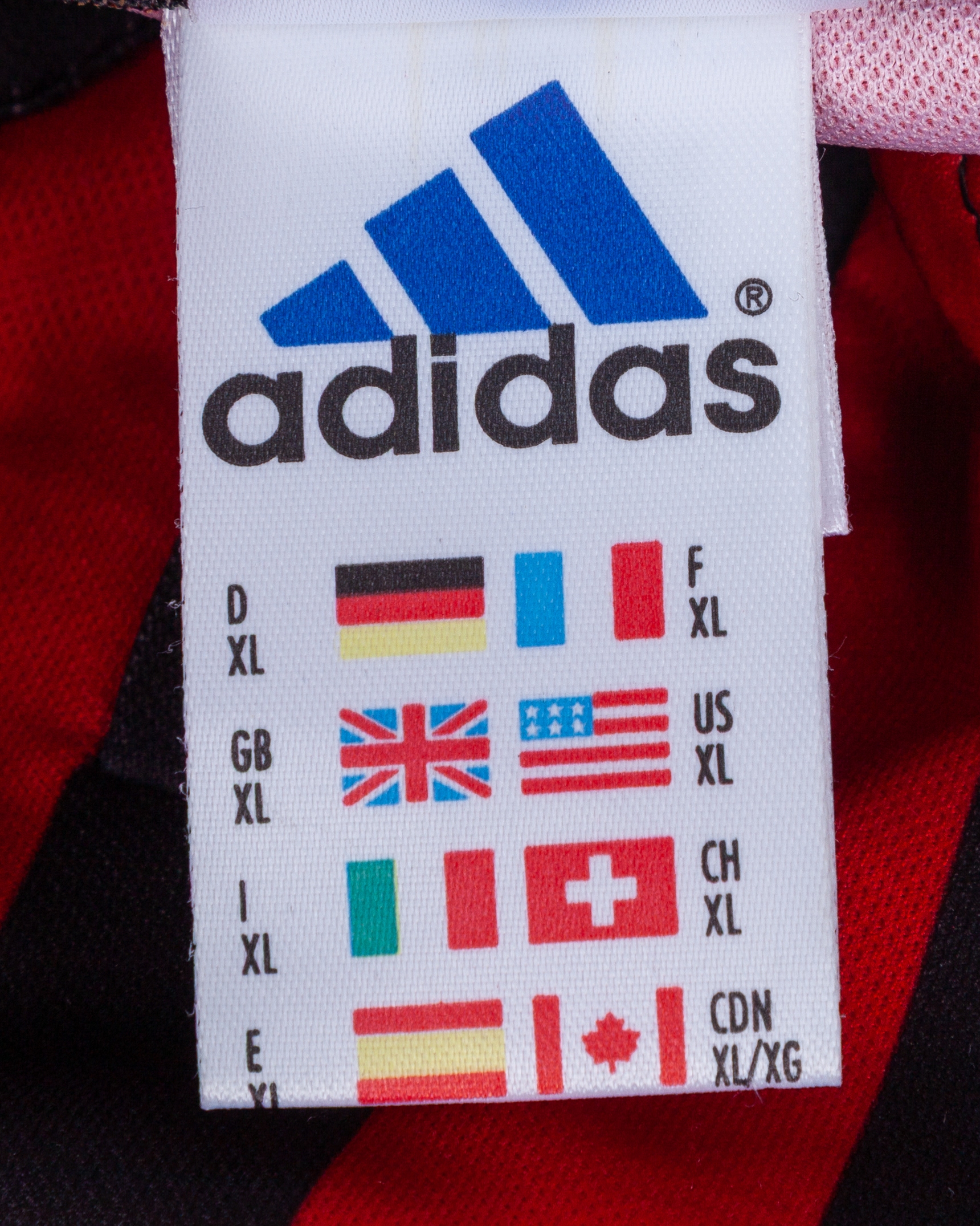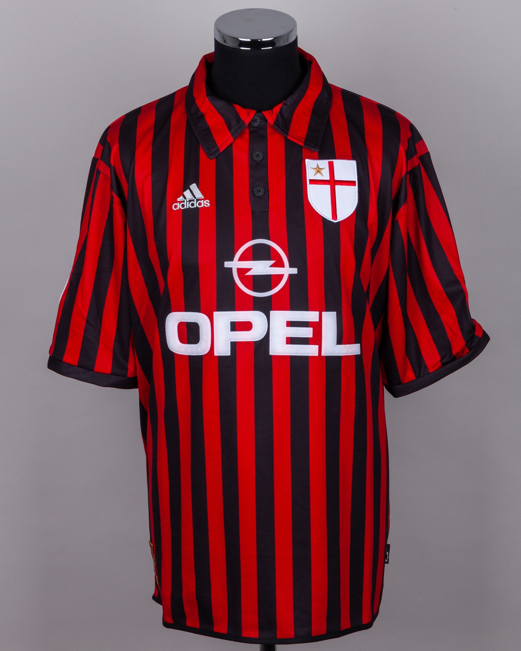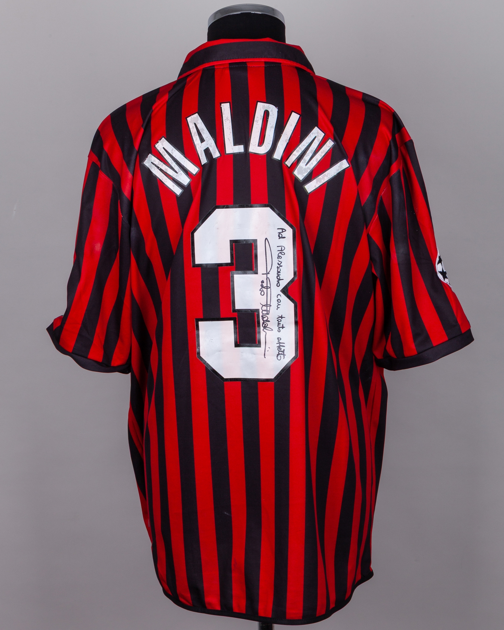 Paolo Maldini red and black No.3 AC Milan autographed short-sleeved shirt, 1999-00, Adidas, XL, with button-up collar and embroidered cloth badge, the reverse lettered MALDINI, the right sleeve with Champions League flash and the left sleeve with Italian flag flash, the number autographed, with print worn
