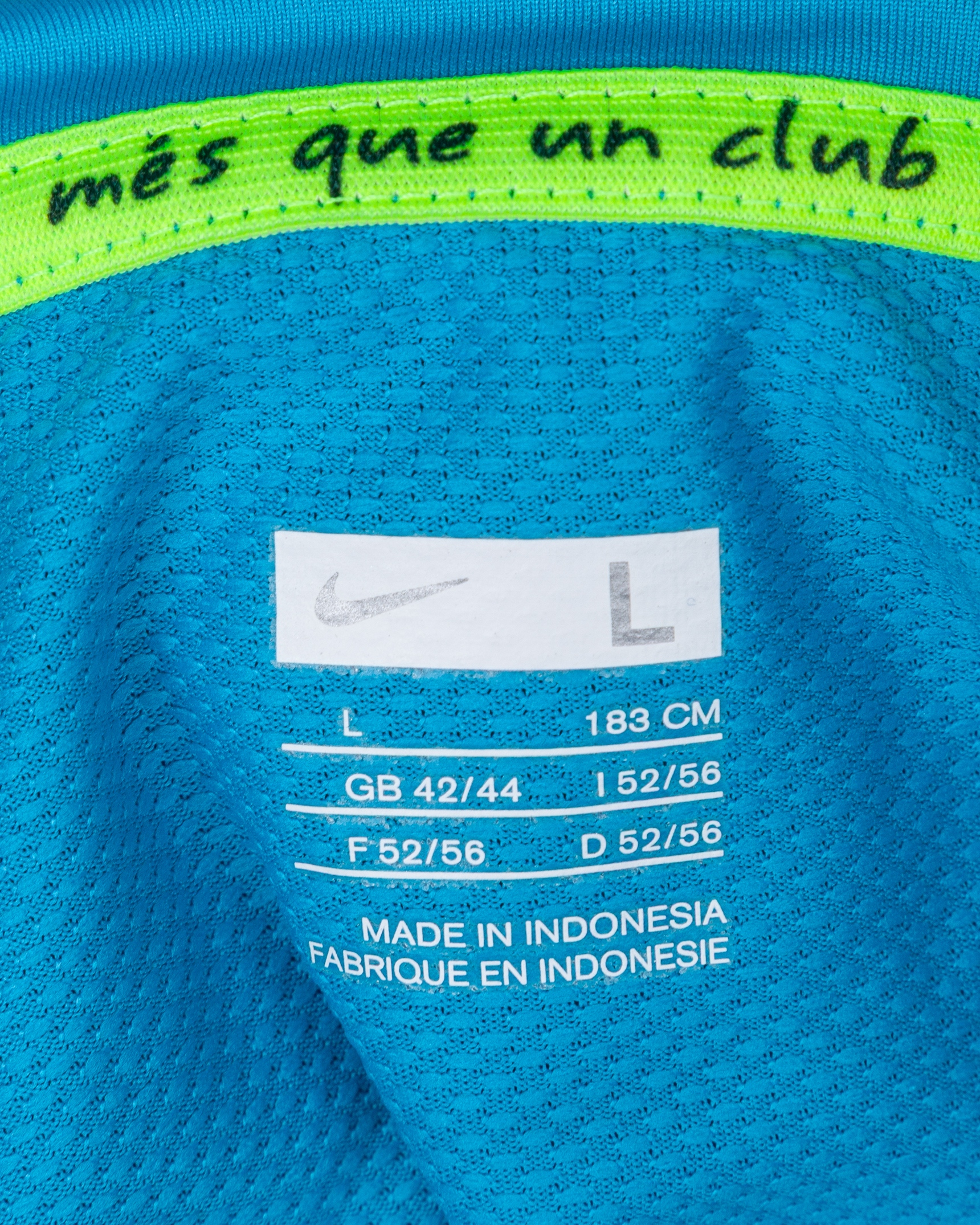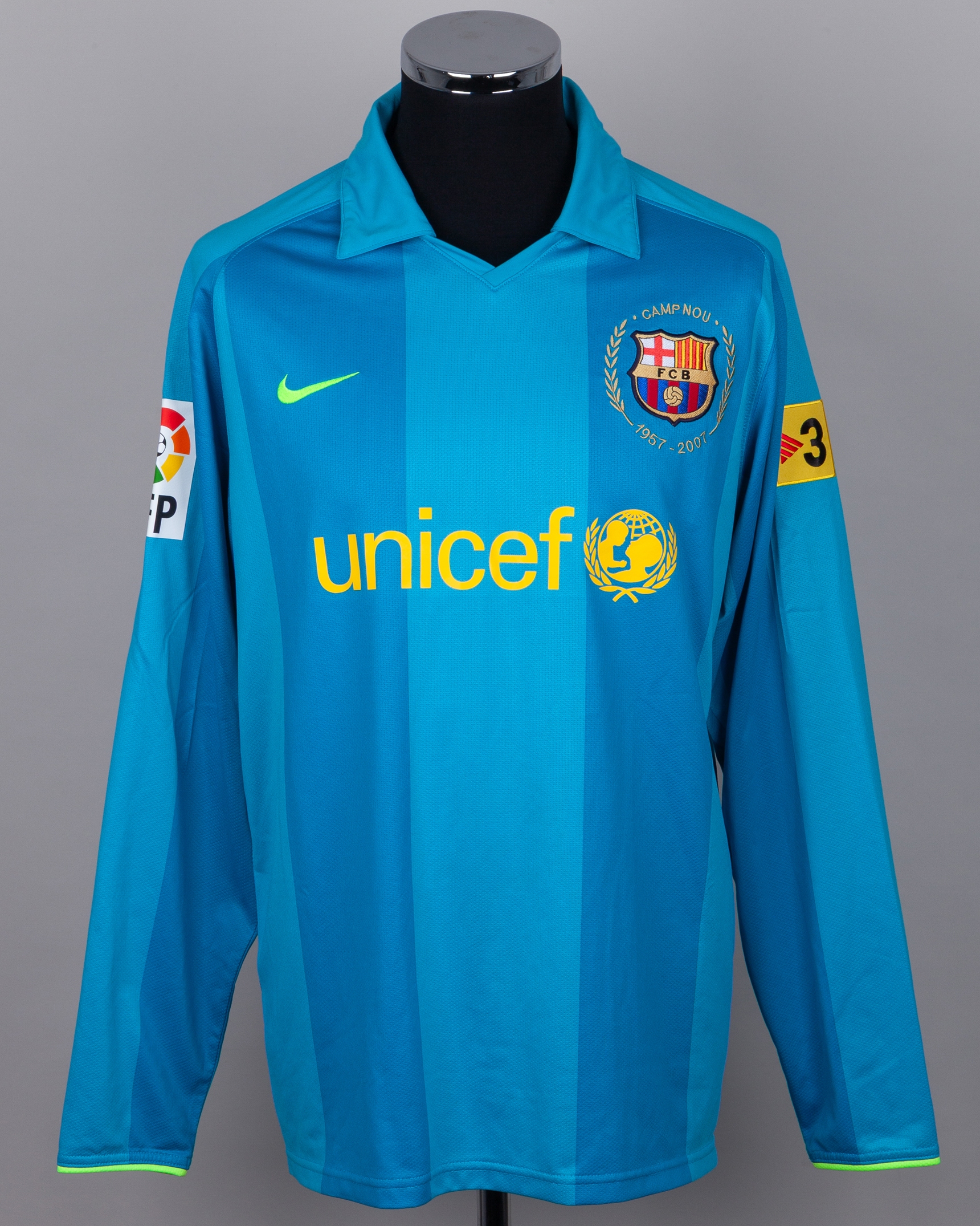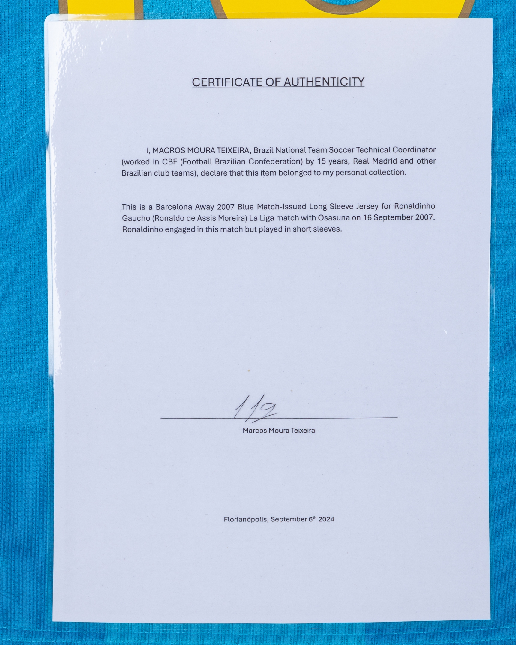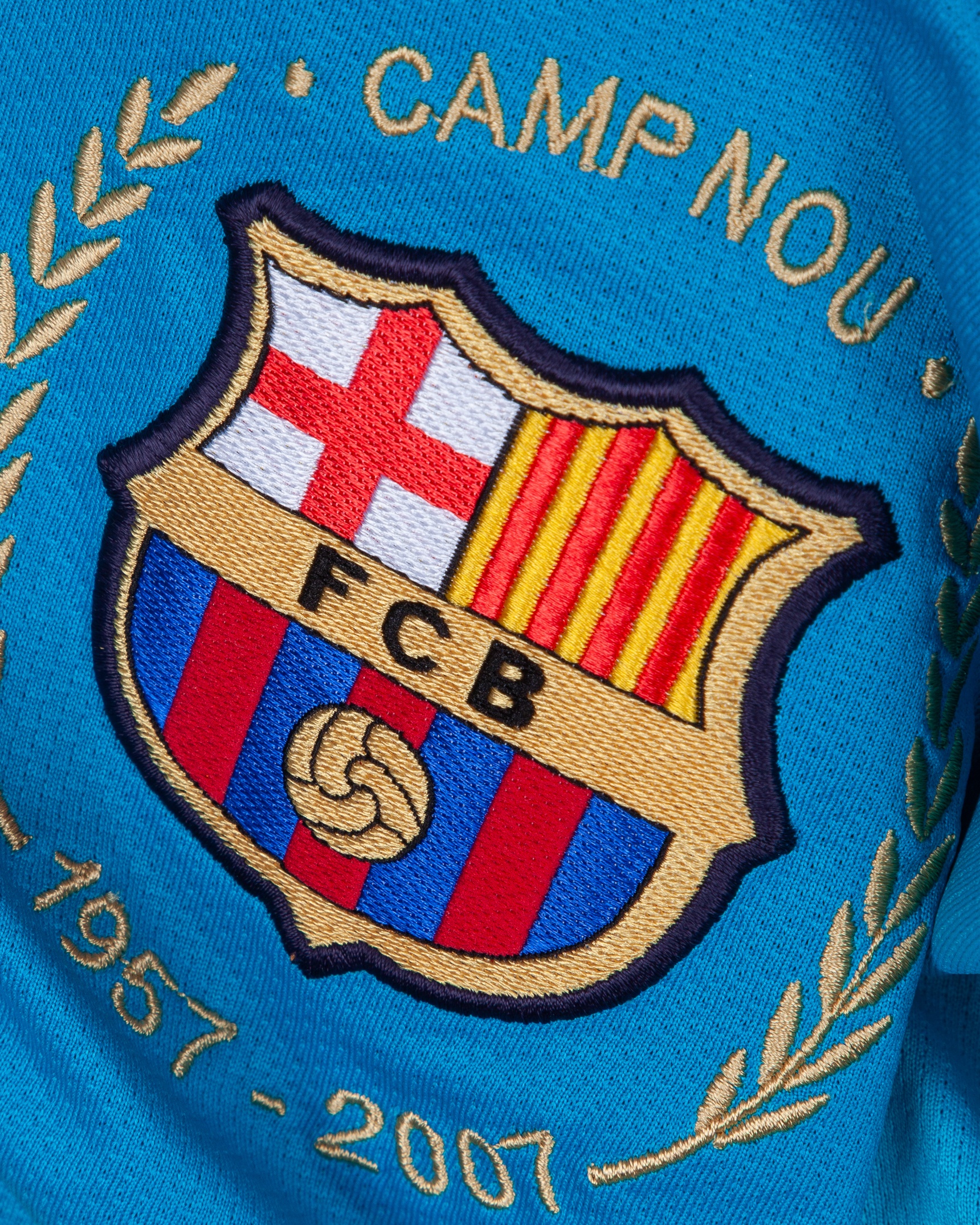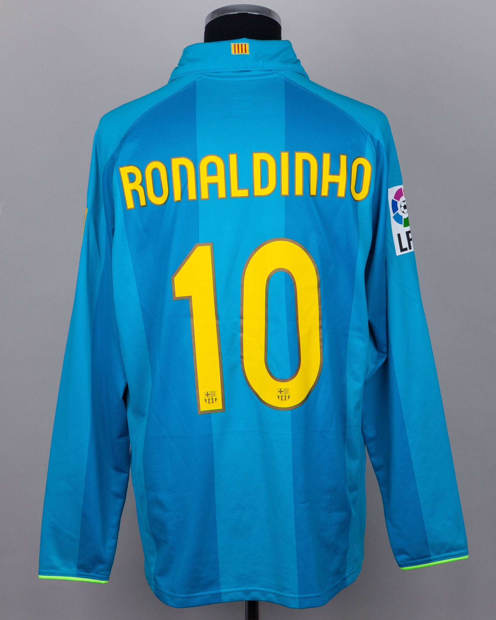 Ronaldinho blue No.10 Barcelona v. Osasuna long-sleeved shirt, 2007, Nike, L, with v-neck collar and embroidered cloth badge, inscribed FCB CAMP NOU 1957-2007, the reverse lettered RONALDINHO, the left sleeve with LFP flash and the left sleeve with TV3 flash, with COA