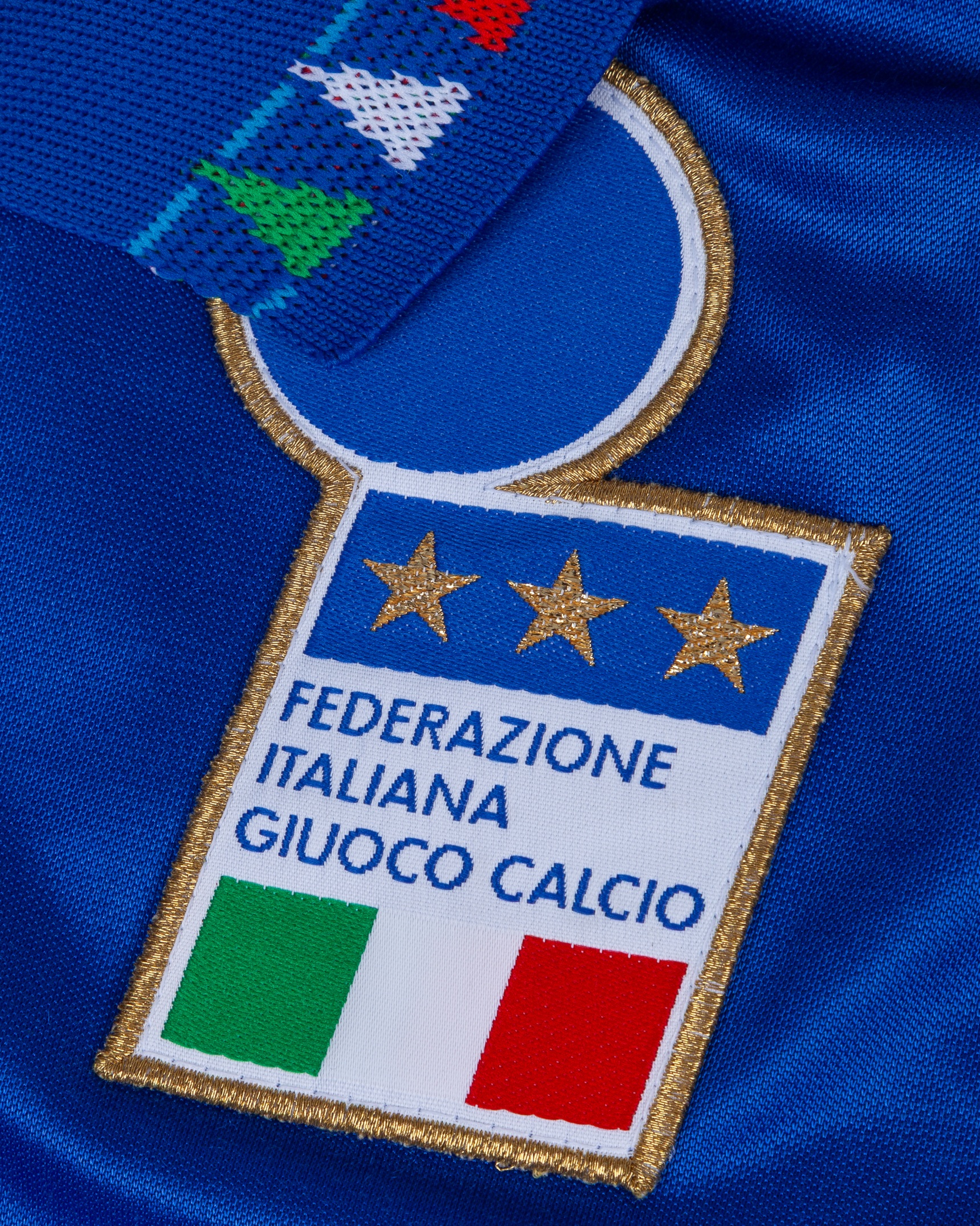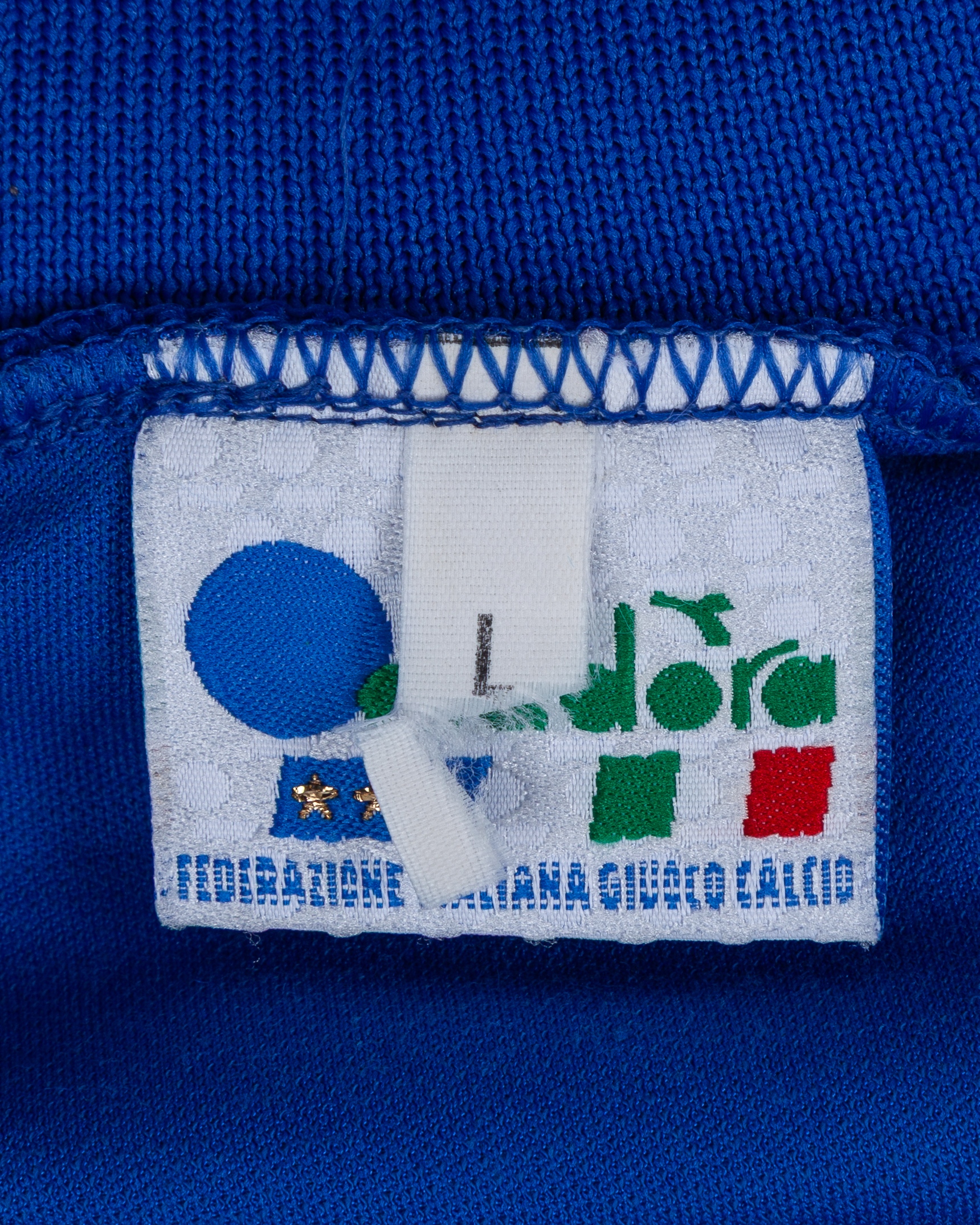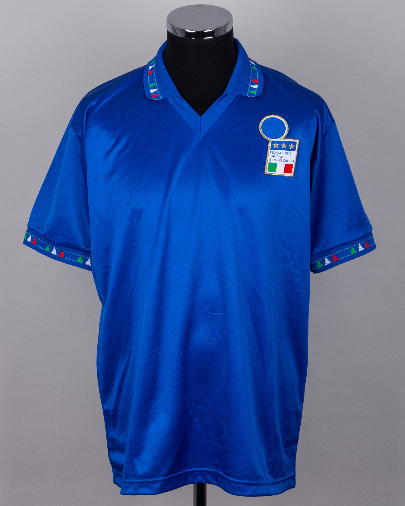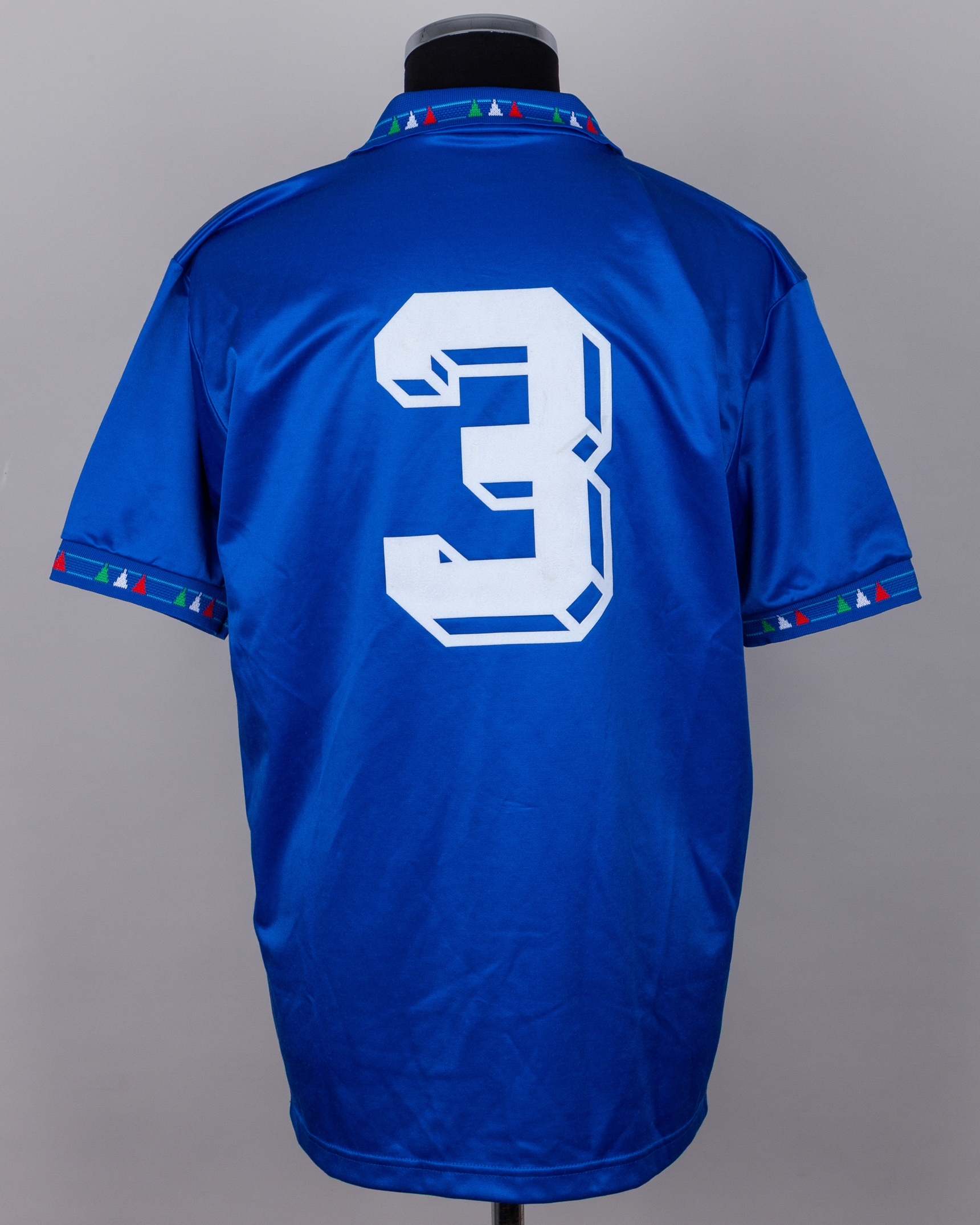 Paolo Maldini blue No.3 Italy v. Switzerland match worn short-sleeved shirt, 1993, Diadora, L, with V-neck collar and embroidered cloth badge inscribed FEDERAZIONE ITALIANA GIUOCO CALCIO