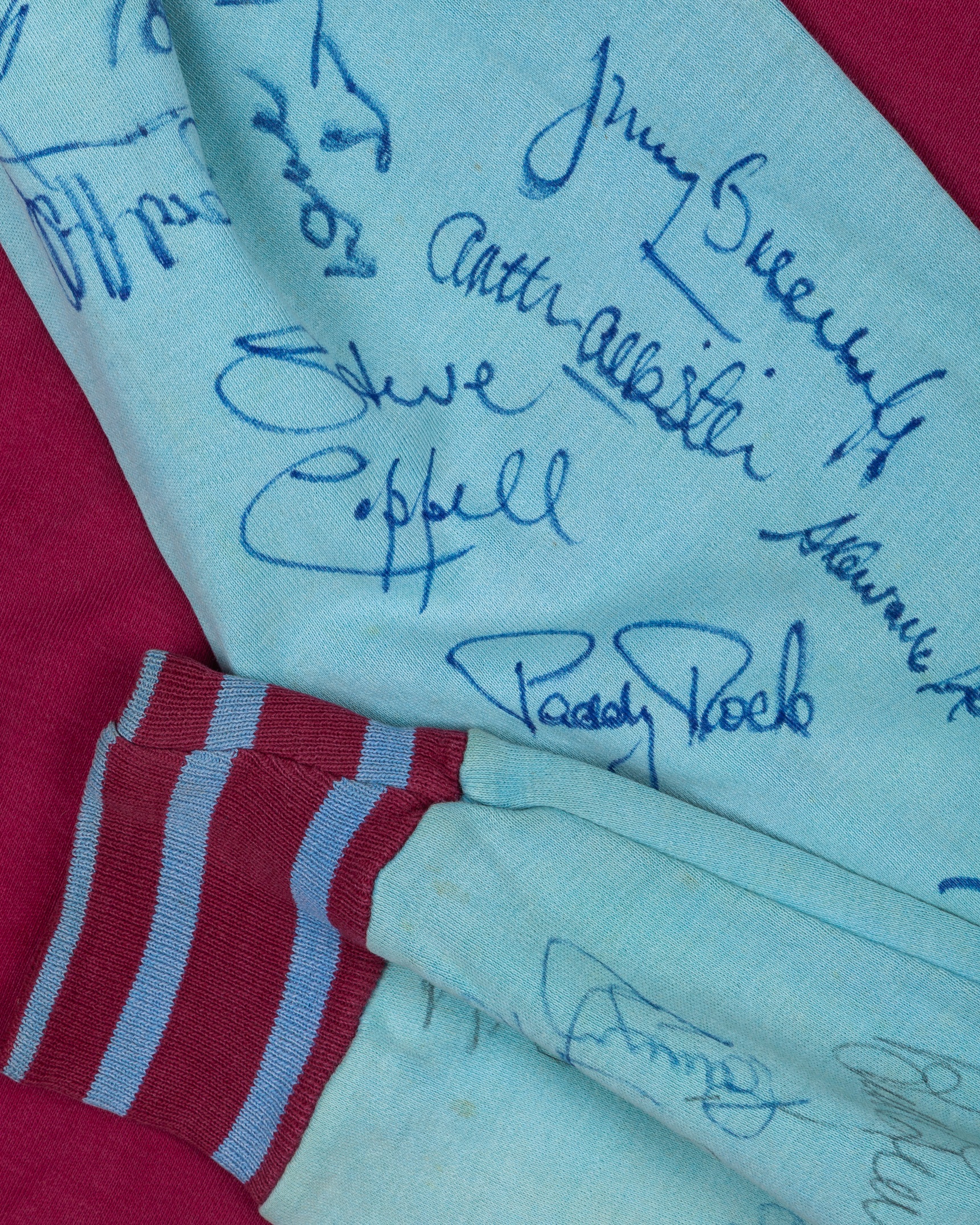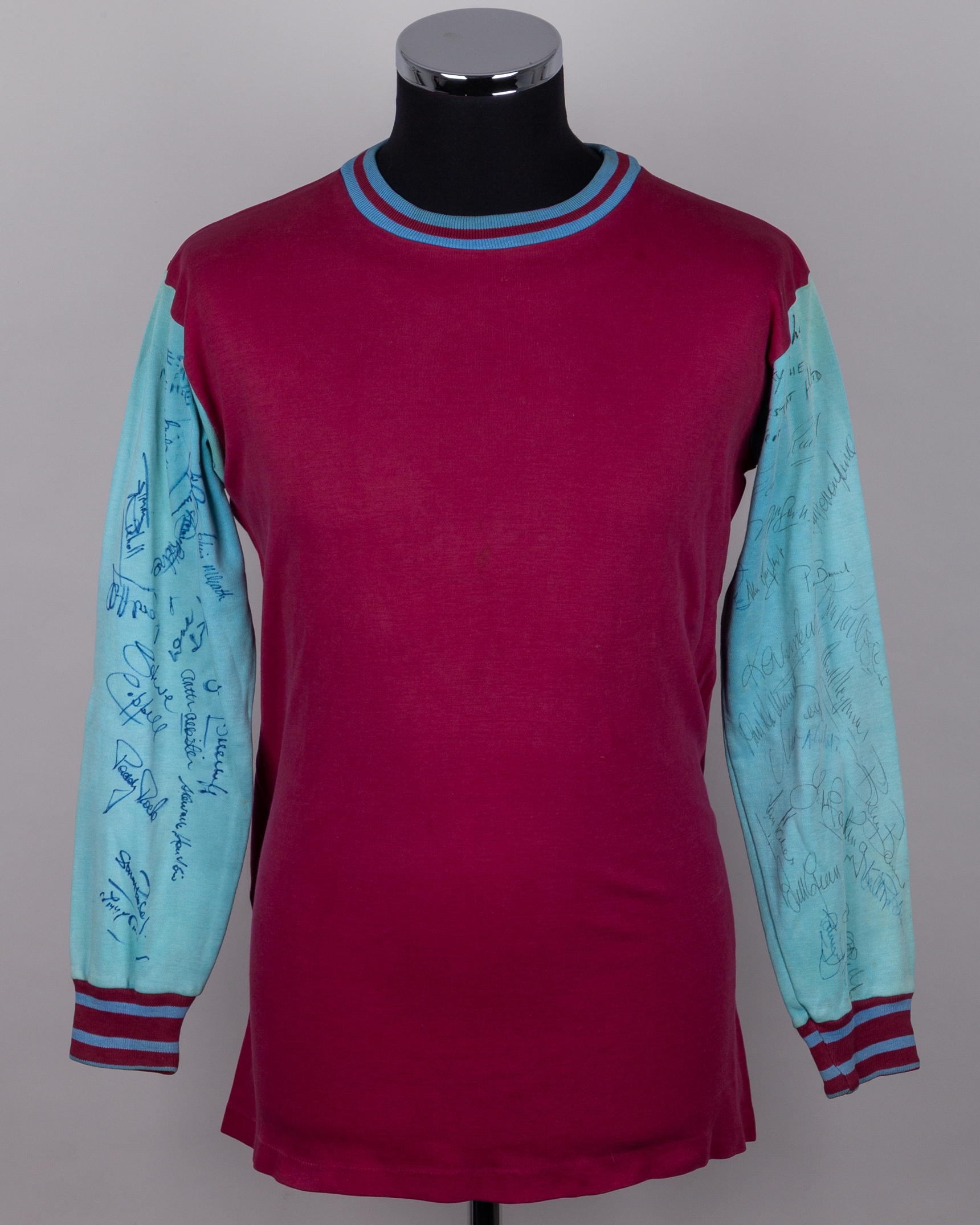 Claret and blue No.9 West Ham United long-sleeved shirt, Bukta, 40, with crew-neck collar, mid 1970s, the left sleeve bearing nineteen West Ham United autographs including John Radford, Trevor Brooking, Billy Bonds etc, the right sleeve bearing fourteen Manchester United autographs including Steve Coppell, Arthur Albiston, Jimmy Nicholl, Paddy Roche etc