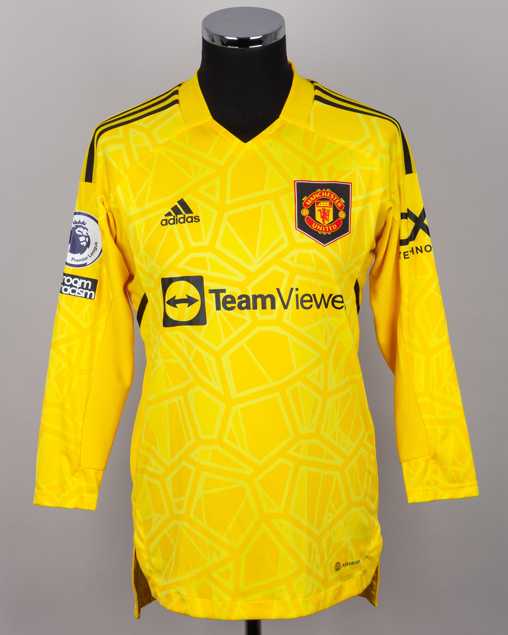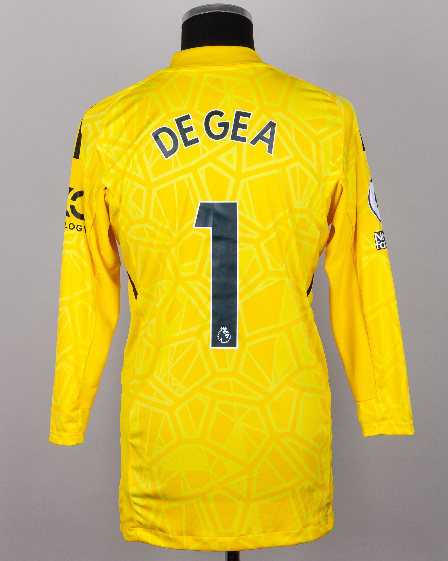 David De Gea yellow No.1 Manchester United goalkeeper shirt, 2022-23, Adidas, S, with v-neck collar and printed badge, the reverse lettered DE GEA, the right sleeve with Premier League flash