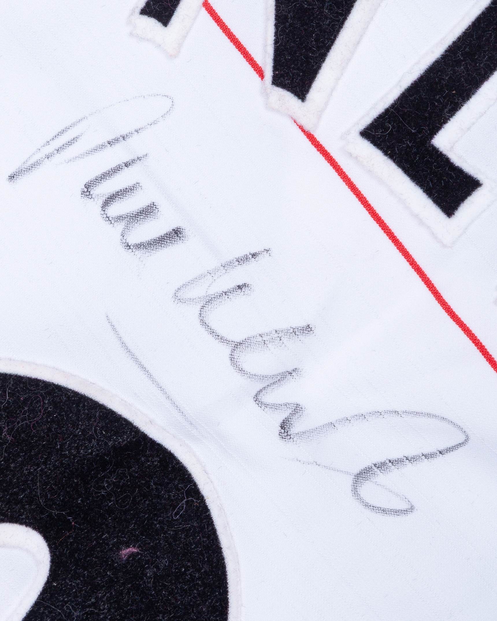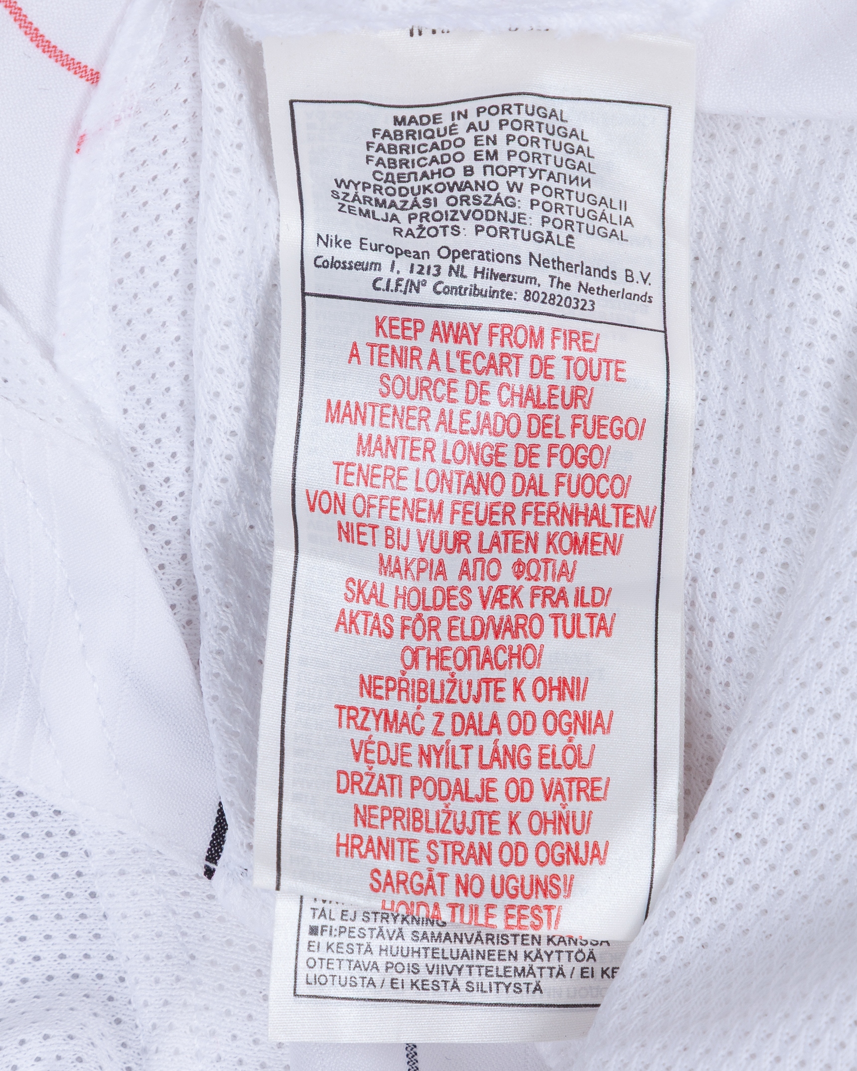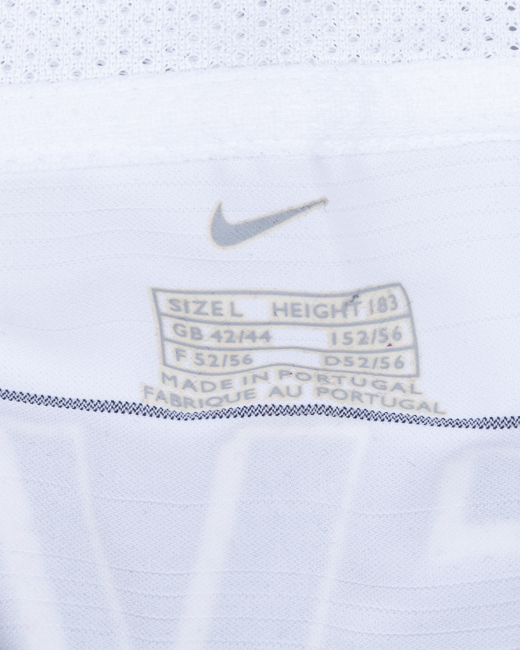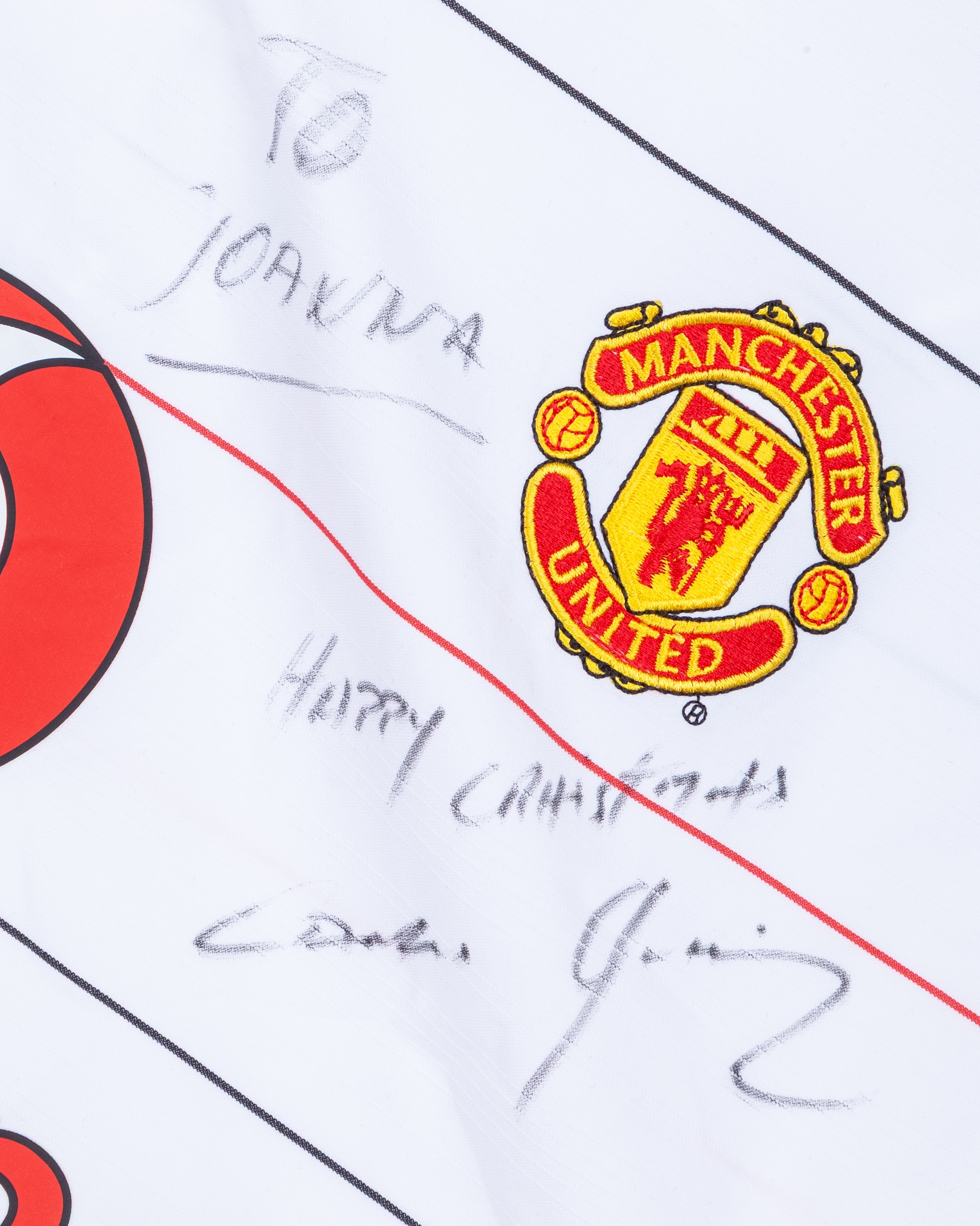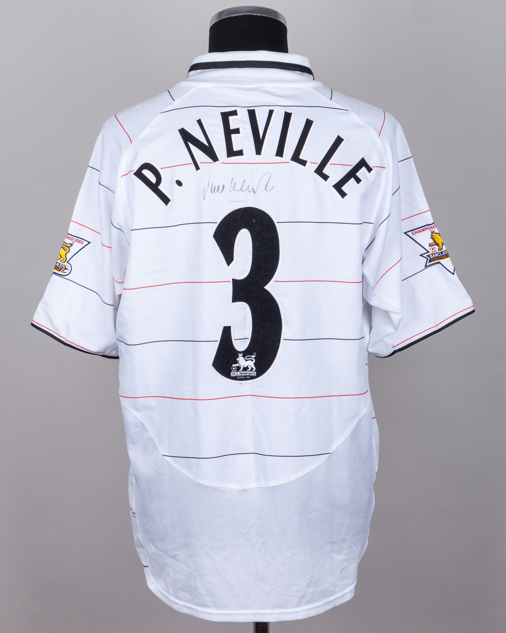 Phil Neville white, red and black No.3 Manchester United autographed short-sleeved shirt, 2003-04, Nike, L, with v-neck collar and embroidered badge inscribed MANCHESTER UNITED, the front dedicated to Joanna and signed, the reverse lettered P. NEVILLE and signed by Phil, the sleeves with Champions 2002-2003 Barclays card Premiership flashes