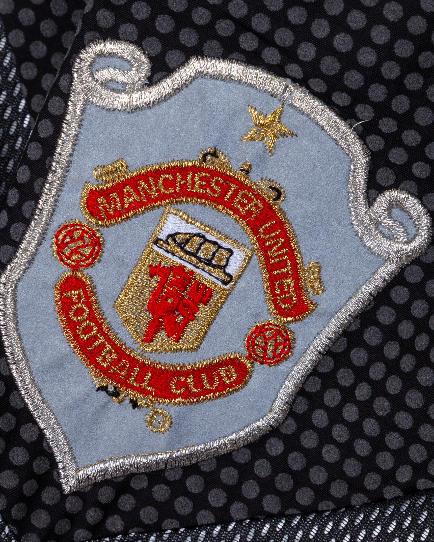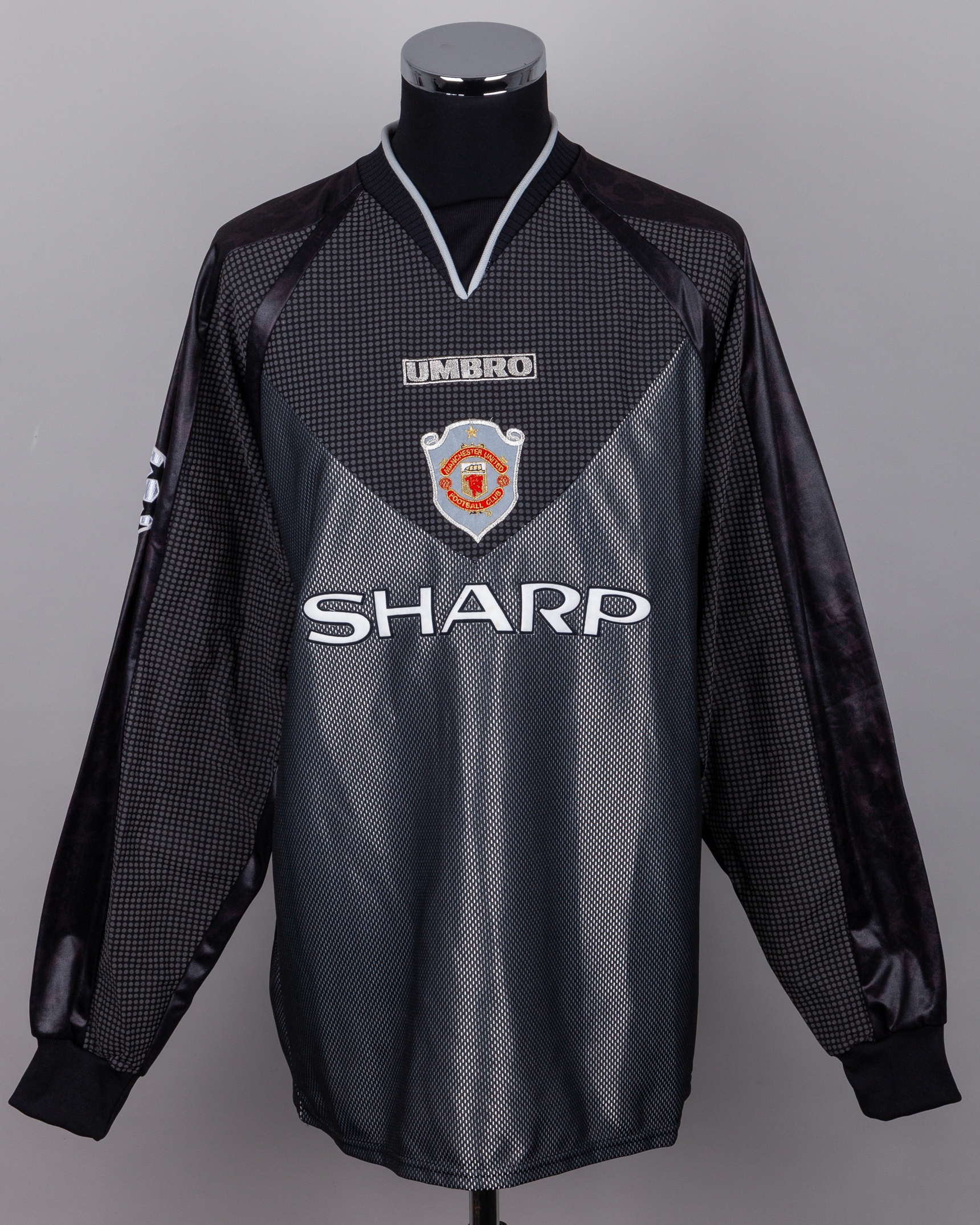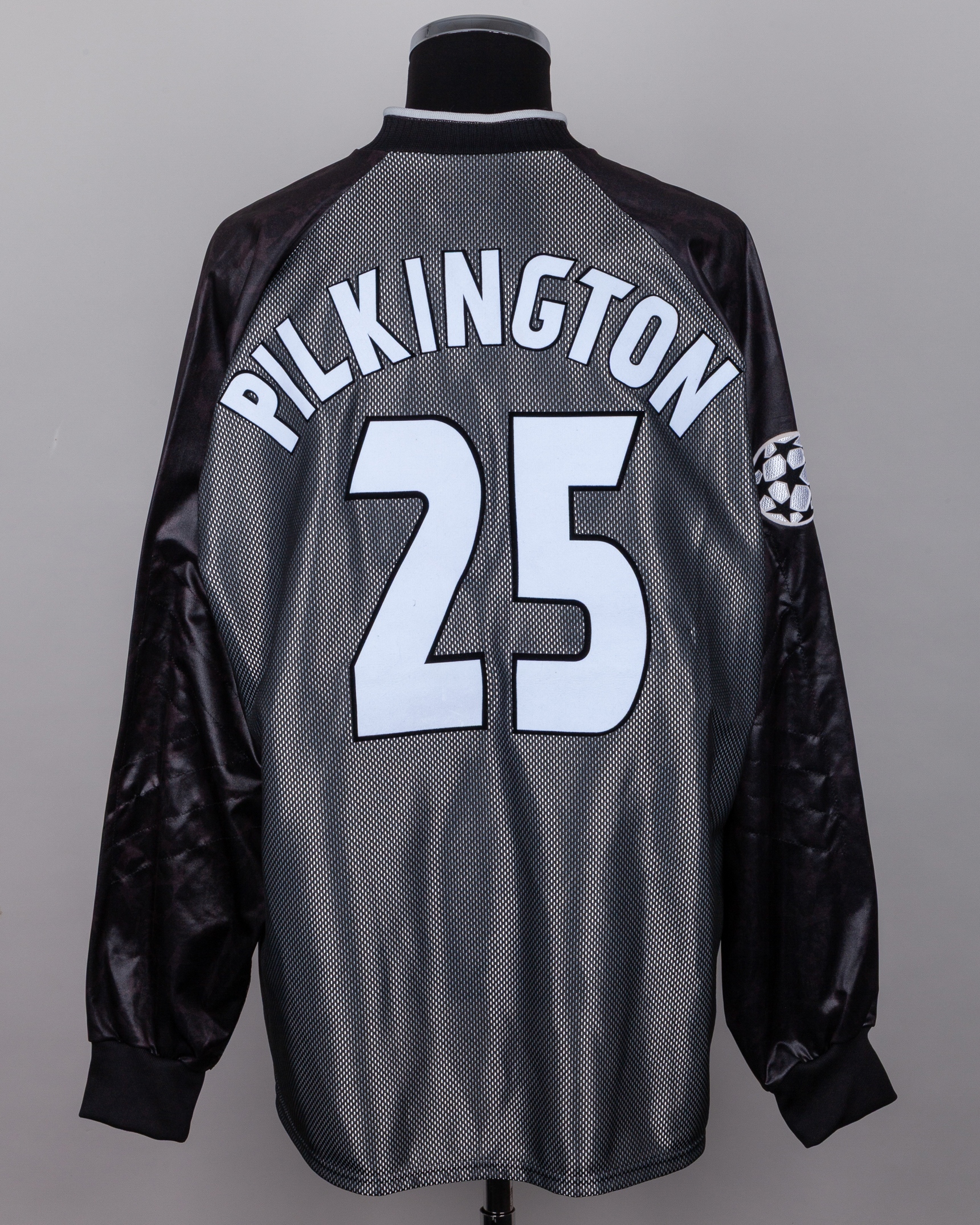 Kevin Pilkington black No.25 Manchester United goalkeeper shirt, 1997-99, Umbro, XXL, with v-neck style collar and embroidered cloth badge inscribed MANCHESTER UNITED FOOTBALL CLUB, the reverse lettered PILKINGTON, the right sleeve with Champions League flash