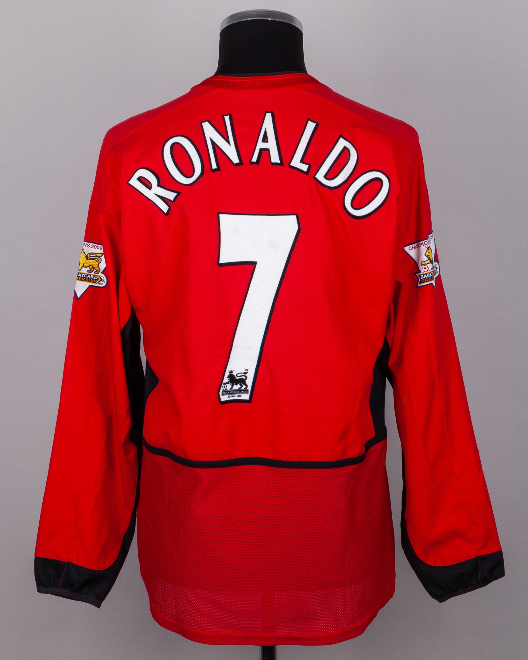 Cristiano Ronaldo red and black No.7 Manchester United long-sleeved shirt, 2003-04, Nike, M, with v-neck collar and embroidered badge inscribed MANCHESTER UNITED, the reverse lettered RONALDO, the sleeves with Barclays Premiership flashes, the sleeves with Champions 2002-2003 Barclays Premiership flashes