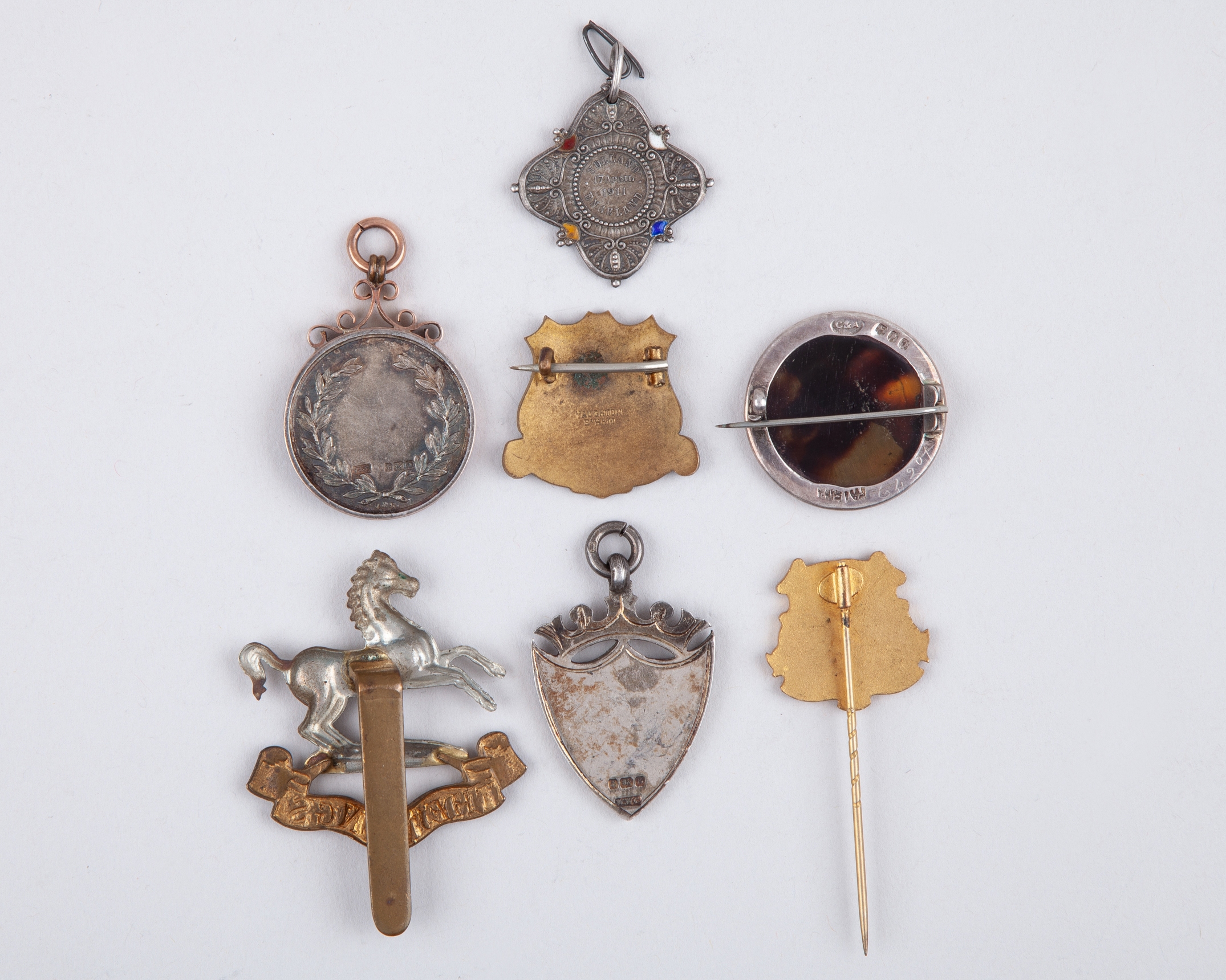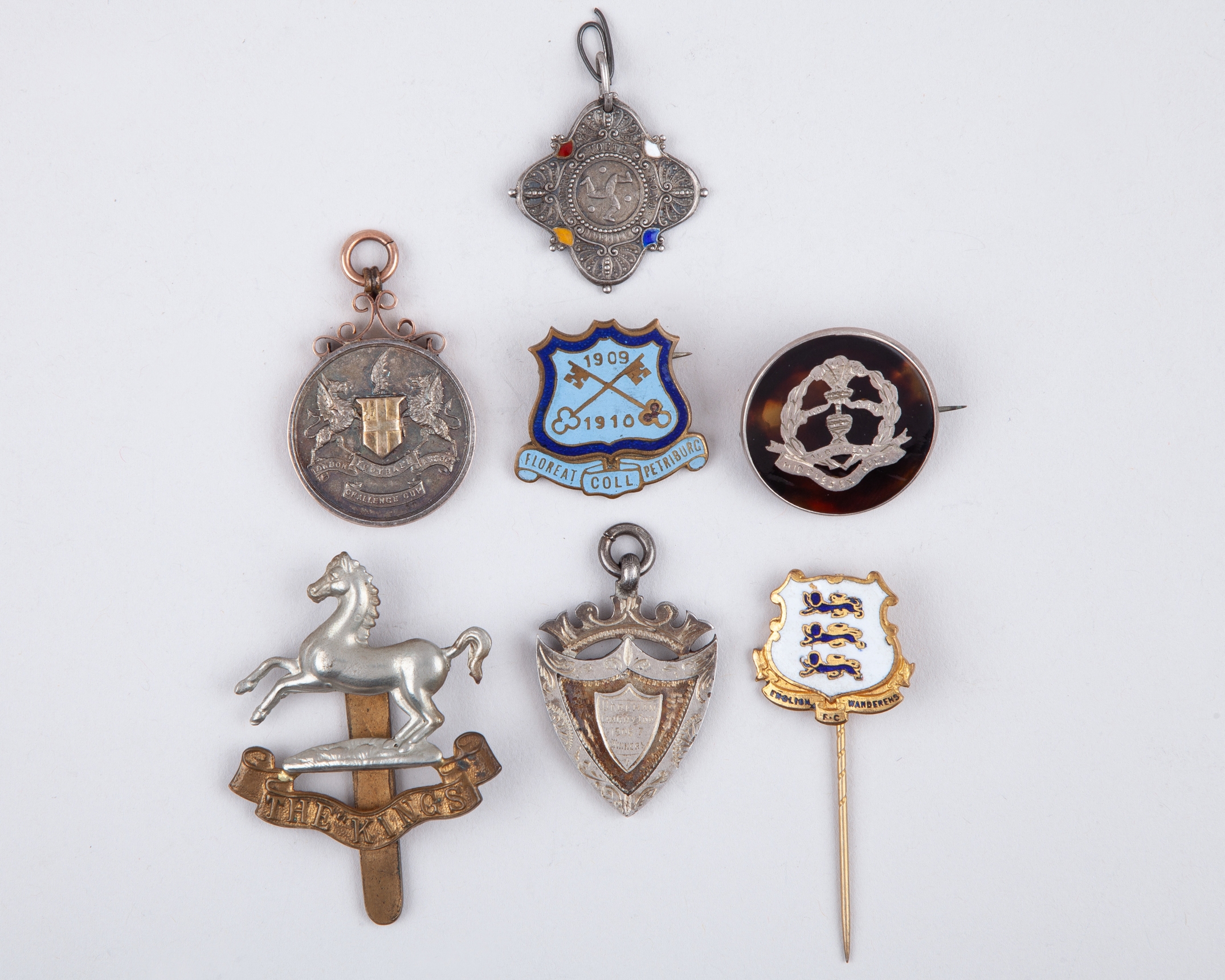 Joseph Dines silver London Football Challenge Cup Runners-up medal, silver and enamel Holland v. England medal, 17th April 1911, silver Dereham Charity Cup winners medal 1906-07, English Wanderers enamel lapel badge, another lapel badge, 1909-1910, silver Middlesex Regiment badge and The Kings Liverpool Regiment badge (7)