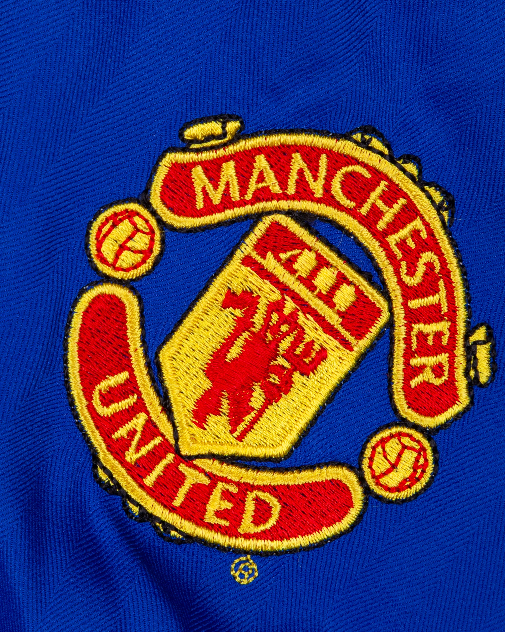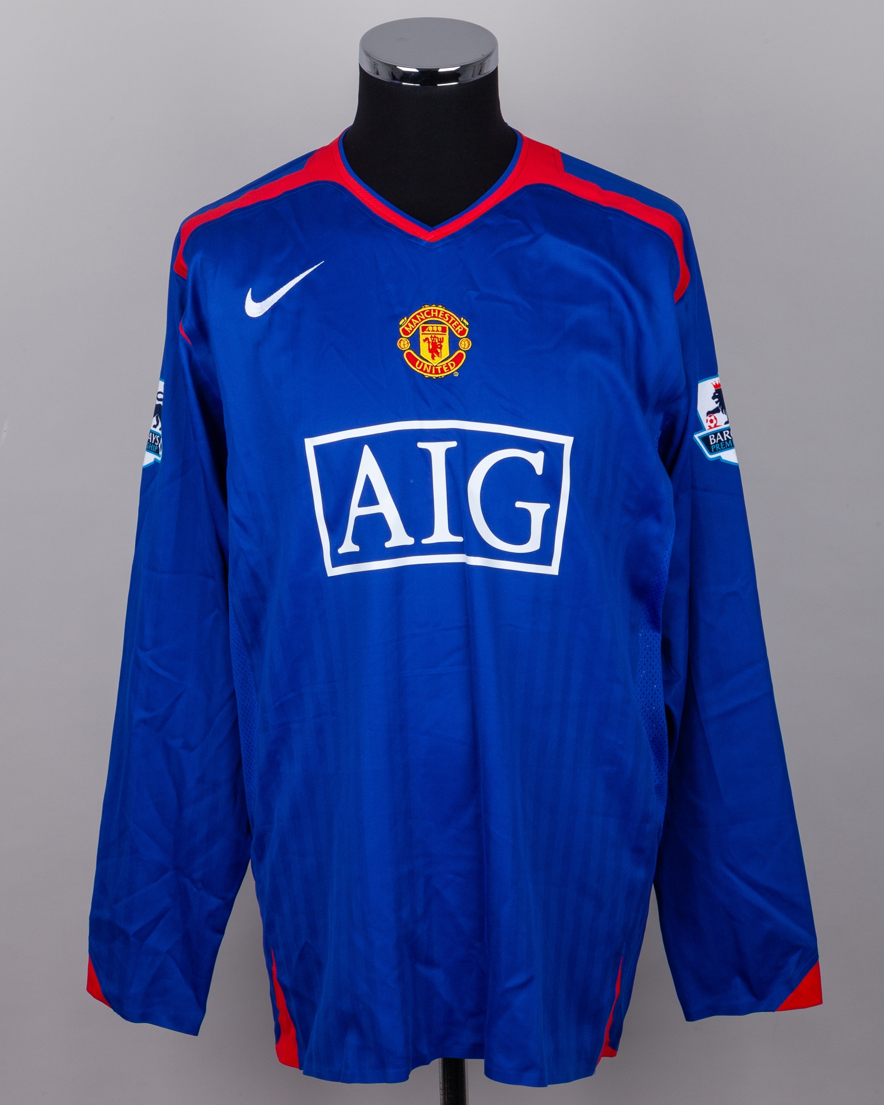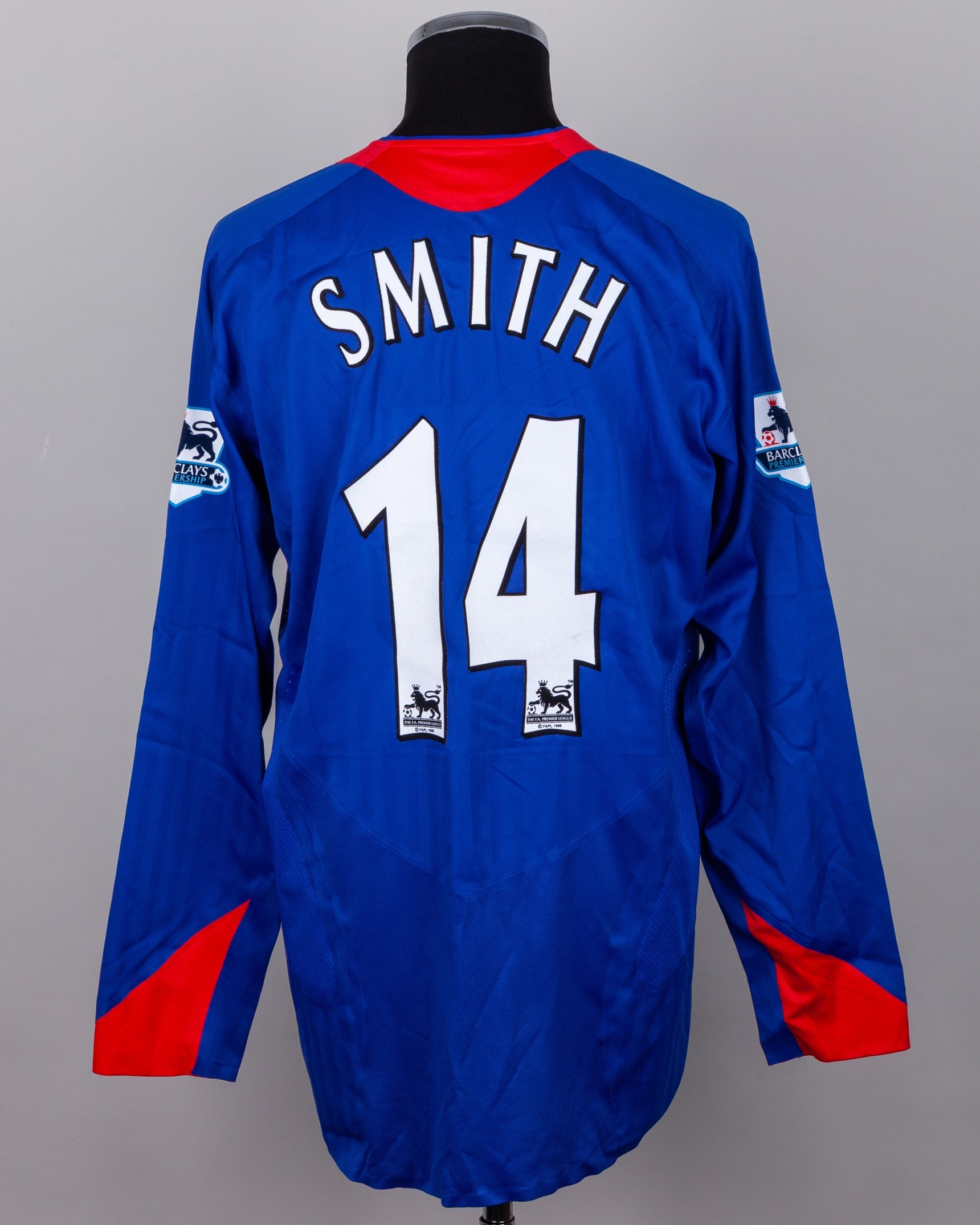 Alan Smith blue and red No.14 Manchester United long-sleeved shirt, 2005-06, Nike, XL, with v-neck collar and embroidered badge inscribed MANCHESTER UNITED, the reverse lettered SMITH, the sleeves with Barclays Premiership flashes