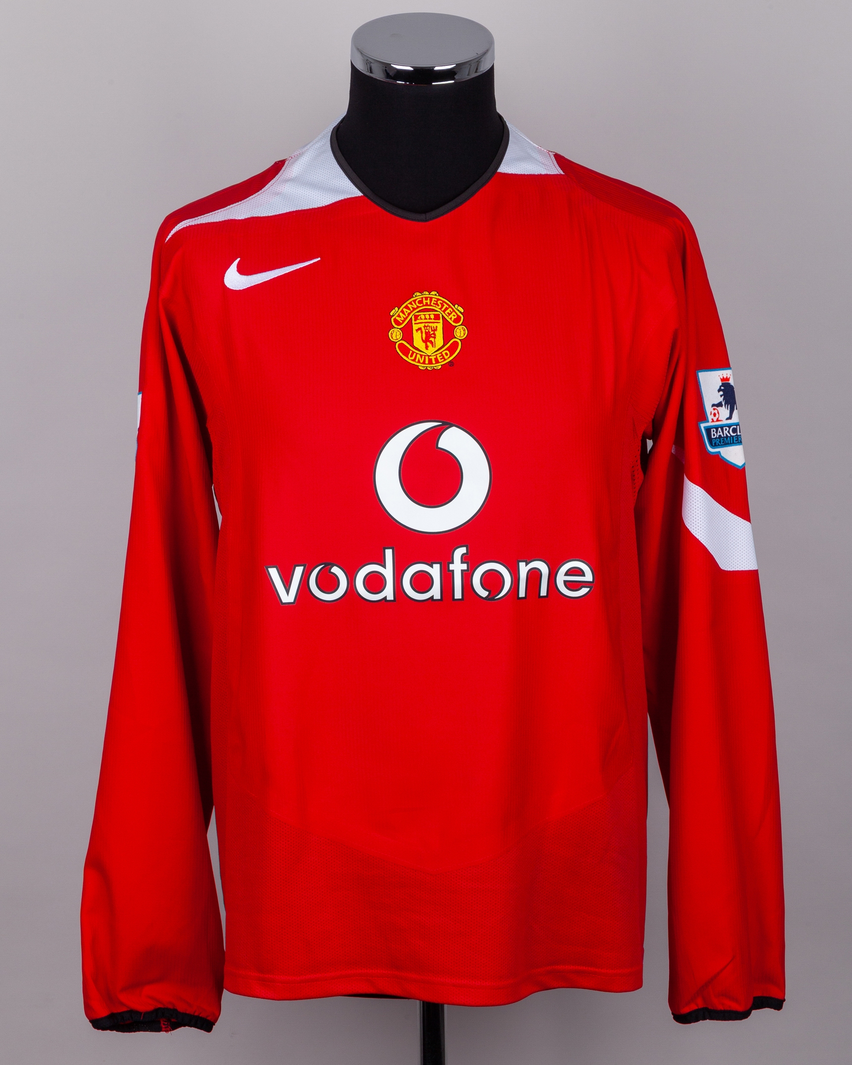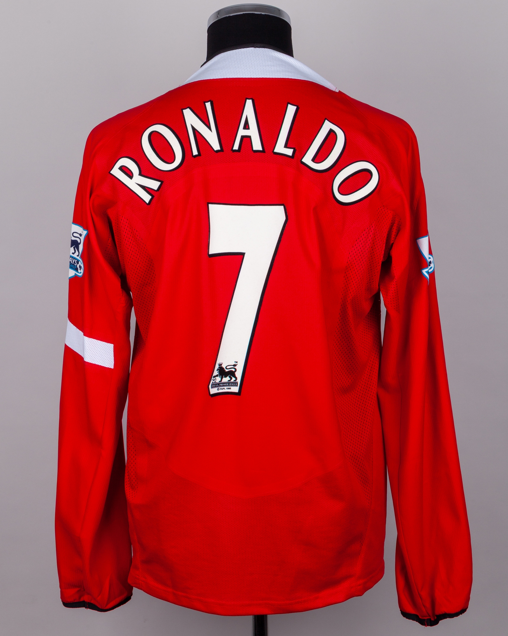 Cristiano Ronaldo red and white No.7 Manchester United long-sleeved shirt, 2004-06, Nike, L, with v-neck collar and embroidered badge inscribed MANCHESTER UNITED, the reverse lettered RONALDO, the sleeves with Barclays Premiership flashes