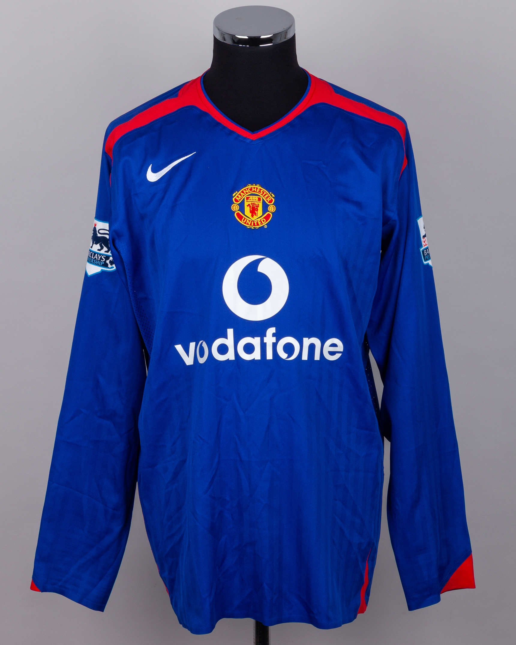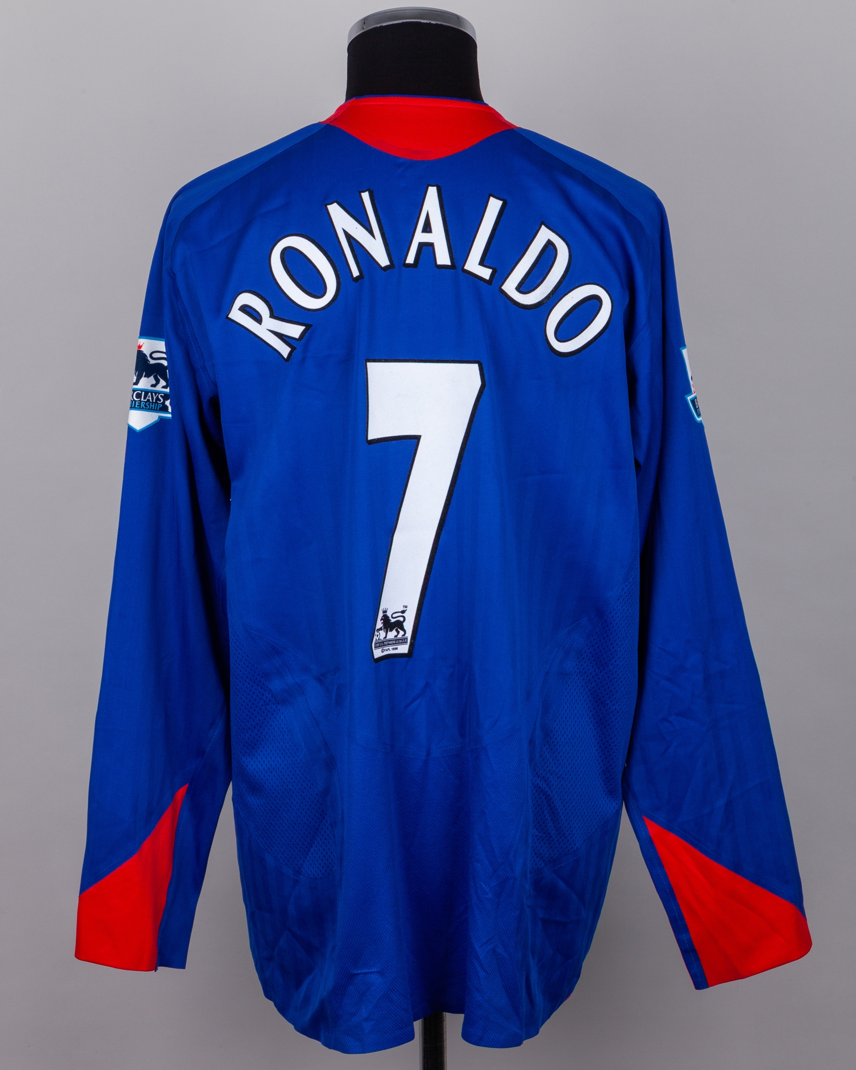 Cristiano Ronaldo blue and red No.7 Manchester United long-sleeved shirt, 2005-06, Nike, XL, with v-neck collar and embroidered badge inscribed MANCHESTER UNITED, the reverse lettered RONALDO, the right sleeves with Barclays Premiership flashes