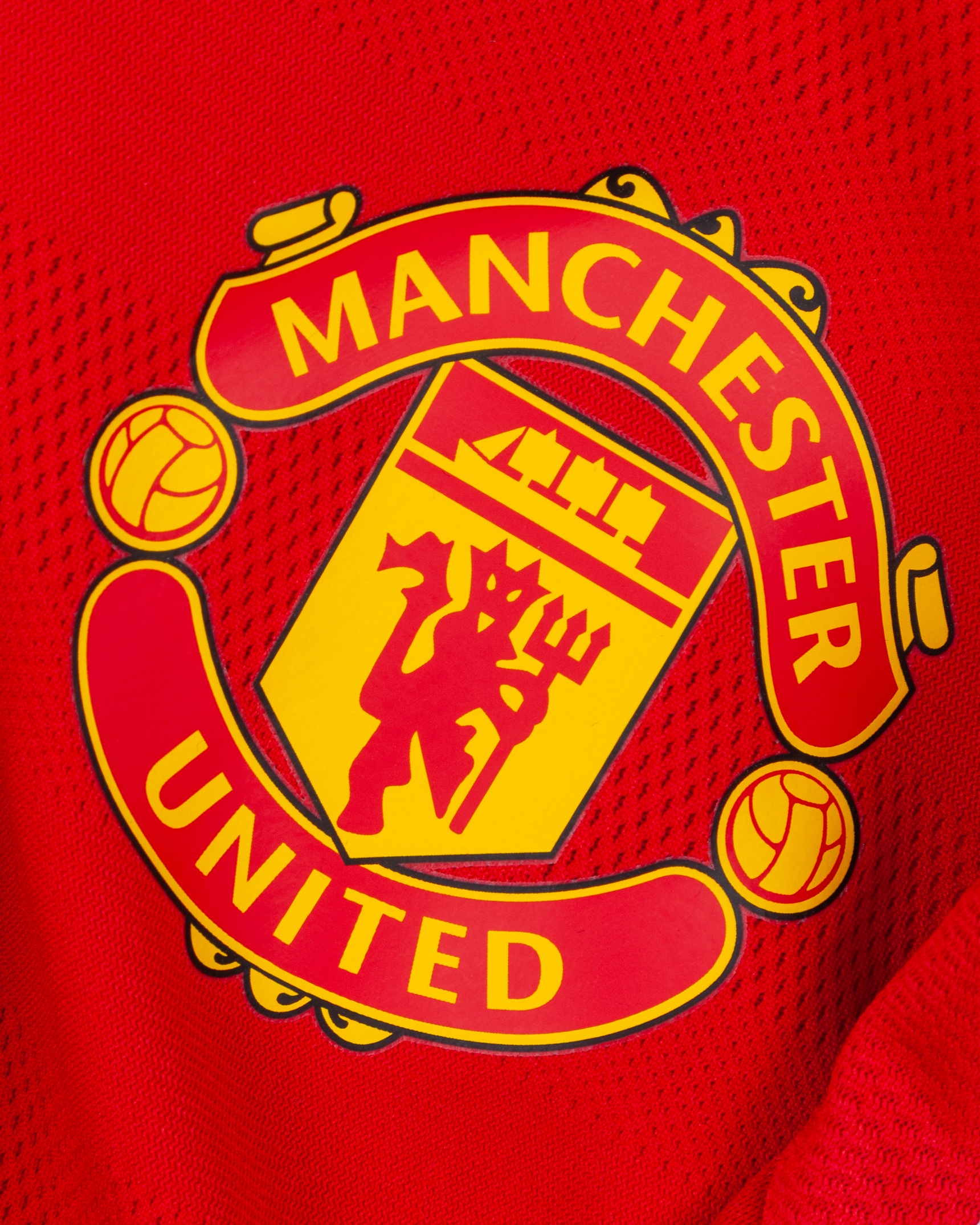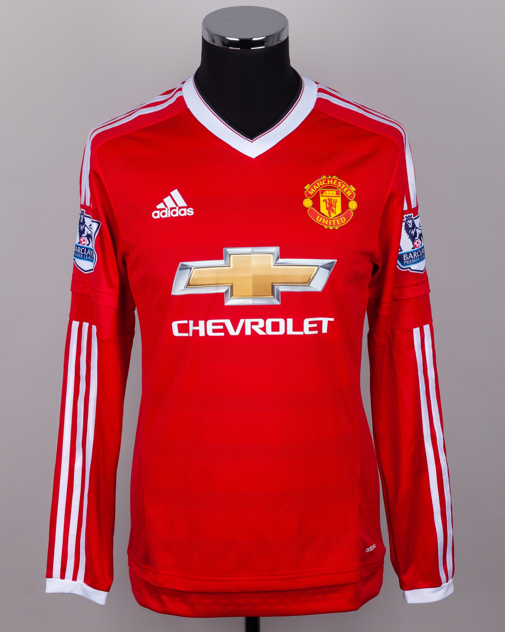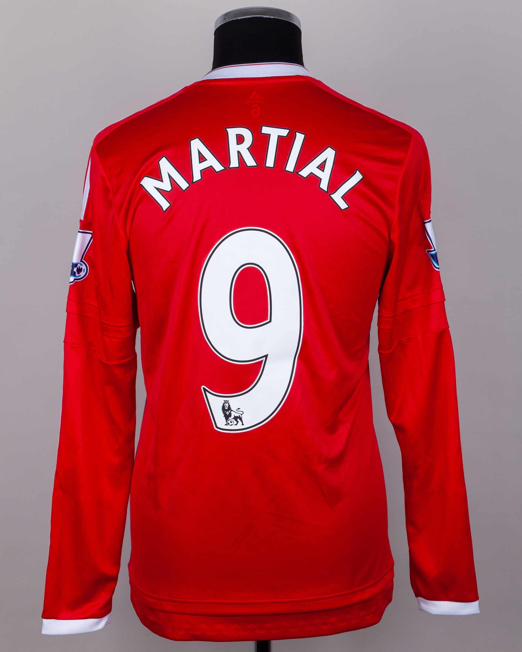 Anthony Martial red and white No.9 Manchester United long-sleeved shirt, 2015-16, 6, with v-neck collar and printed badge, the reverse lettered MARTIAL, the sleeves with Barclays Premier League flashes