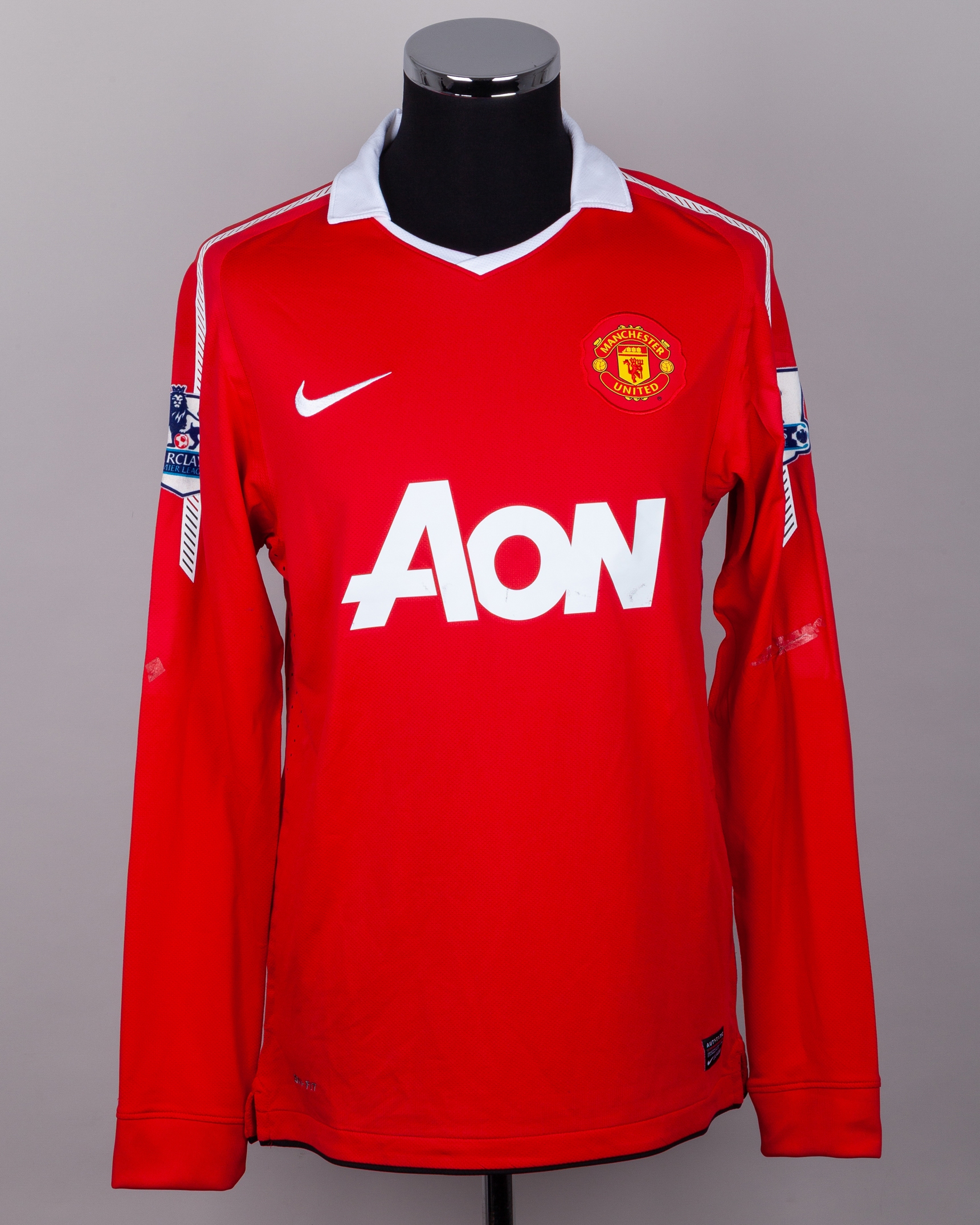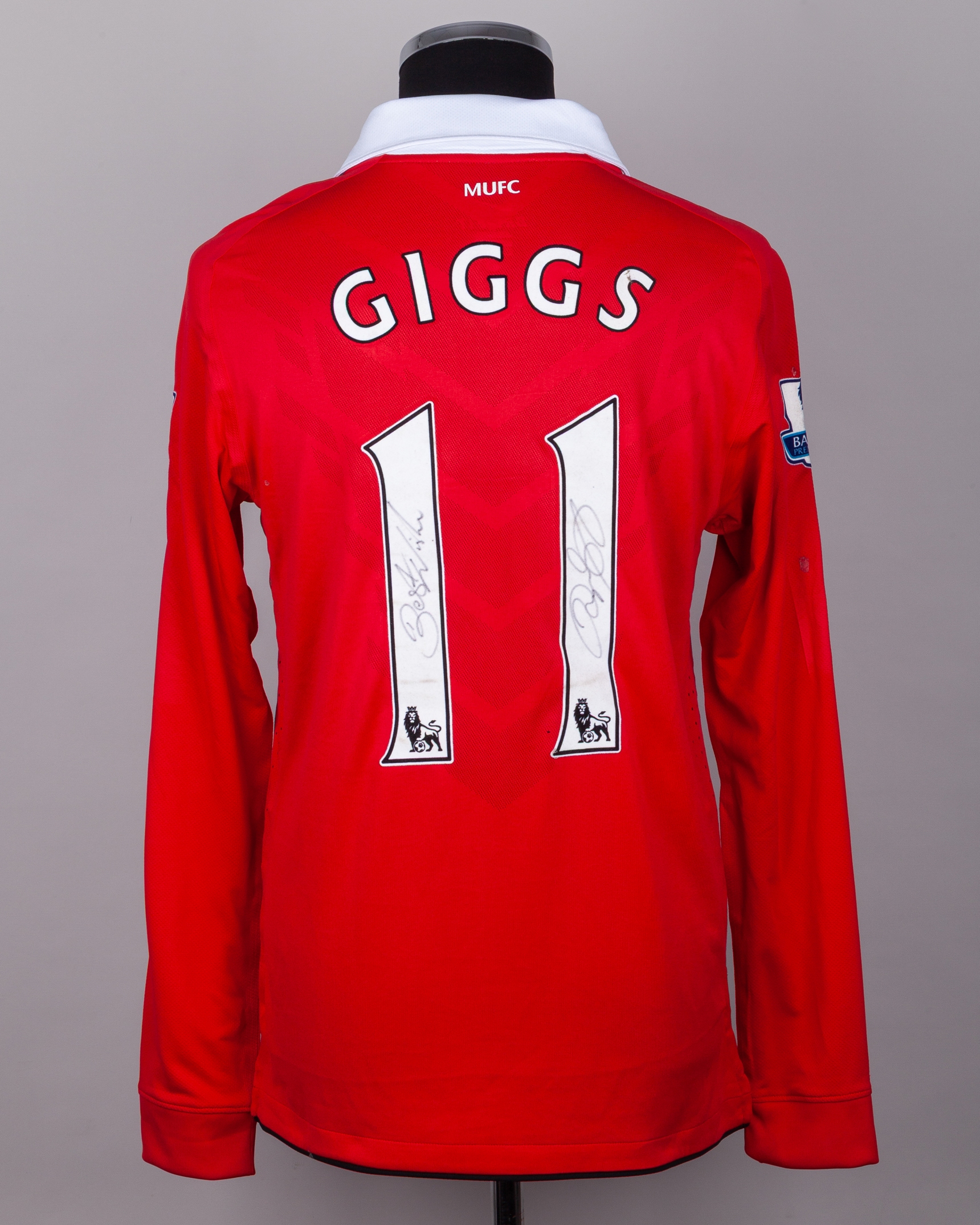 Ryan Giggs red and white No.11 Manchester United autographed long-sleeved shirt, 2010-11, Nike, M, with v-neck collar and embroidered cloth badge inscribed MANCHESTER UNITED, the reverse lettered GIGGS, the number autographed by Giggs, the sleeves with Barclays Premier League flashes