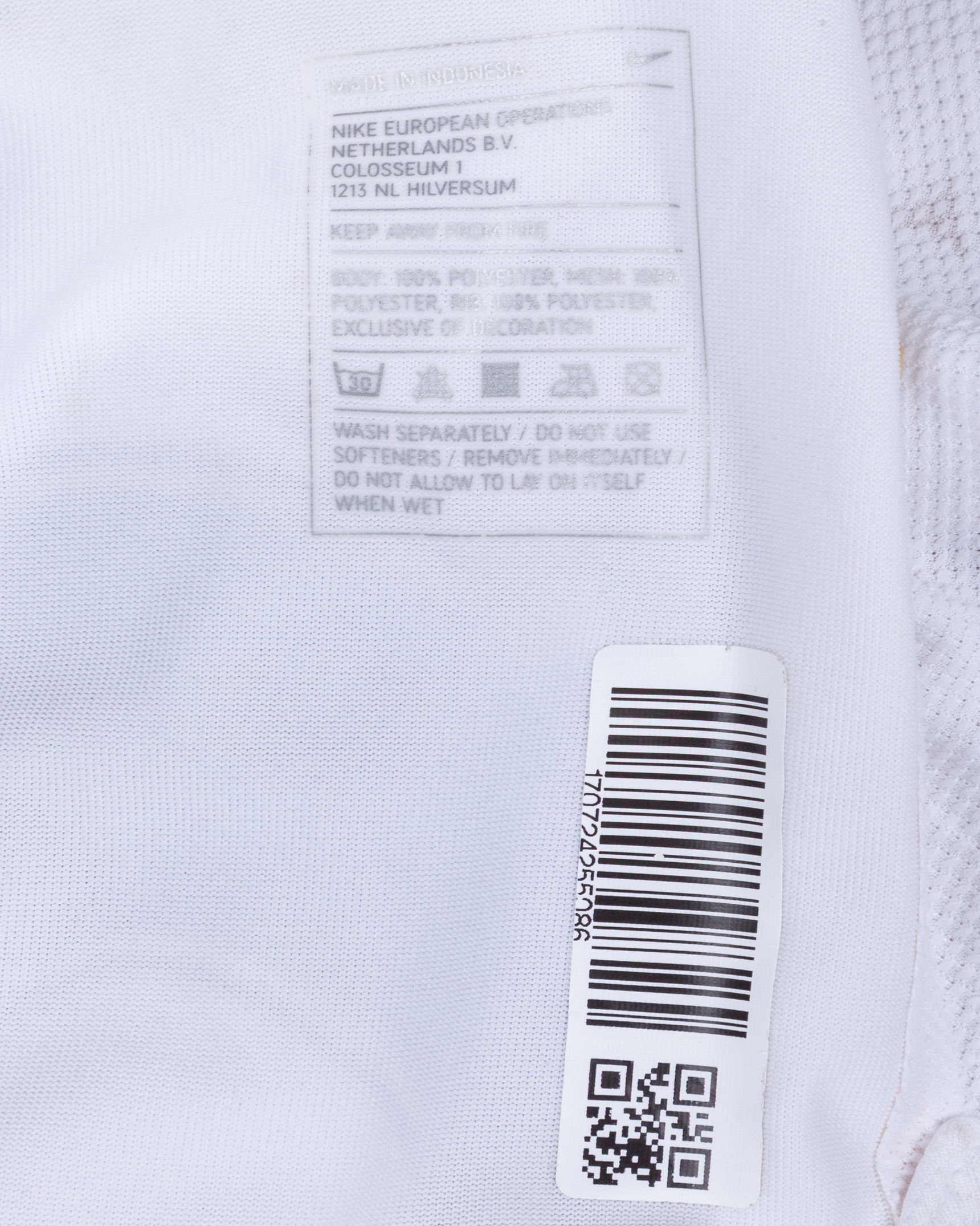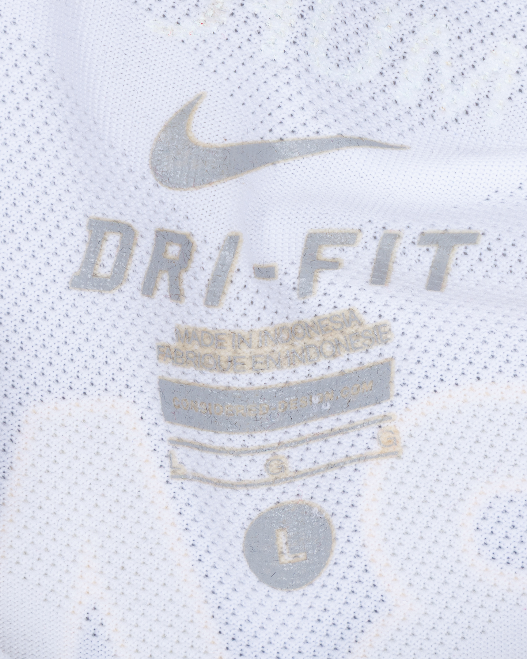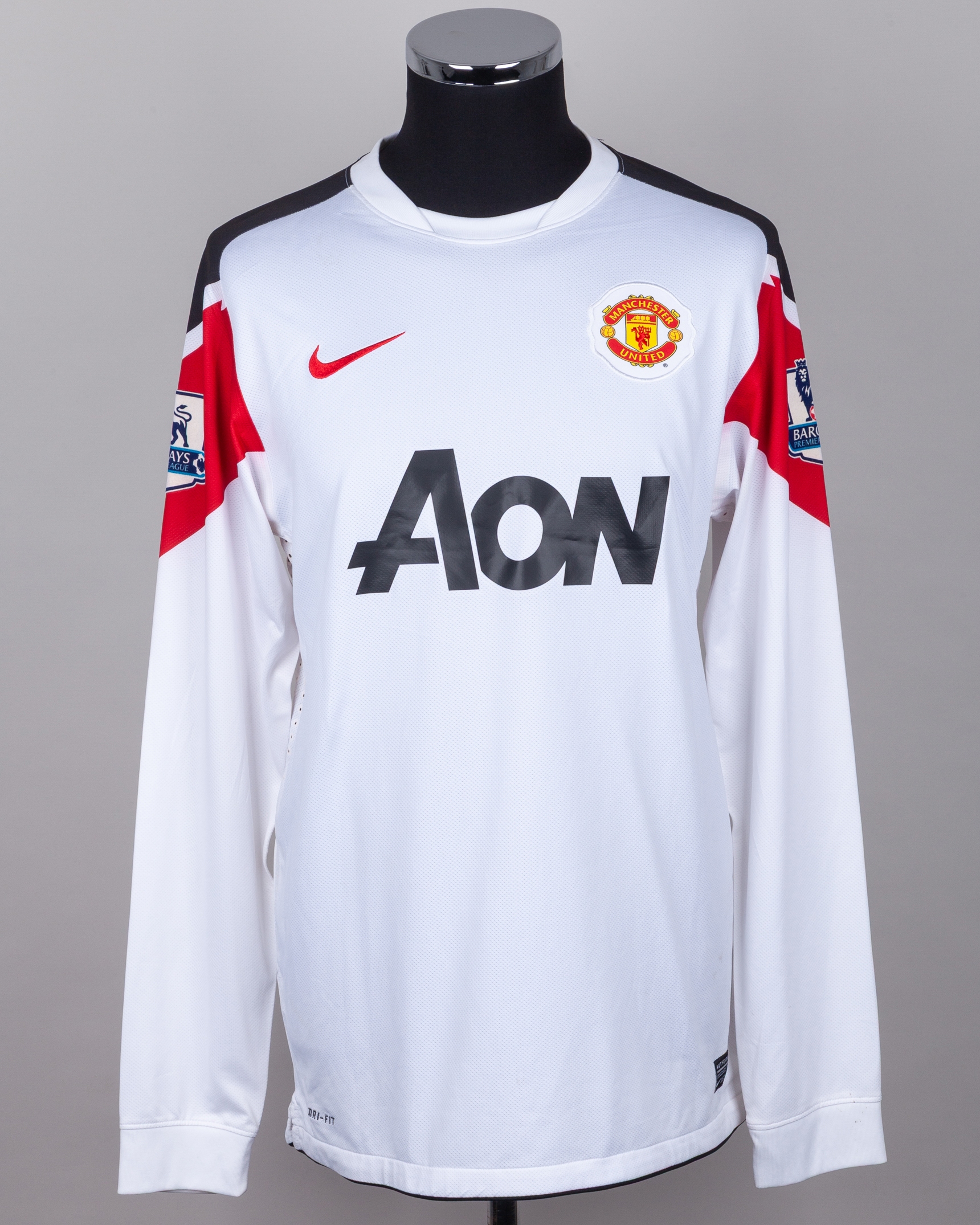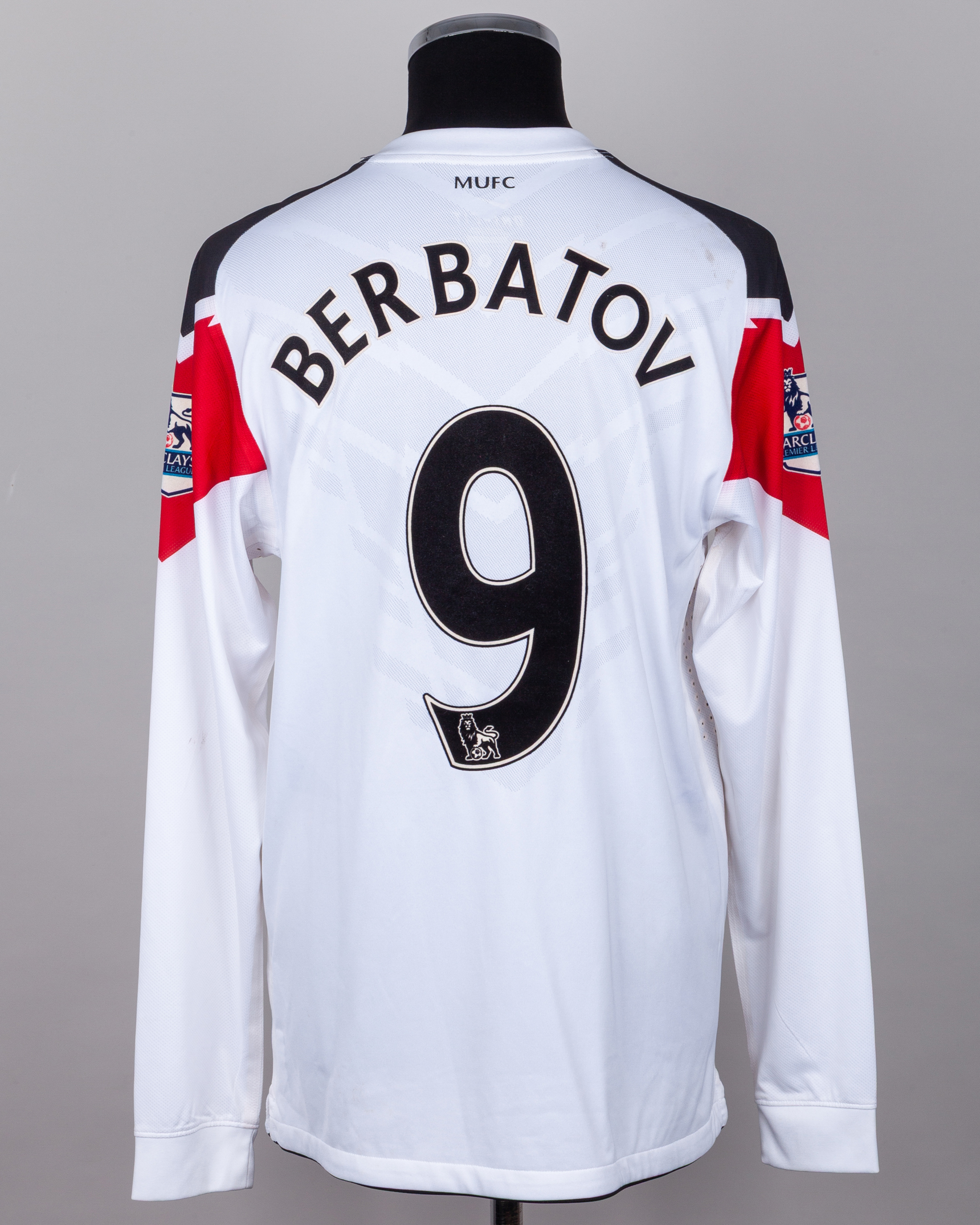 Dimitar Berbatov white No.9 Manchester United long-sleeved shirt, 2010-11, Nike, L, with crew-neck collar and embroidered cloth badge inscribed MANCHESTER UNITED, the reverse lettered BERBATOV, the sleeves with Barclays Premier League flashes, with staining