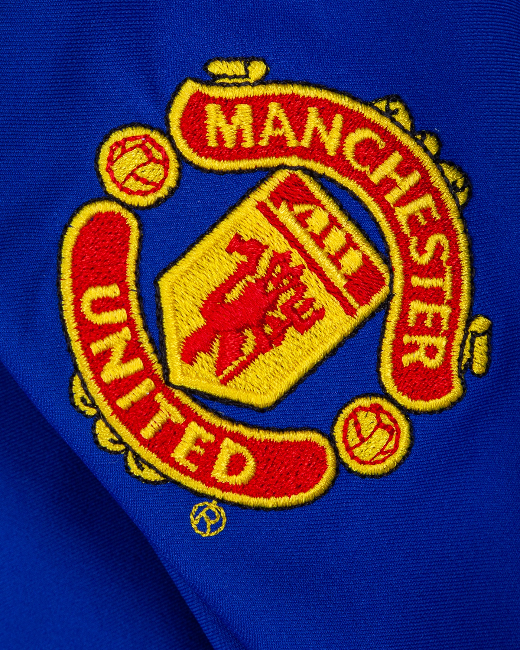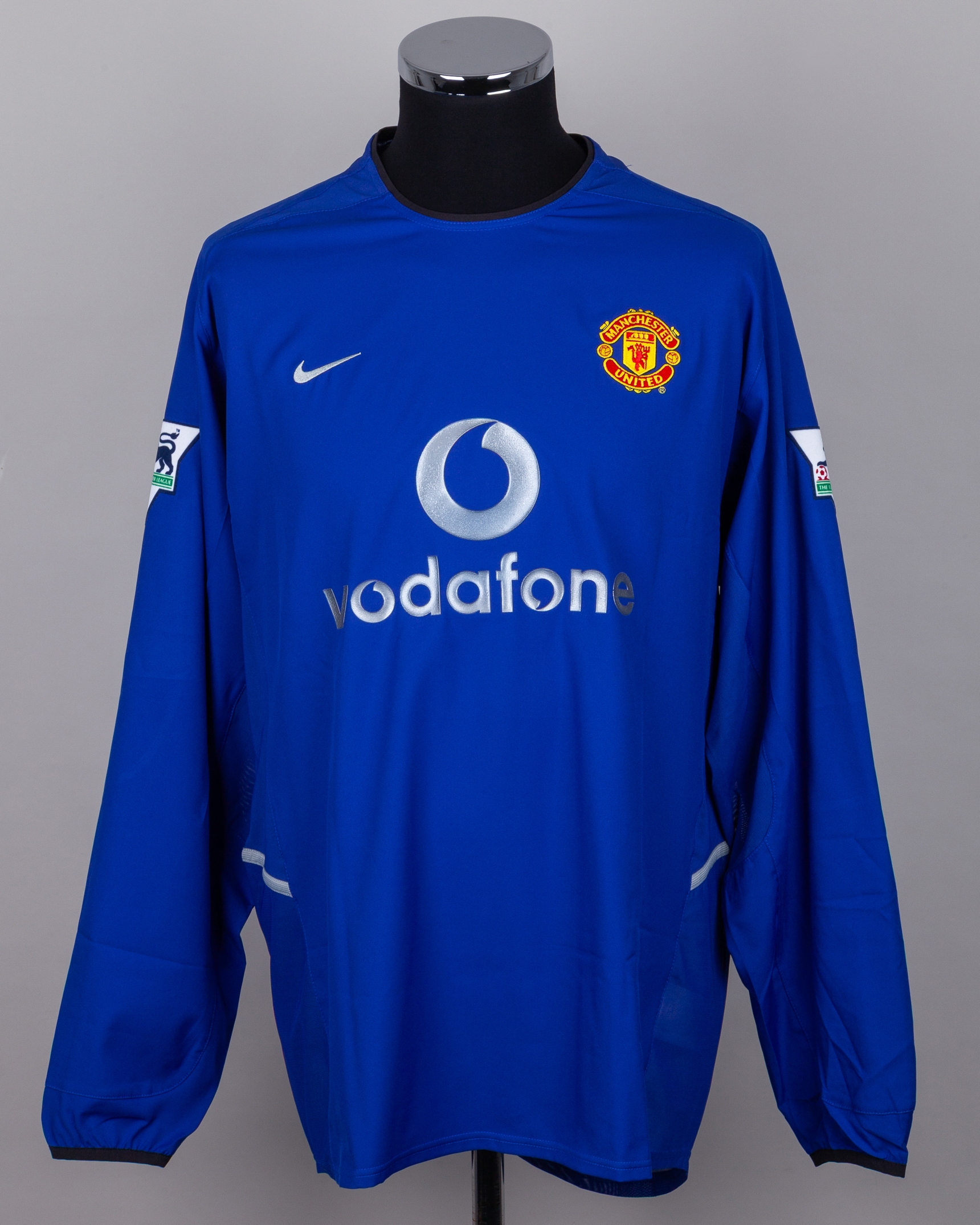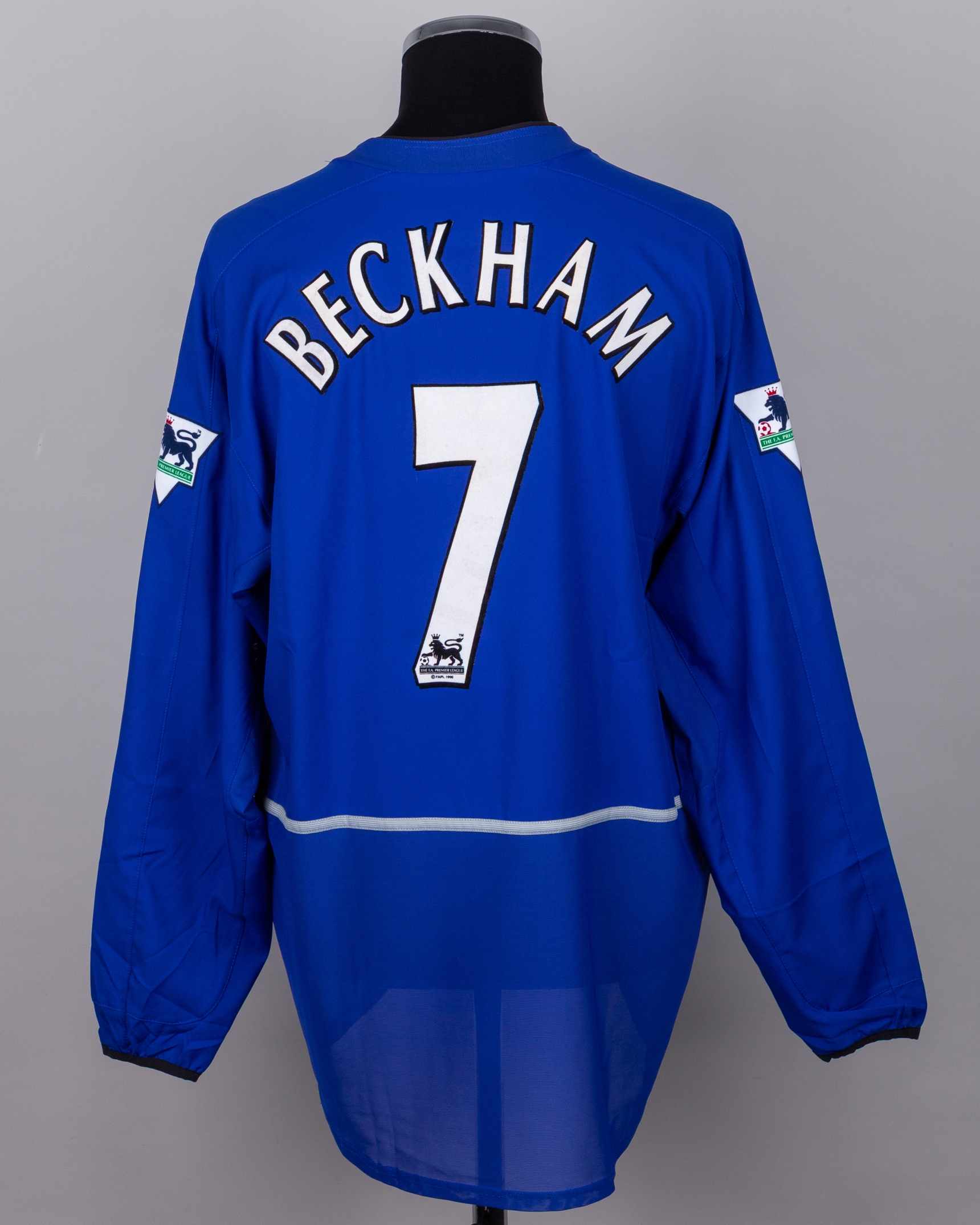 David Beckham blue No.7 Manchester United long-sleeved shirt, 2002-03, Nike, XL, with crew-neck collar and embroidered badge inscribed MANCHESTER UNITED, the reverse lettered BECHAM, the sleeves with The F.A. Premier League flashes