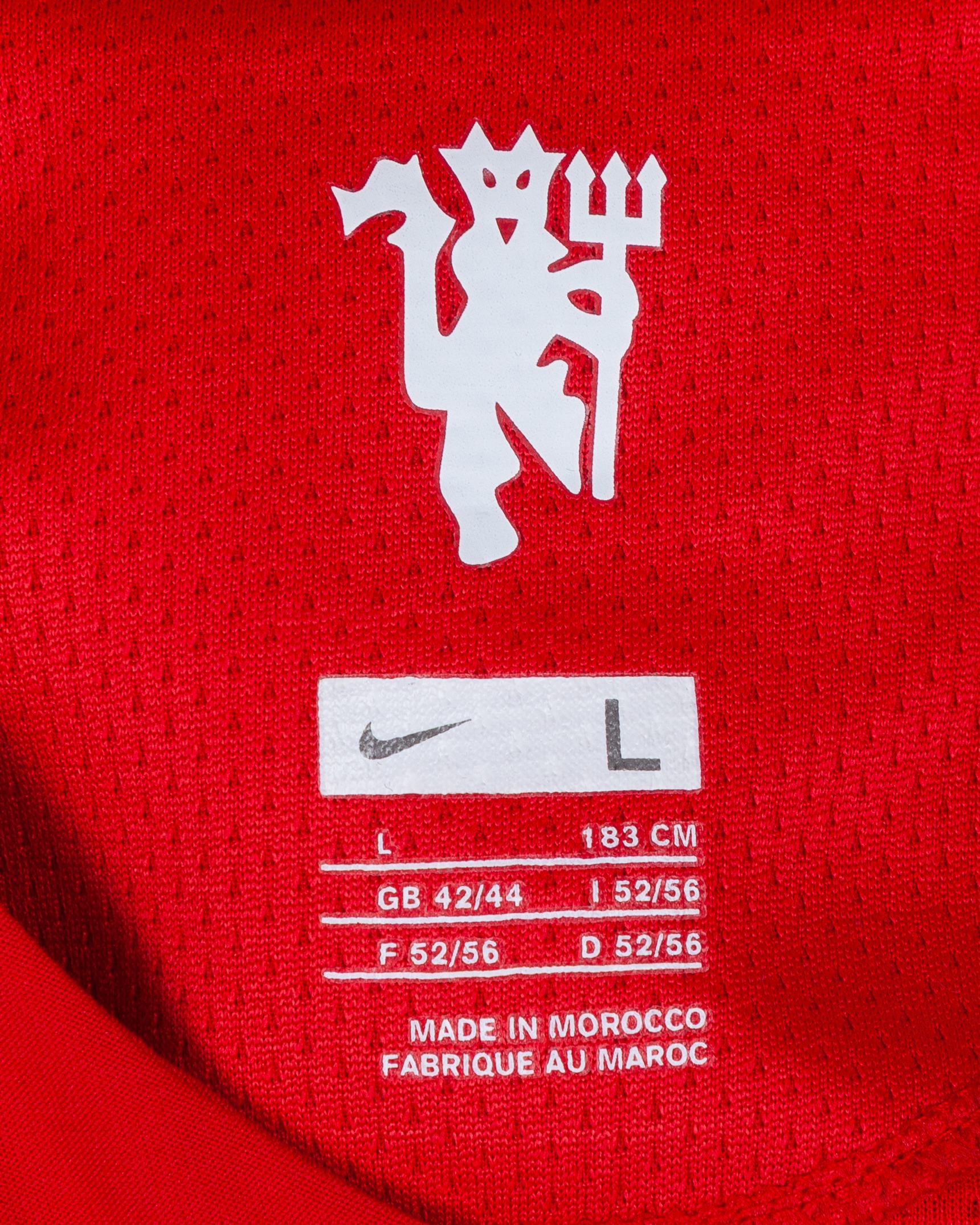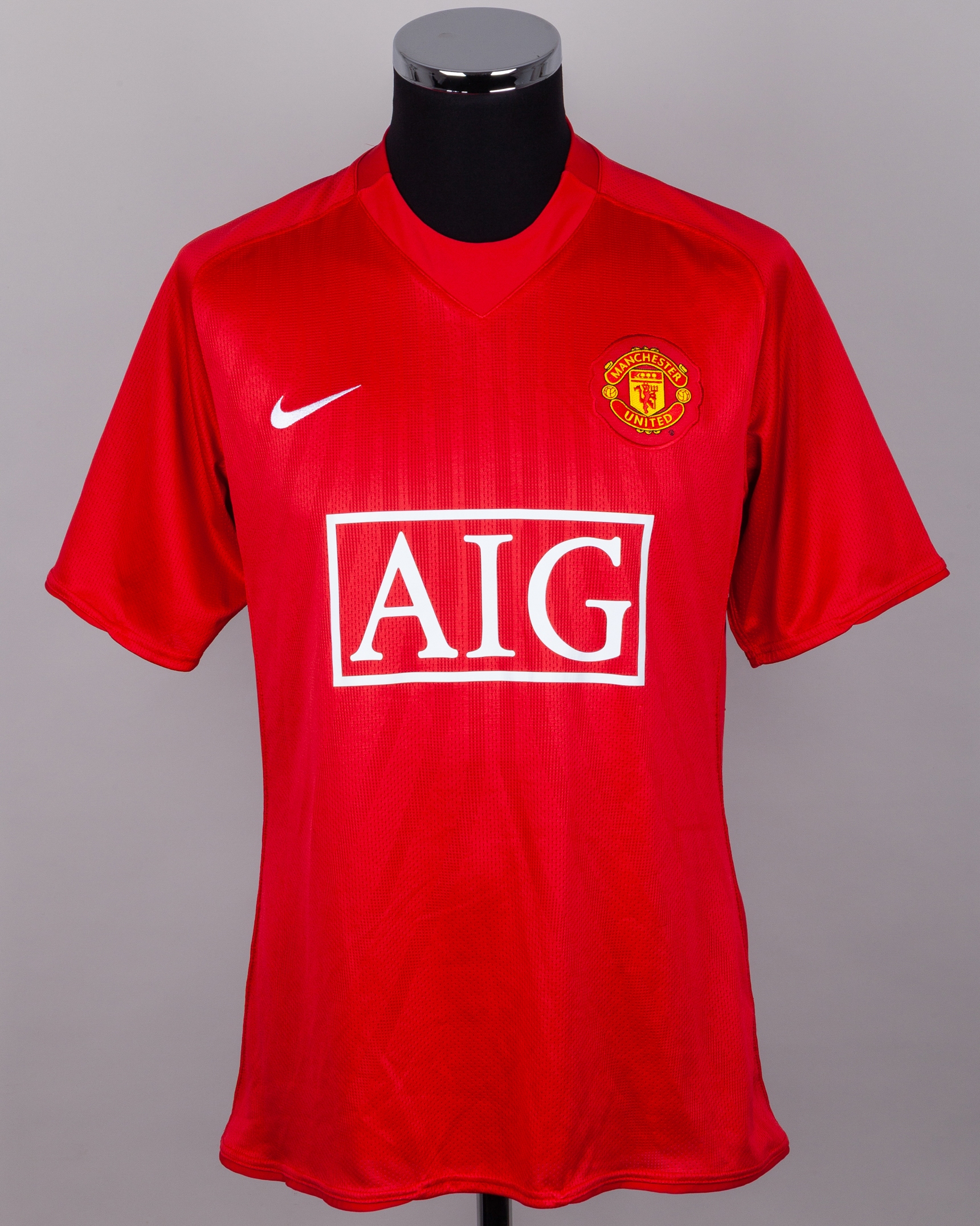 Michael Carrick red No.16 Manchester United autographed short-sleeved shirt, 2007-09, L, with v-neck collar and embroidered cloth badge inscribed MANCHESTER UNITED, the reverse autographed by Carrick