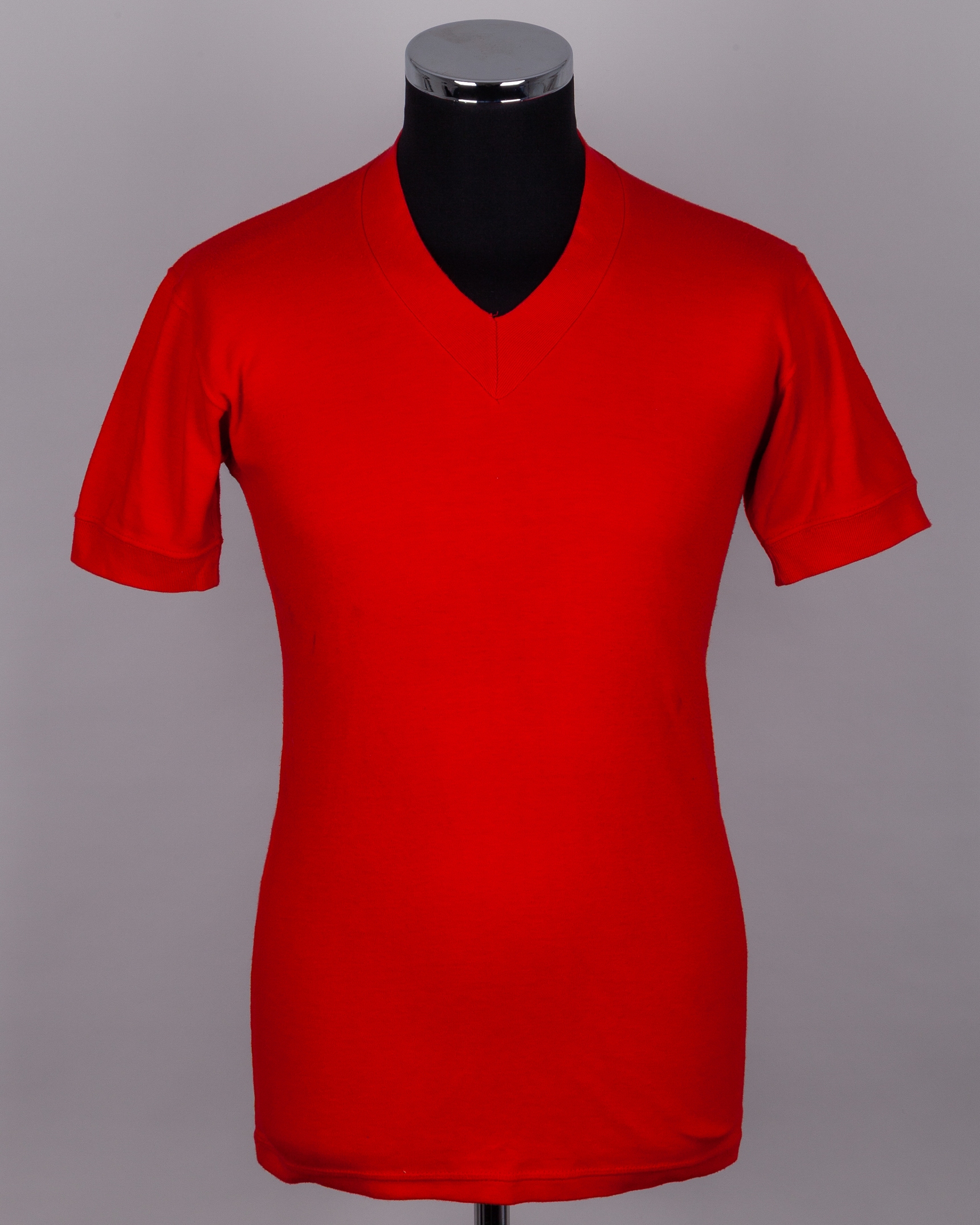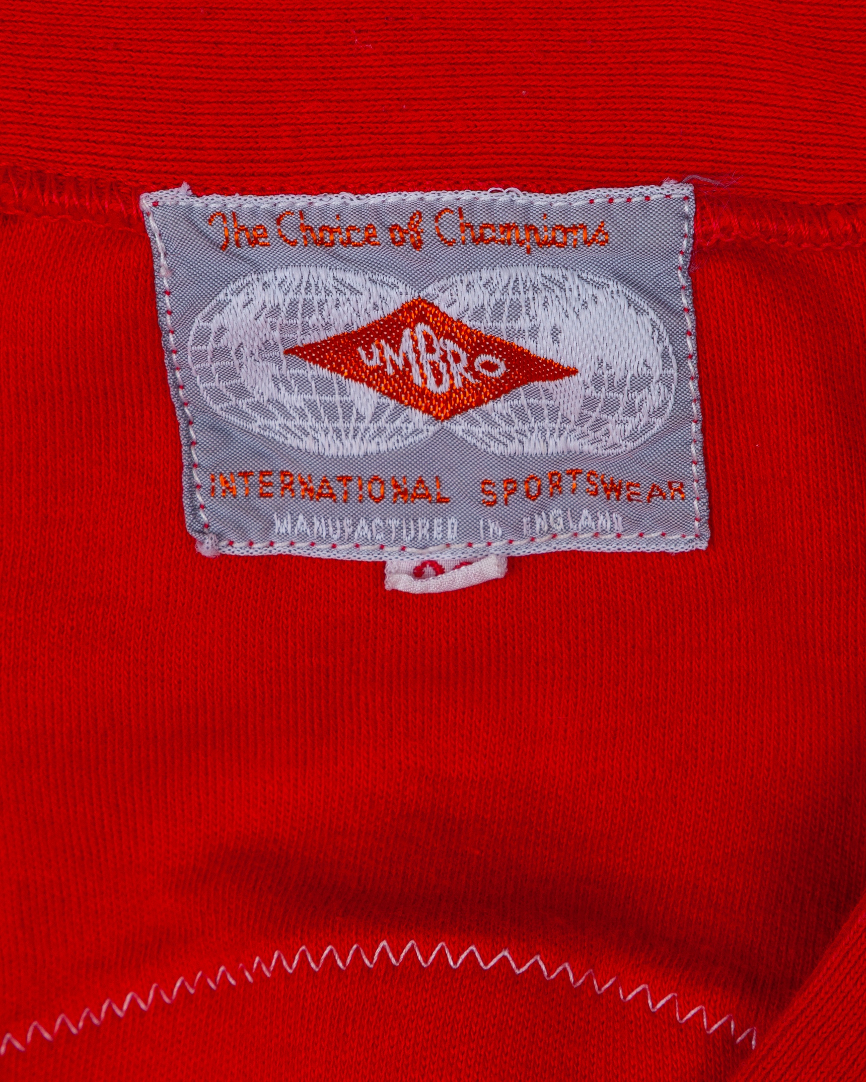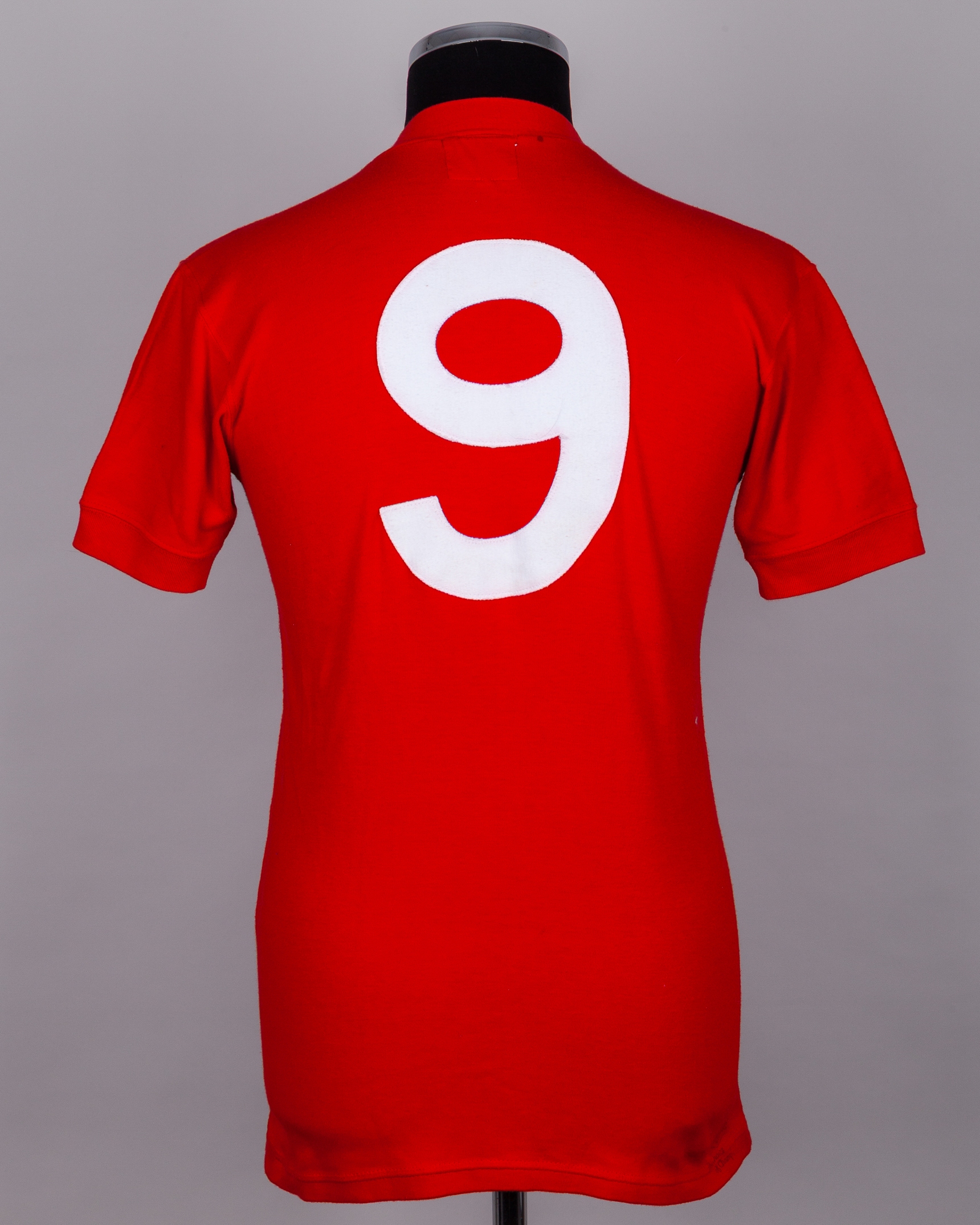 Mick Jones red No.9 Leeds United short-sleeved shirt, 1967-68, Umbro, M, with v-neck collar, with letter from Mick Jones stating he wore this shirt in an away match
