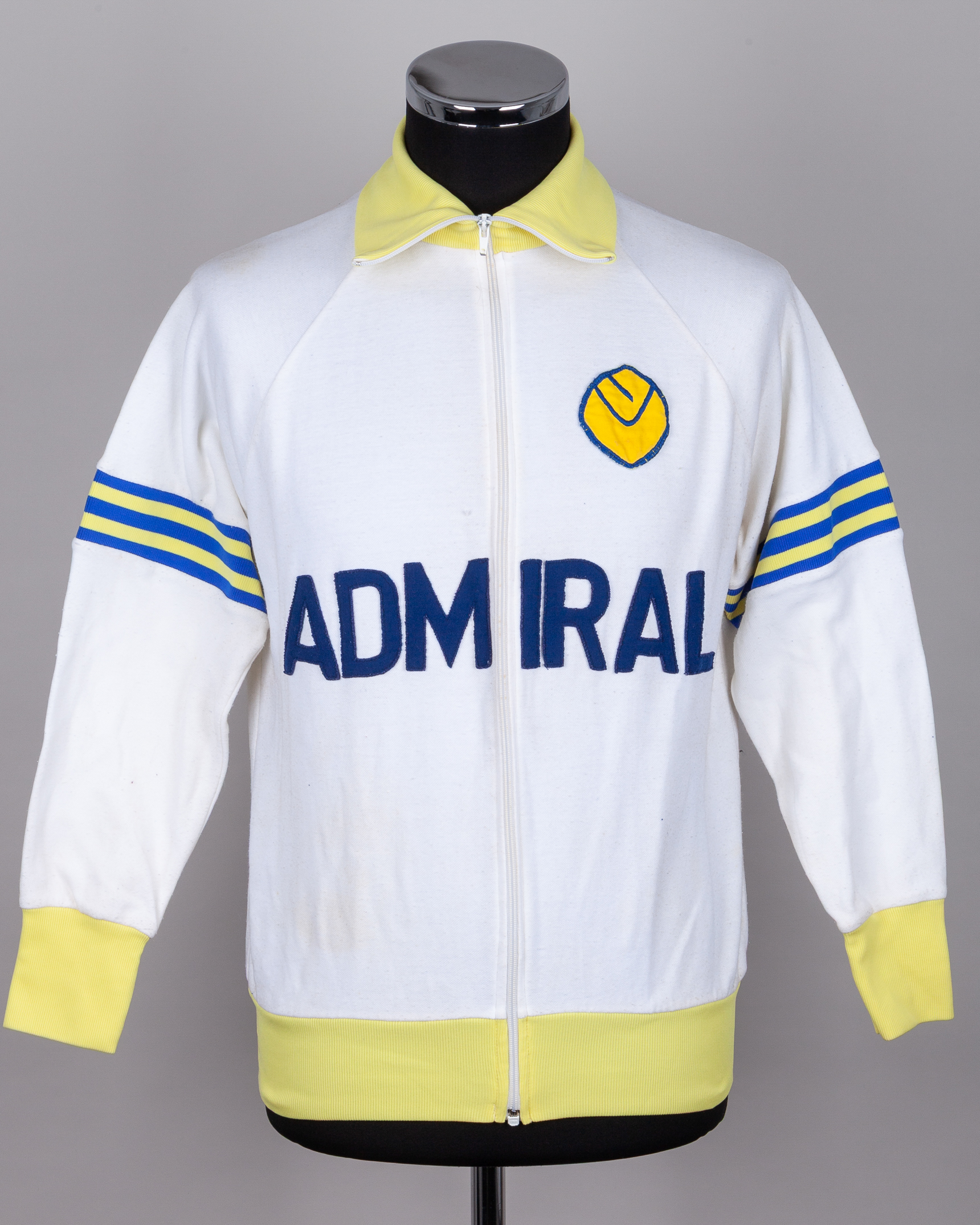 Mick Jones white and yellow Leeds United worn track suit top, 1973-74, Admiral, with zip-up front and embroidered cloth badge, inscribed LU, the front lettered ADMIRAL, in worn condition, staining, the reverse lettered MICK JONES, with letter from Mick Jones stating he wore this tracksuit during the season