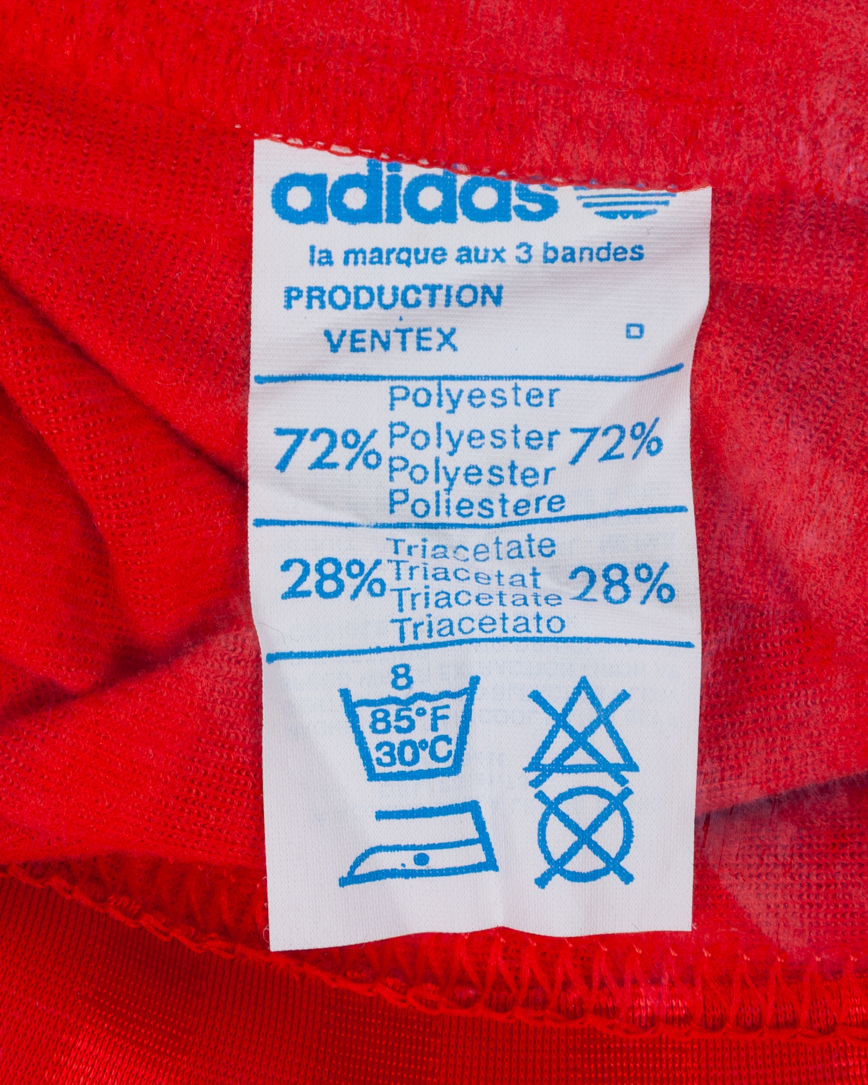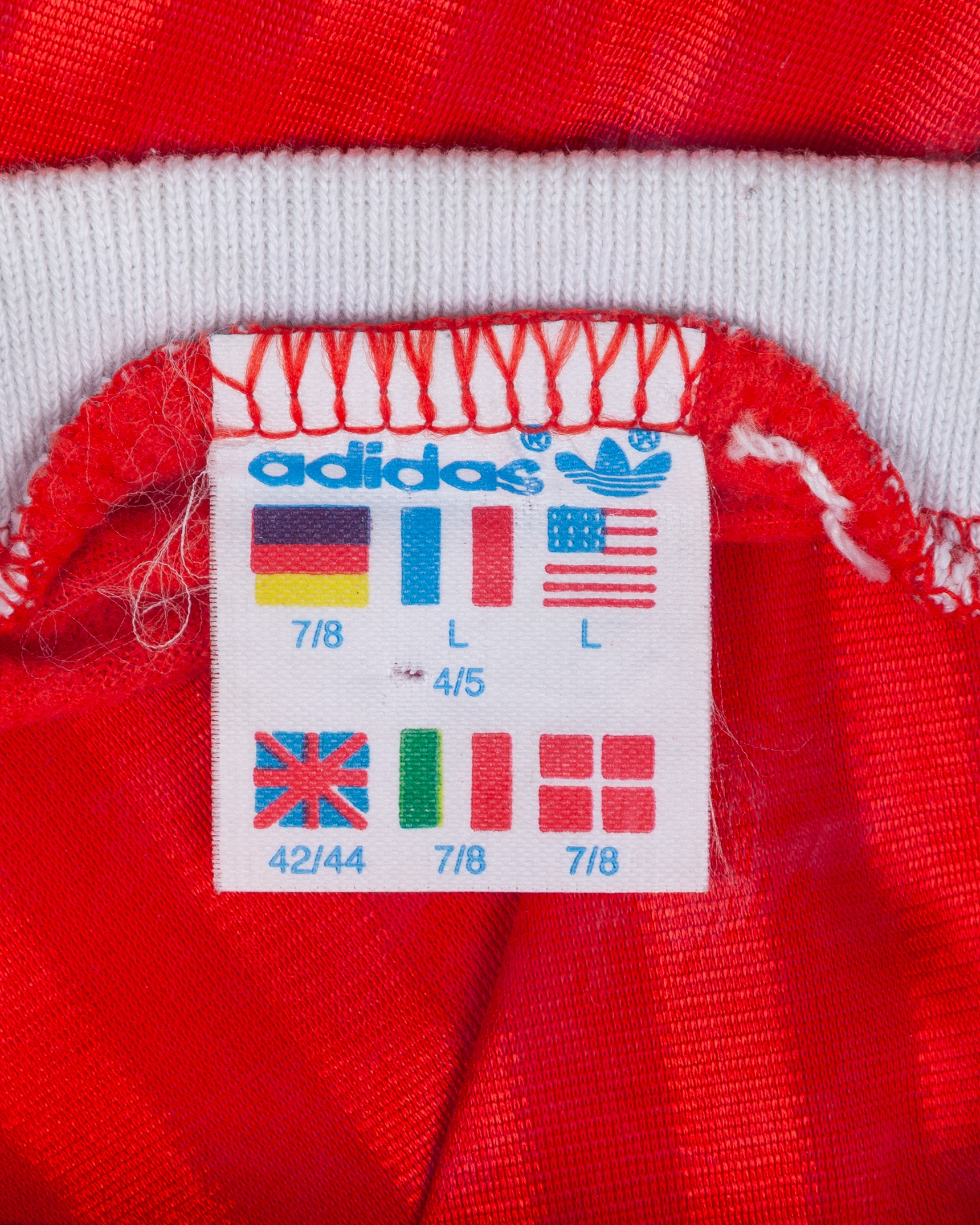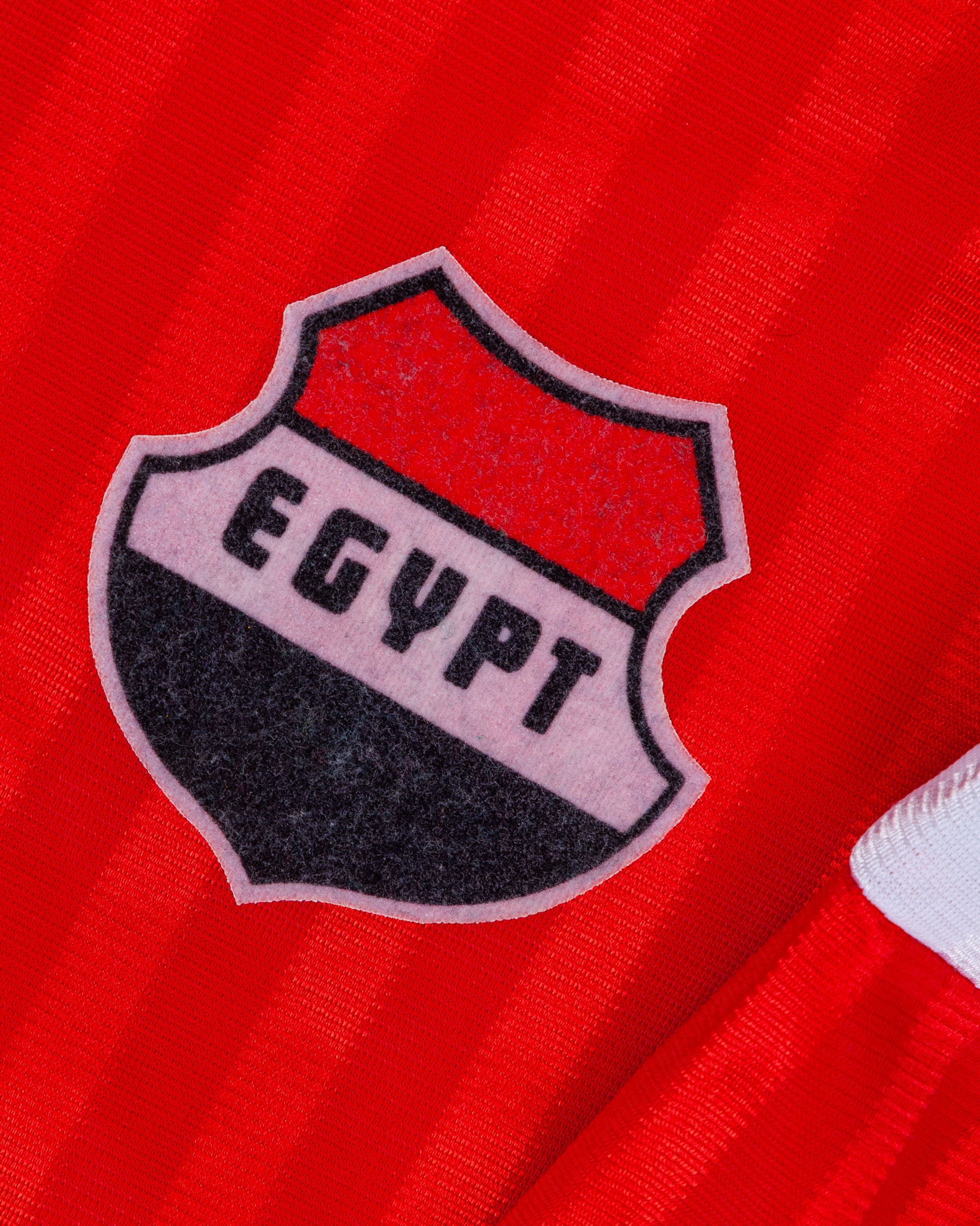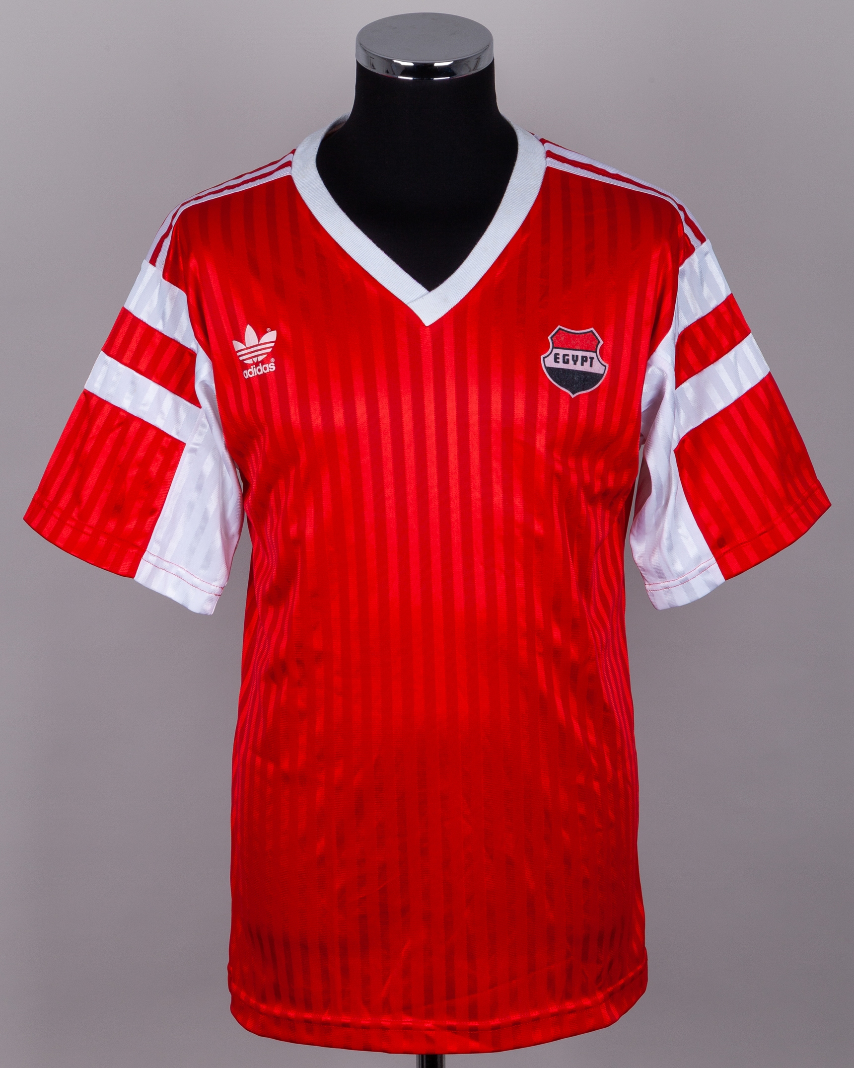 John Byrne - Ahmed El-Kass red and white No.20 Egypt v. Republic of Ireland match worn short-sleeved shirt, 1990, Adidas, 42-44, with v-neck collar and felt badge