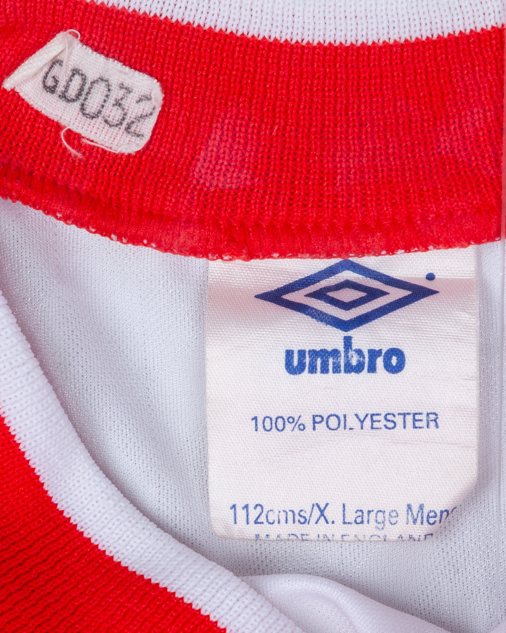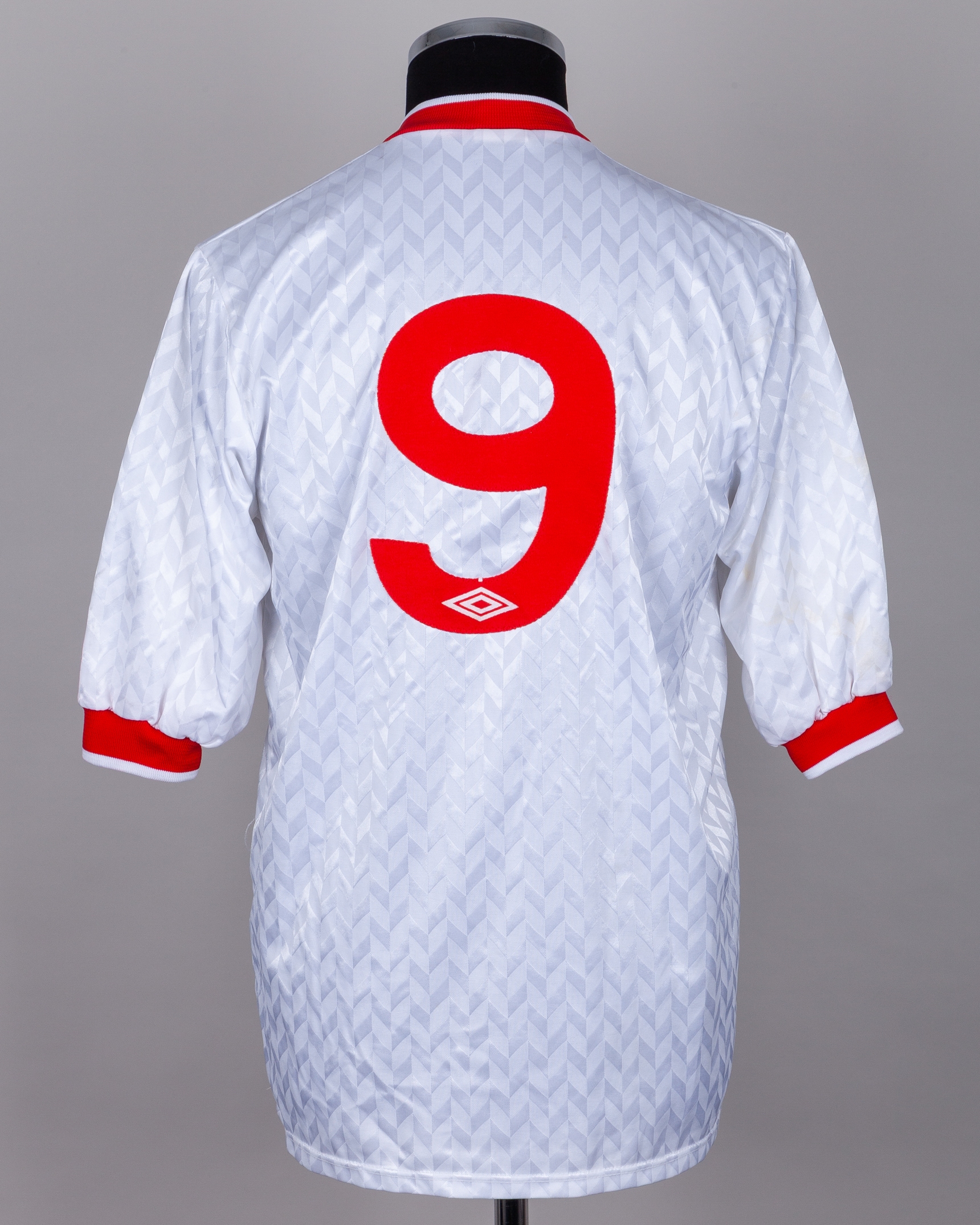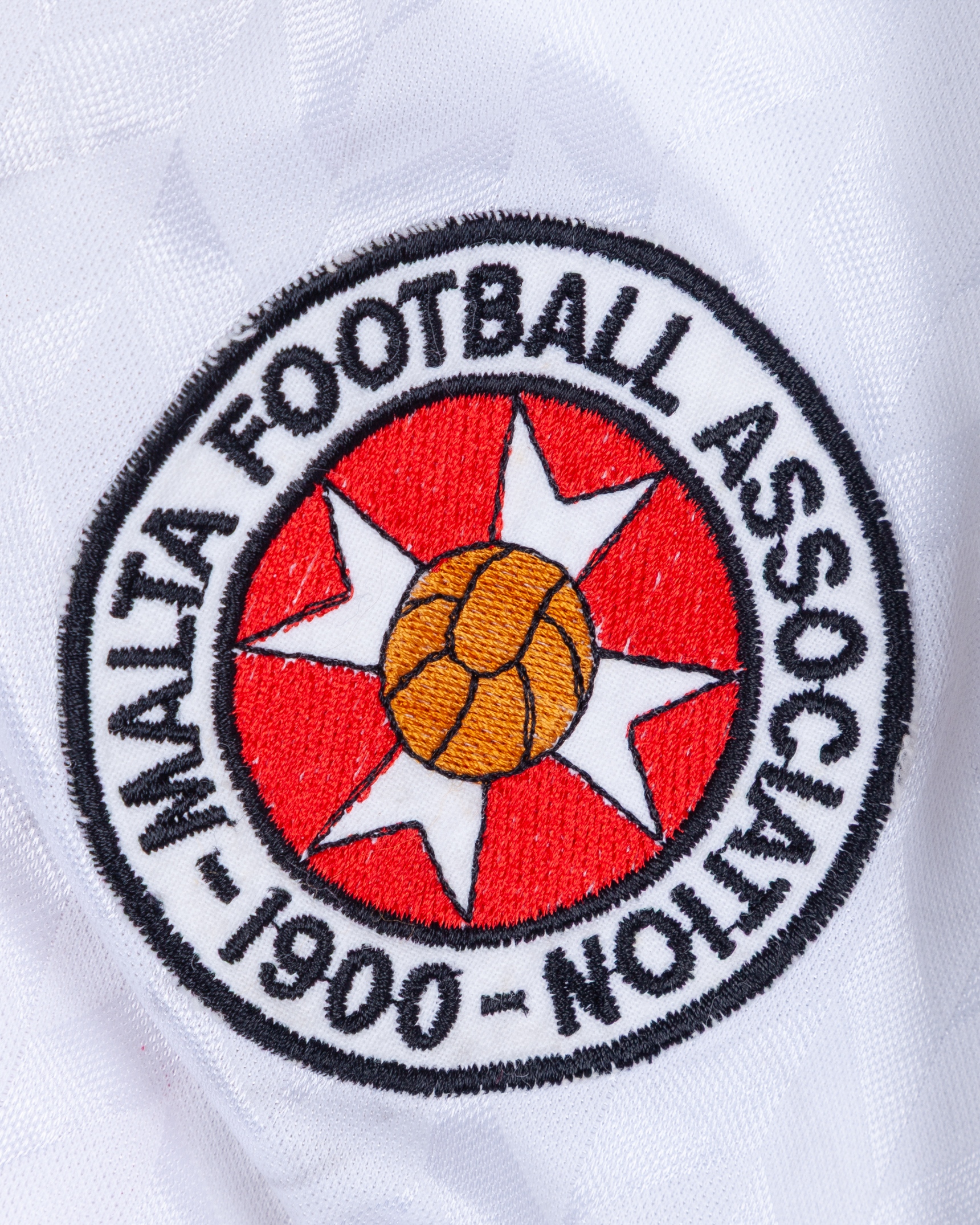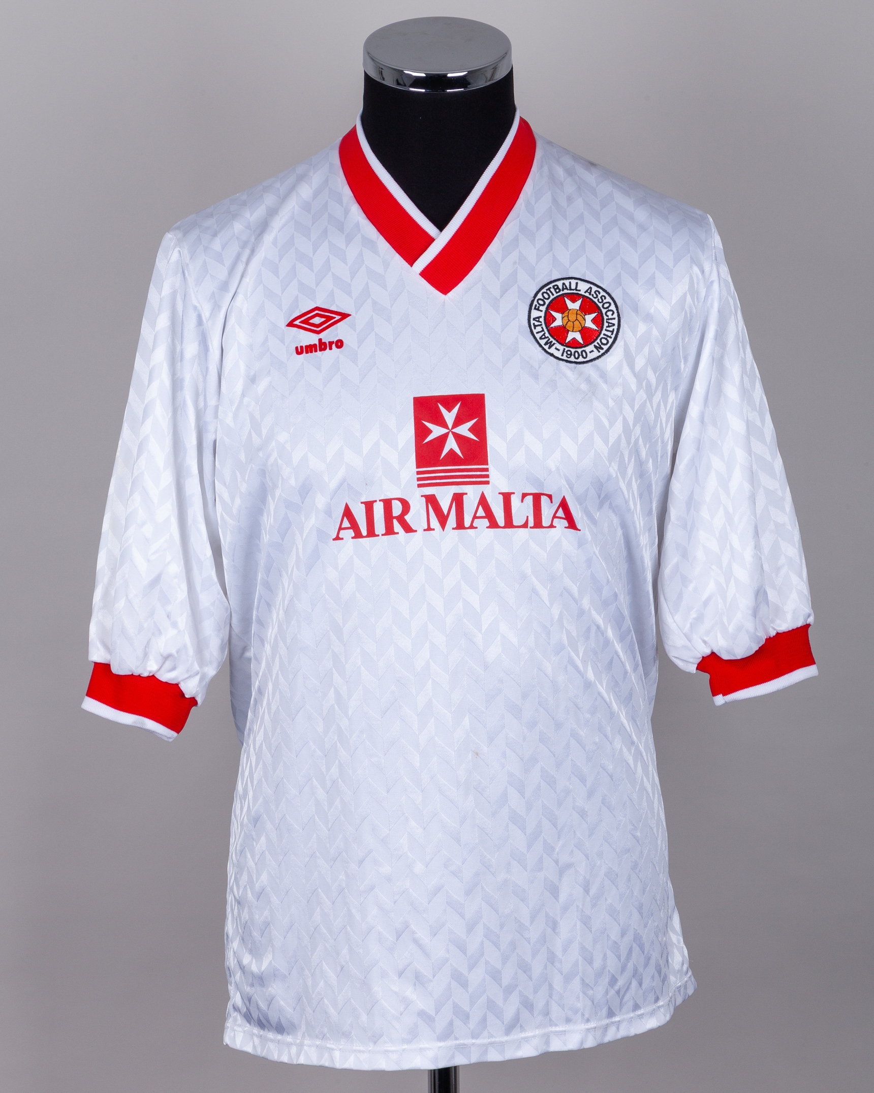 John Byrne - white and red No.9 Malta v. Republic of Ireland short-sleeved shirt, 1990, Umbro, XL, with v-neck collar and embroidered cloth badge inscribed MALTA FOOTBALL ASSOCIATION 1900