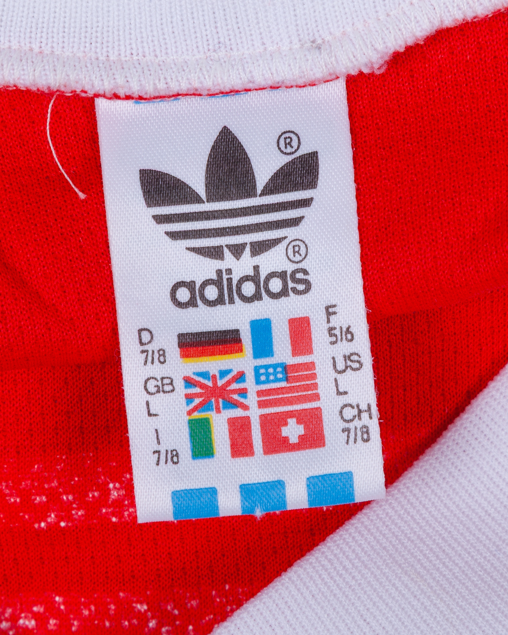 John Byrne - red and white No.17 Malta v. Republic of Ireland short-sleeved shirt, 1989, Adidas, L, with v-neck collar and felt badge