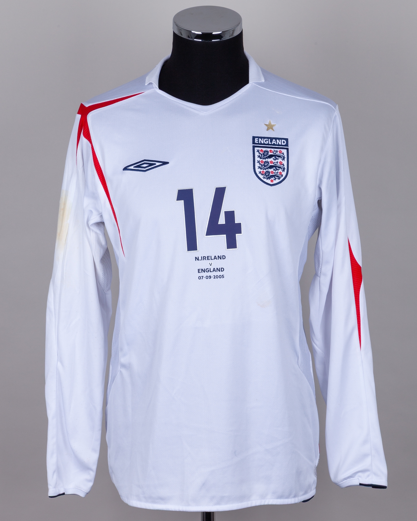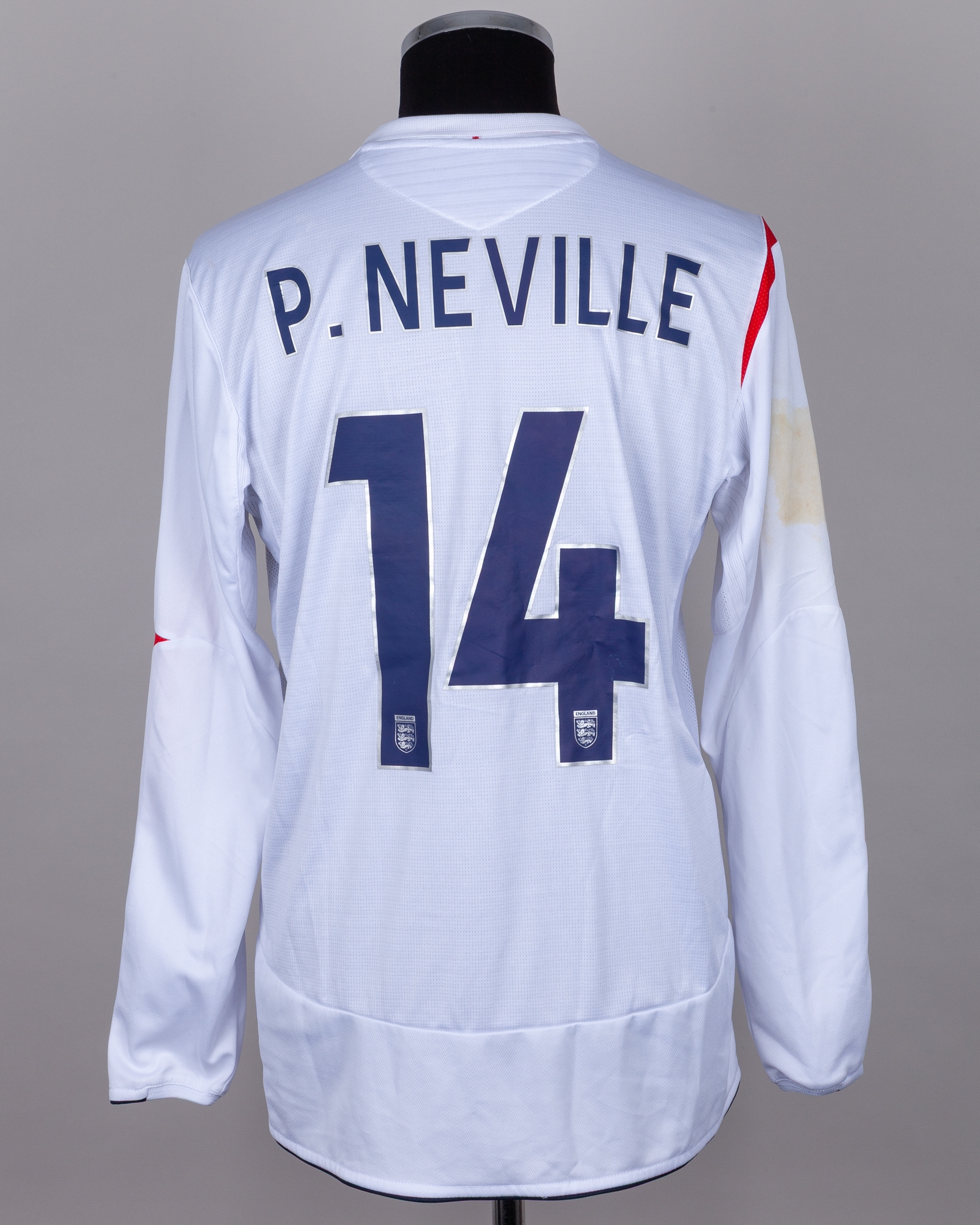 David Healy - Phil Neville white and red No.14 England v. Northern Ireland match issued long-sleeved shirt, 2005, Umbro, with v-neck collar and embroidered cloth badge inscribed ENGLAND with N. IRELAND v. ENGLAND 07.09.2005 decal, the reverse lettered P. NEVILLE, the right sleeve lacking World Cup flash and stained