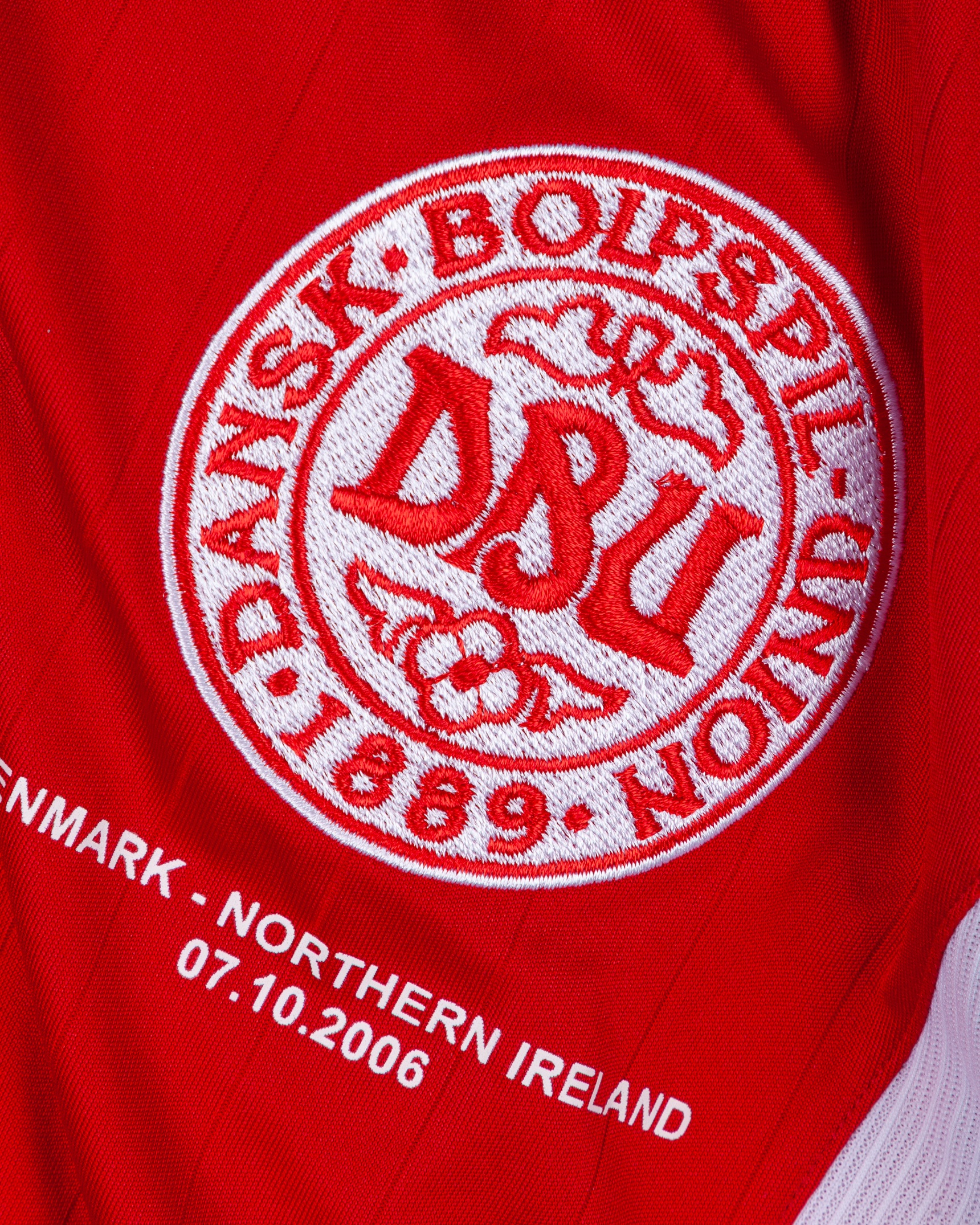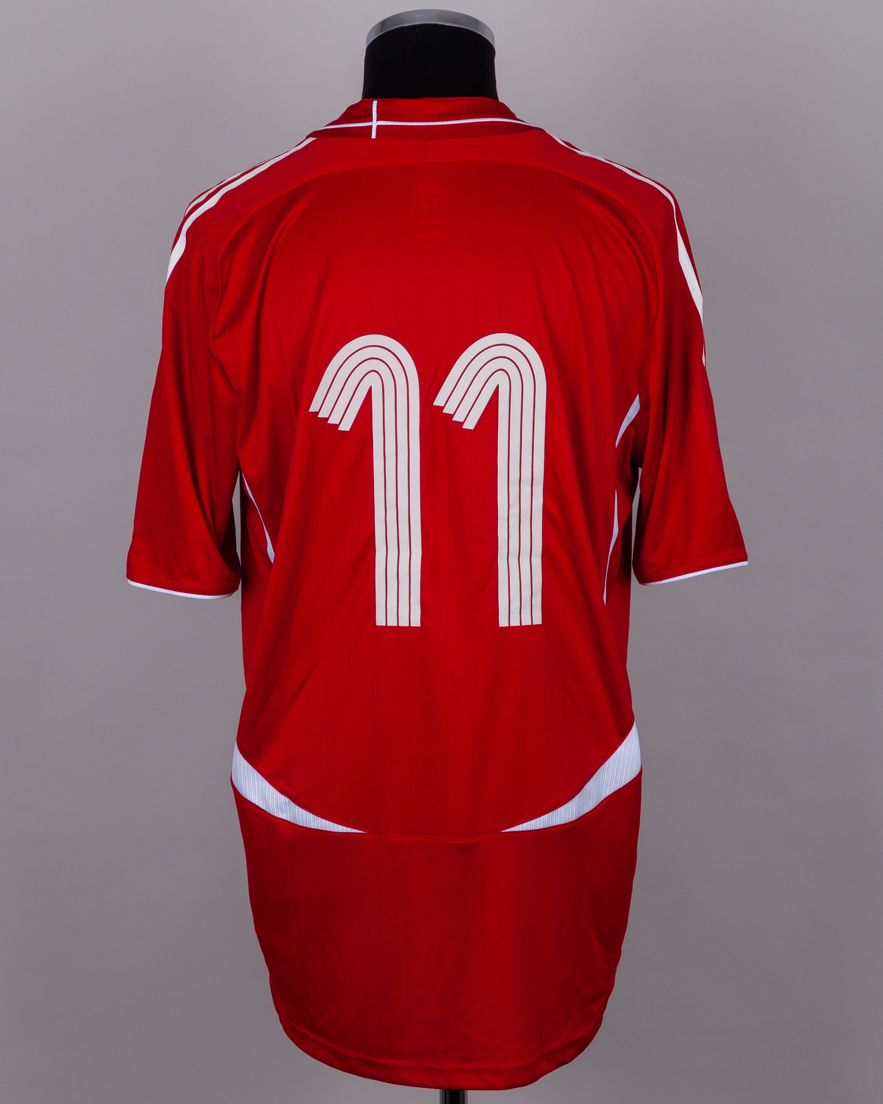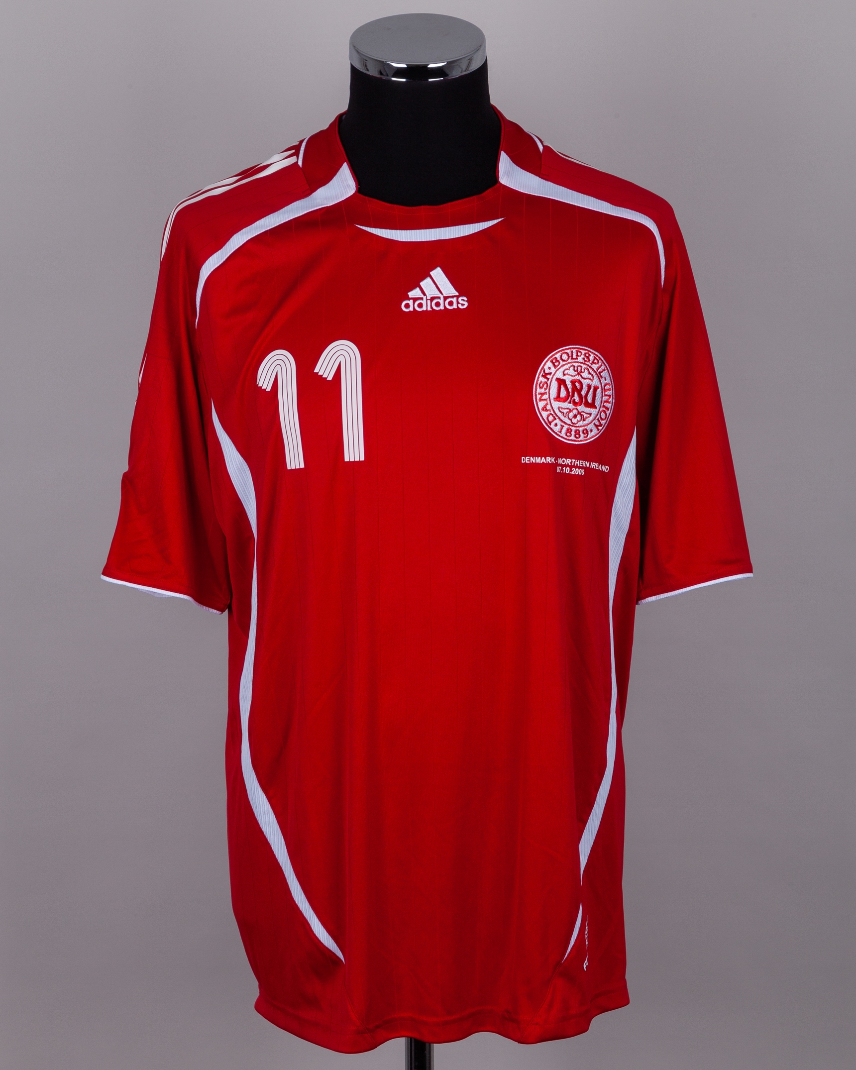 David Healy - Peter Lovenkrands red and white No.11 Denmark v. Northern Ireland match worn short-sleeved shirt, 2006, Adidas, XL, with crew-neck collar and embroidered badge inscribed DBU 1889, with DENMARK - NORTHERN IRELAND 07.10.2006 decal