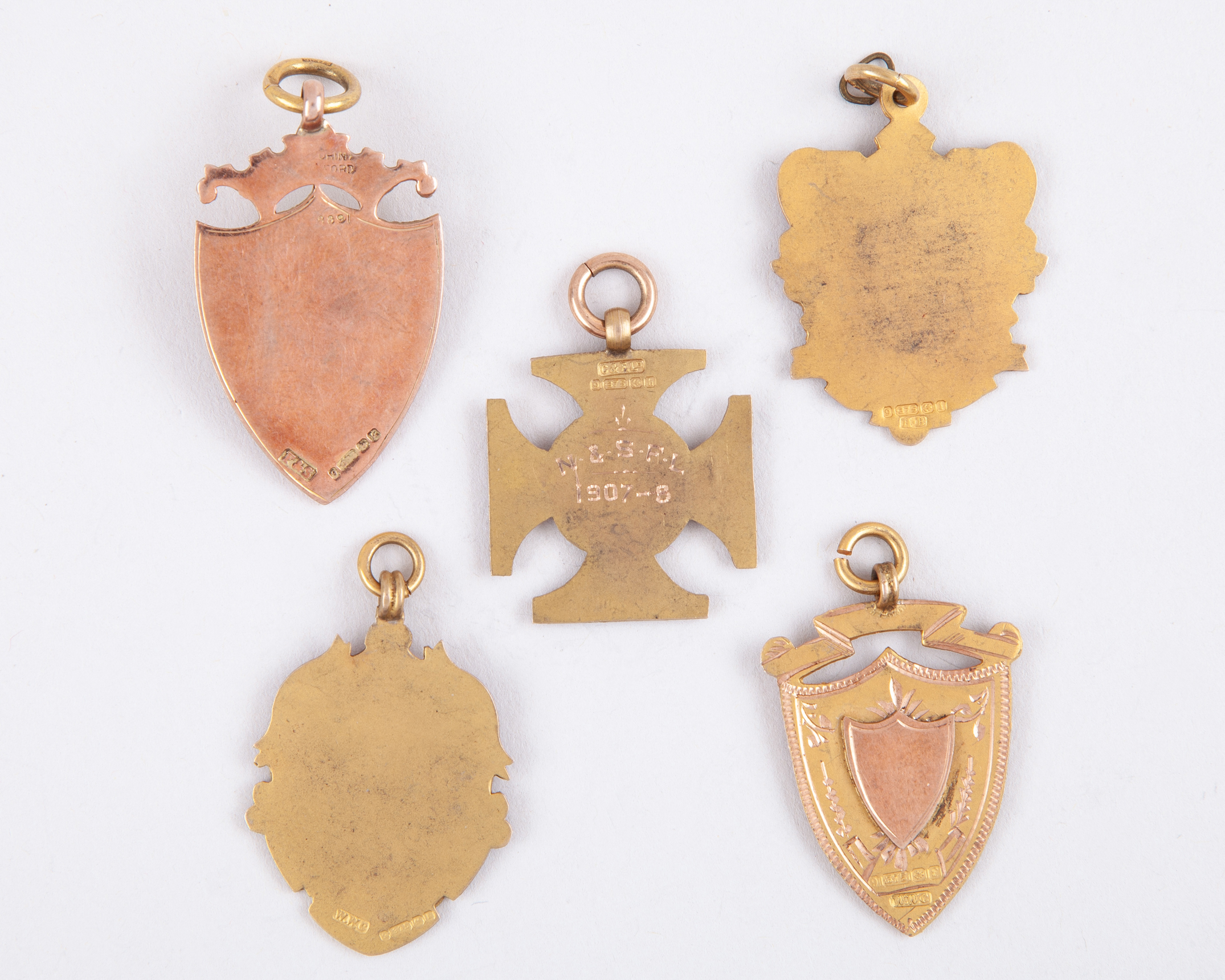Joseph Dines five various 9ct gold medals comprising NCFA, CCC 1907-08, 1909-10 and three uninscribed medals, 23grms combined (5)