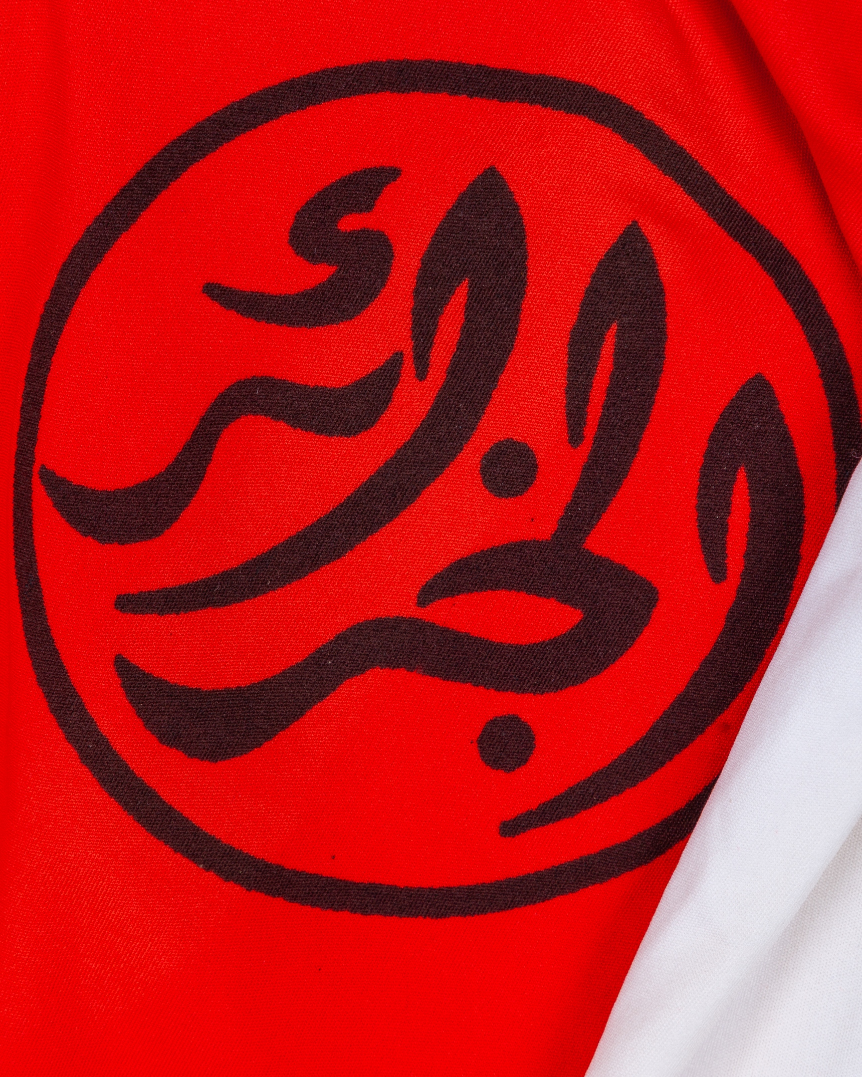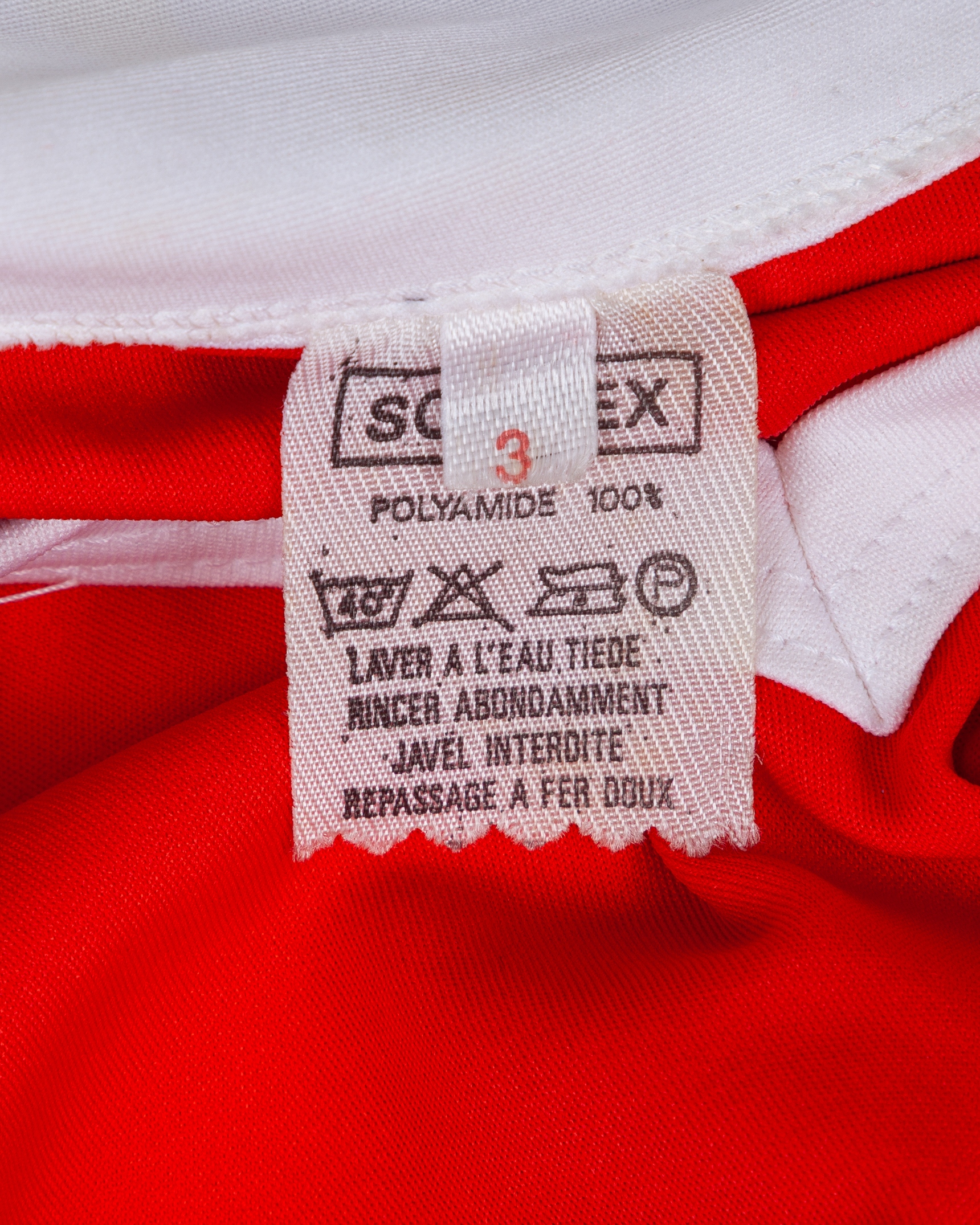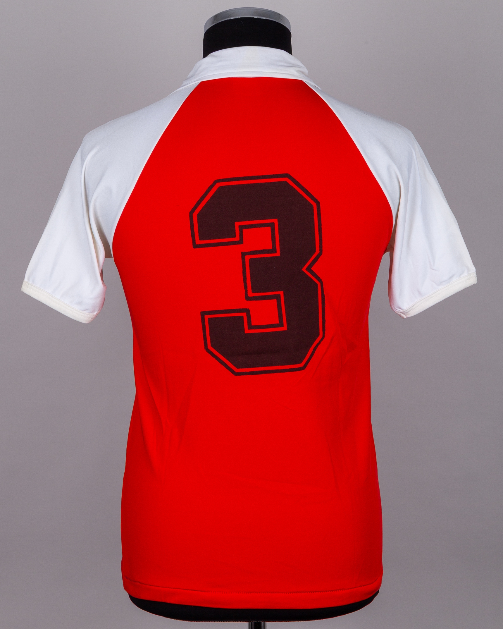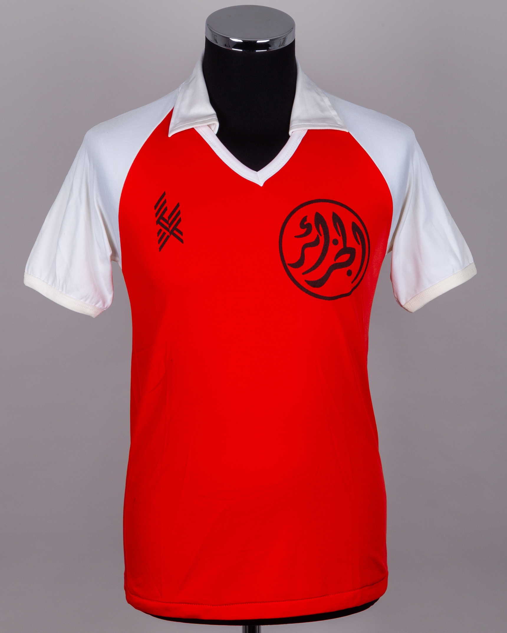 Eoin Hand - Chaabane Merekane red and white No.3 Algeria v. Republic of Ireland short-sleeved shirt, 1982, Sonitex, 3, with crew-neck collar and printed badge