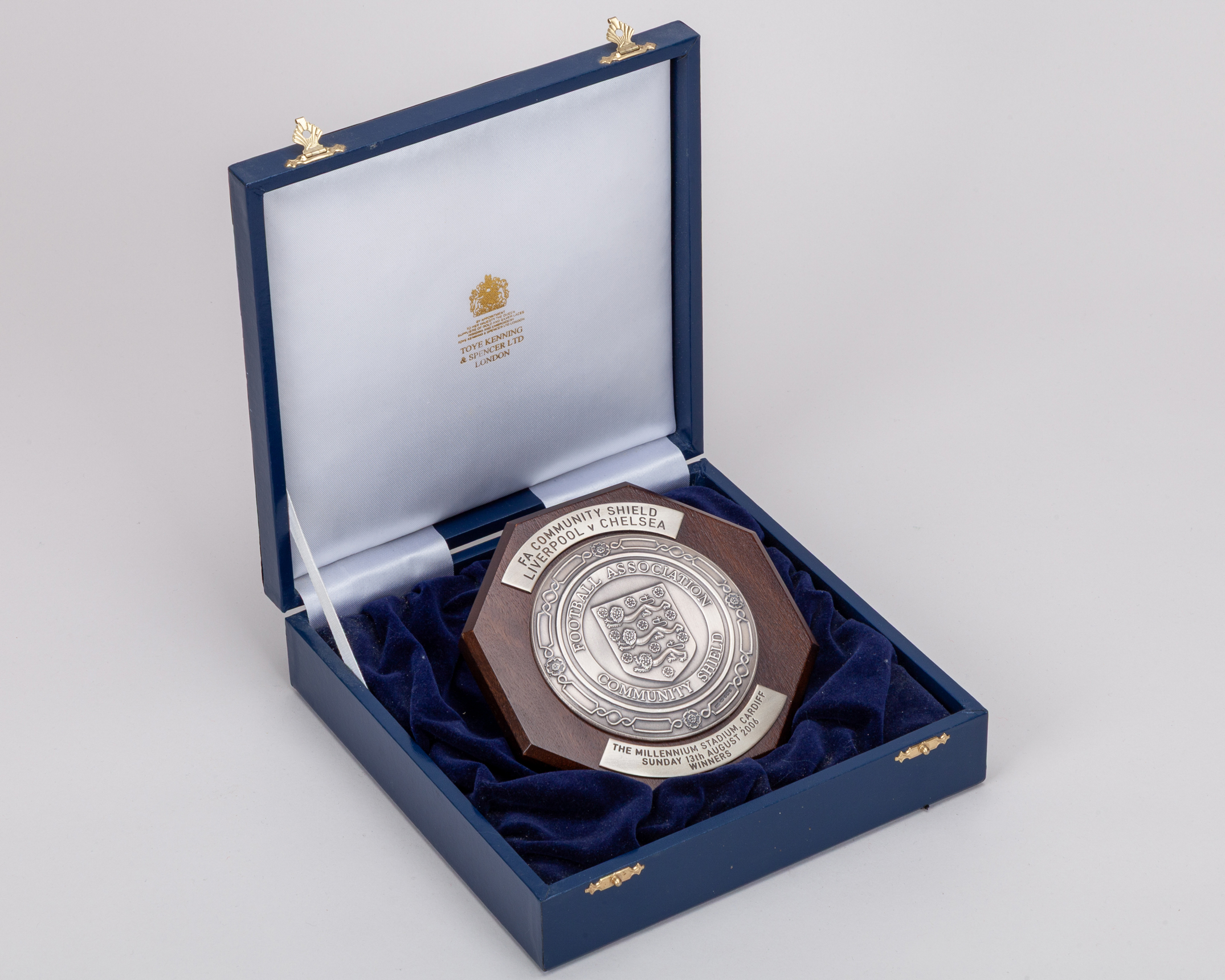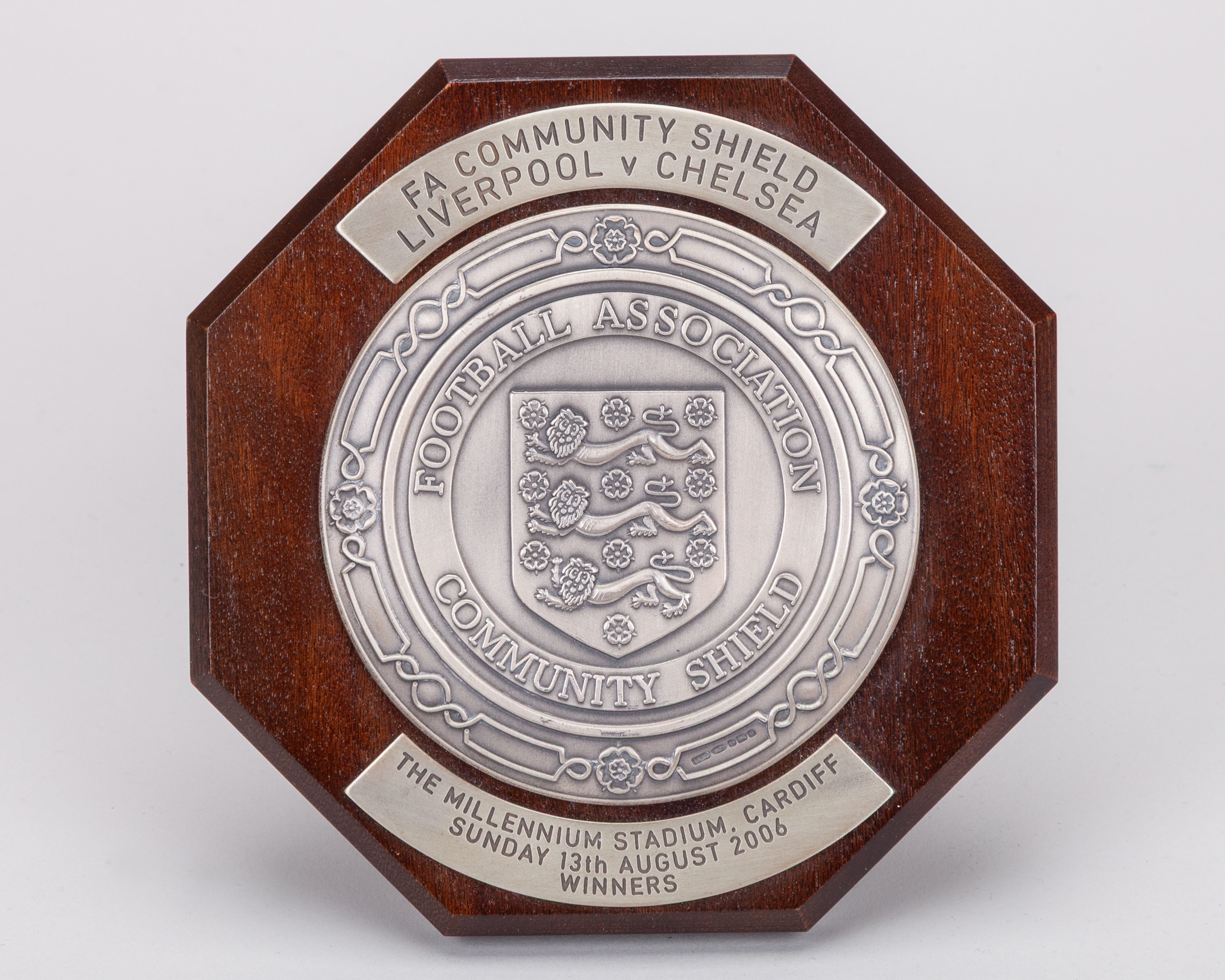 Steve Finnan a silver-mounted Community Shield plaque, 2006, inscribed FOOTBALL ASSOICATION COMMUNITY SHIELD, the hardwood plague inscribed FA COMMUNITY SHIELD LIVERPOOL v CHELSEA, THE MILLENNIUM STADIUM, CARDIFF SUNDAY 13th AUGUST 2006 WINNERS, in original fitted case