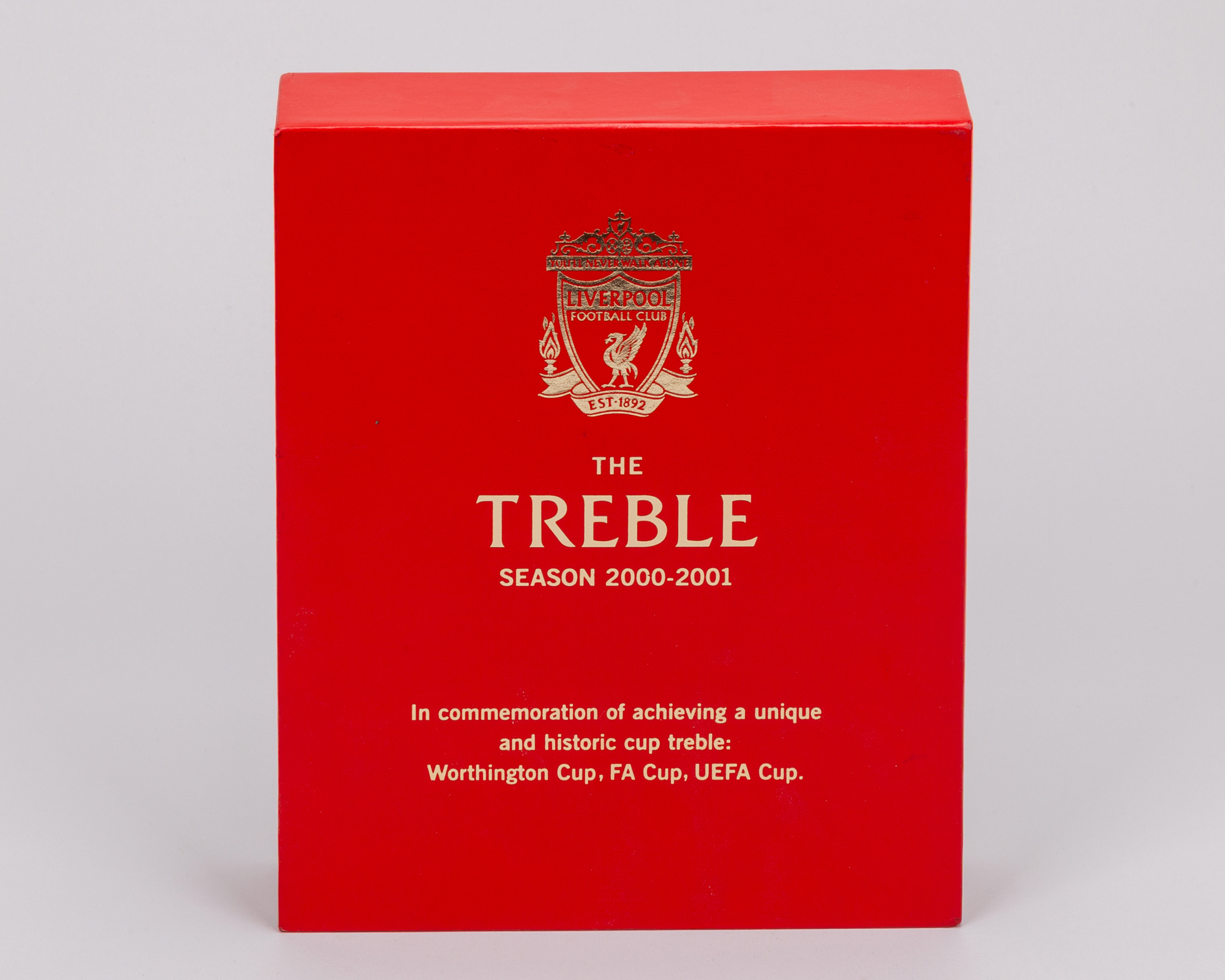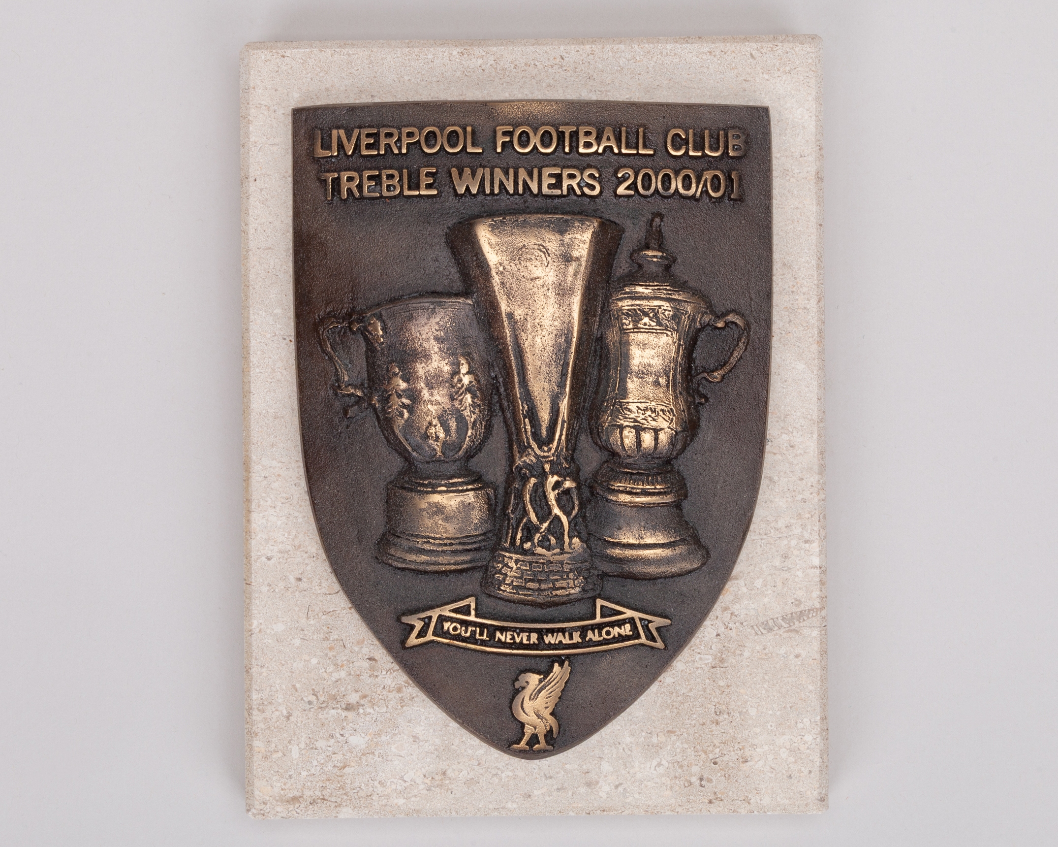 A Liverpool privately commissioned plaque commemorating the 2000-01 Treble, the shield shaped cast-metal plaque inscribed LIVERPOOL FOOTBALL CLUB TREBLE WINNERS 2000-01, on marble base, in original box with COA