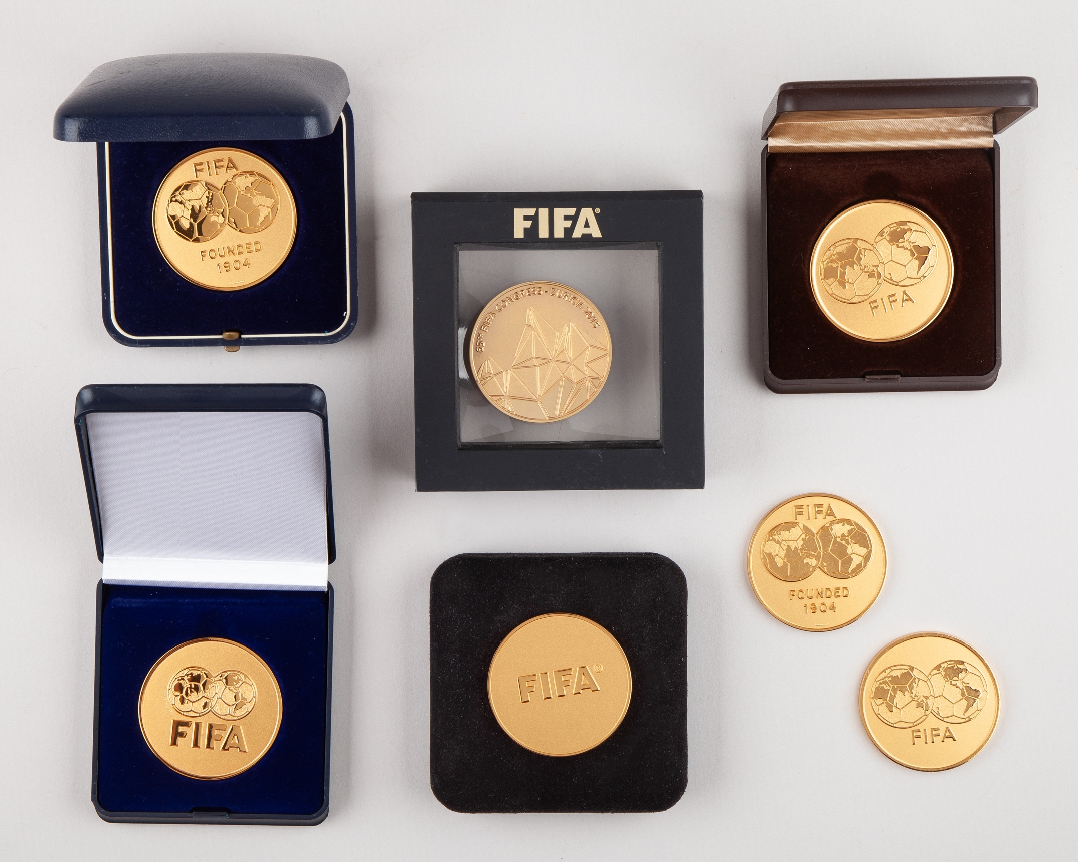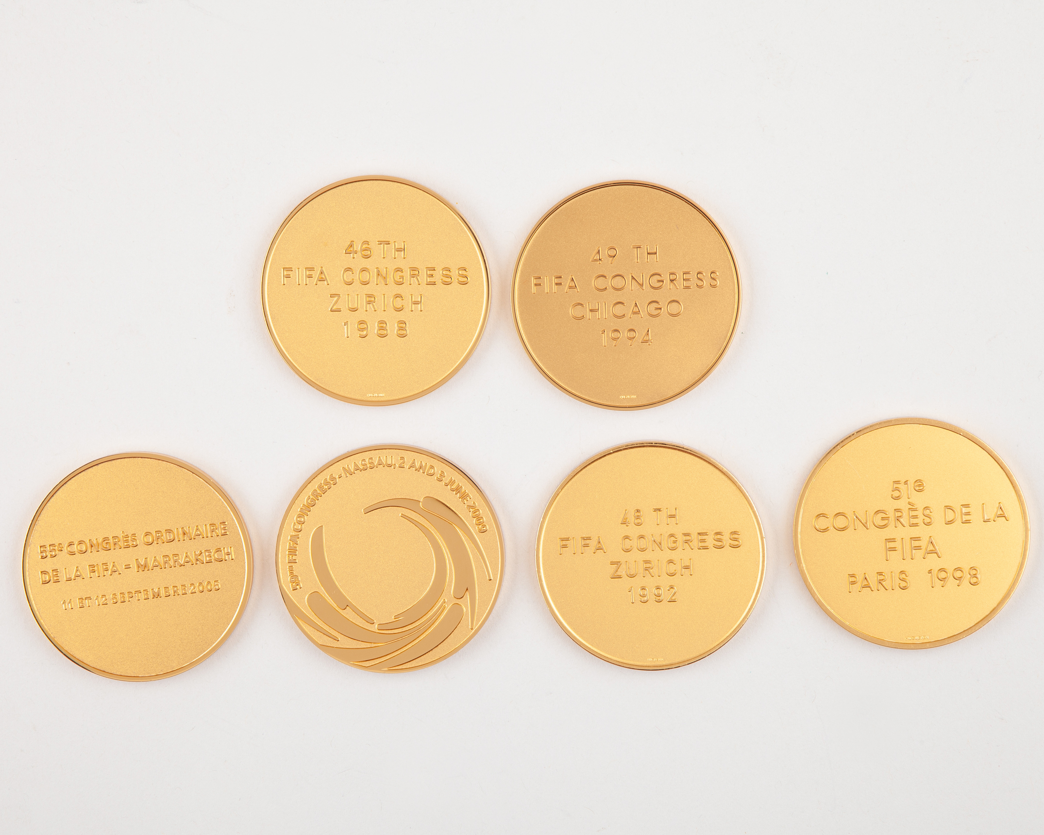 Seven yellow-metal FIFA Congress medals, 1988 to 2015, comprising 1988, in fitted case, 1992, 1994, in fitted case, 1998, 2005 in fitted case, 2009, in fitted case and 2015, in case (7)