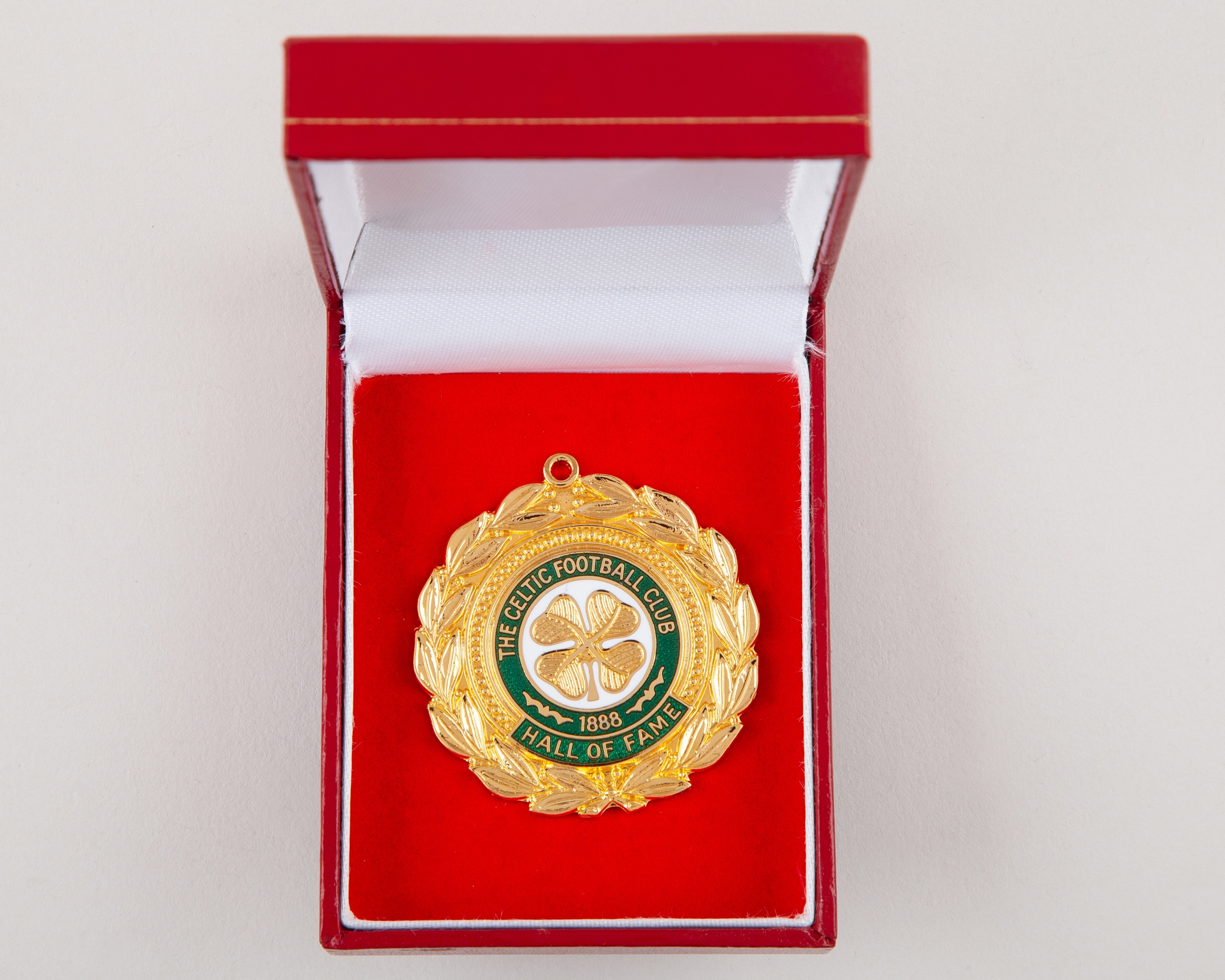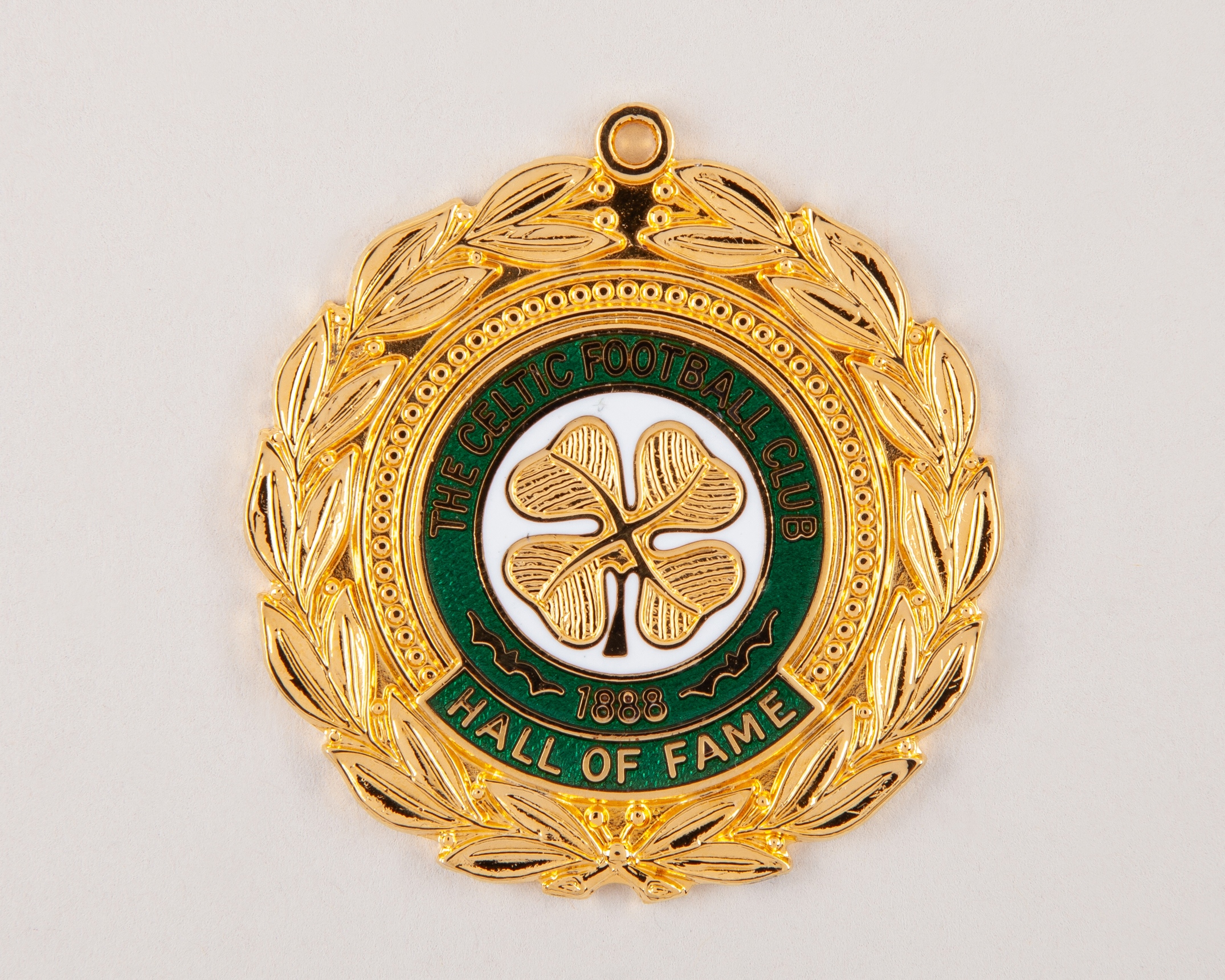 John Hughes yellow-metal and enamel hall of fame medal, the obverse inscribed THE CELTIC FOOTBALL CLUB, 1888, HALL OF FAME, the reverse inscribed JOHN HUGHES