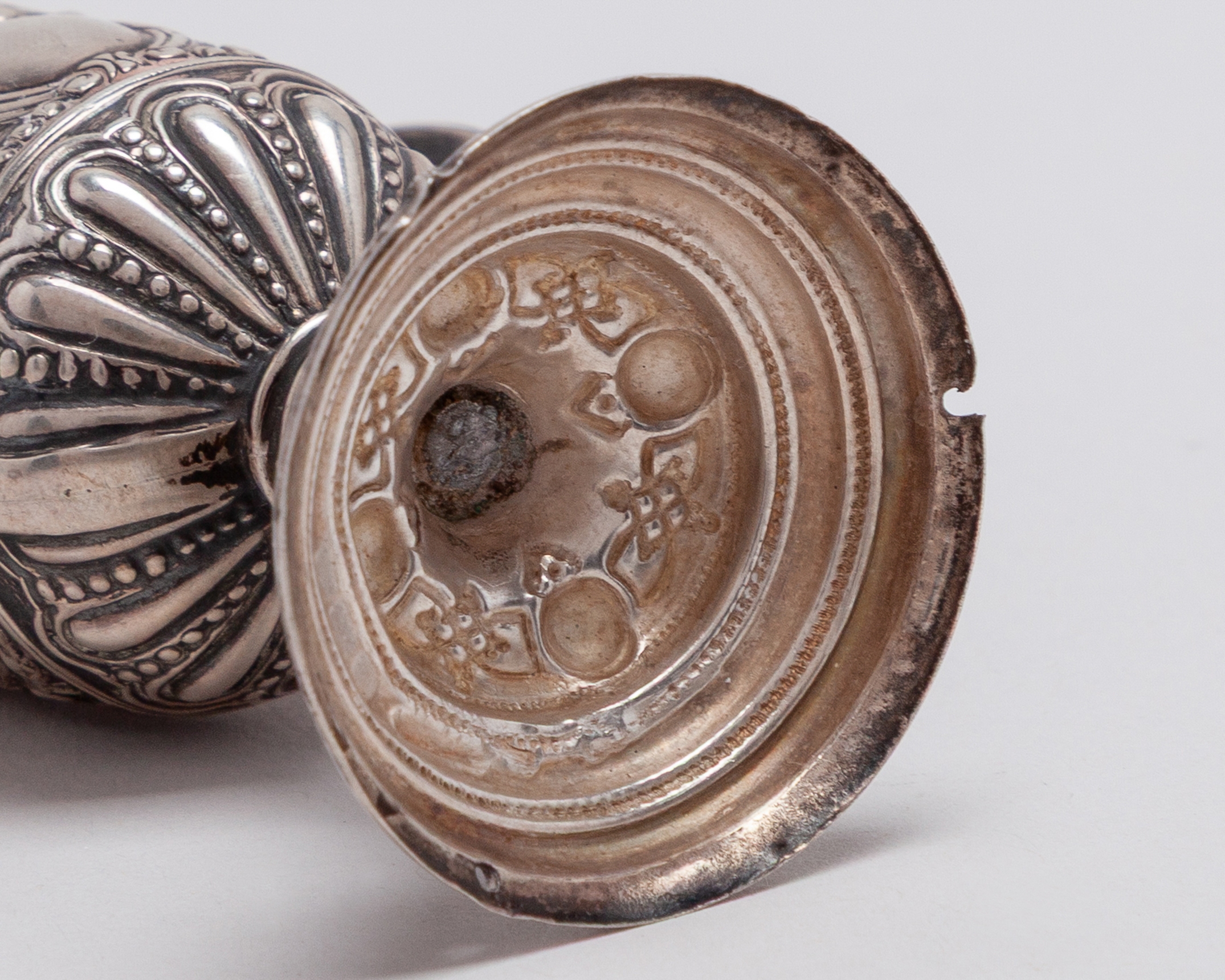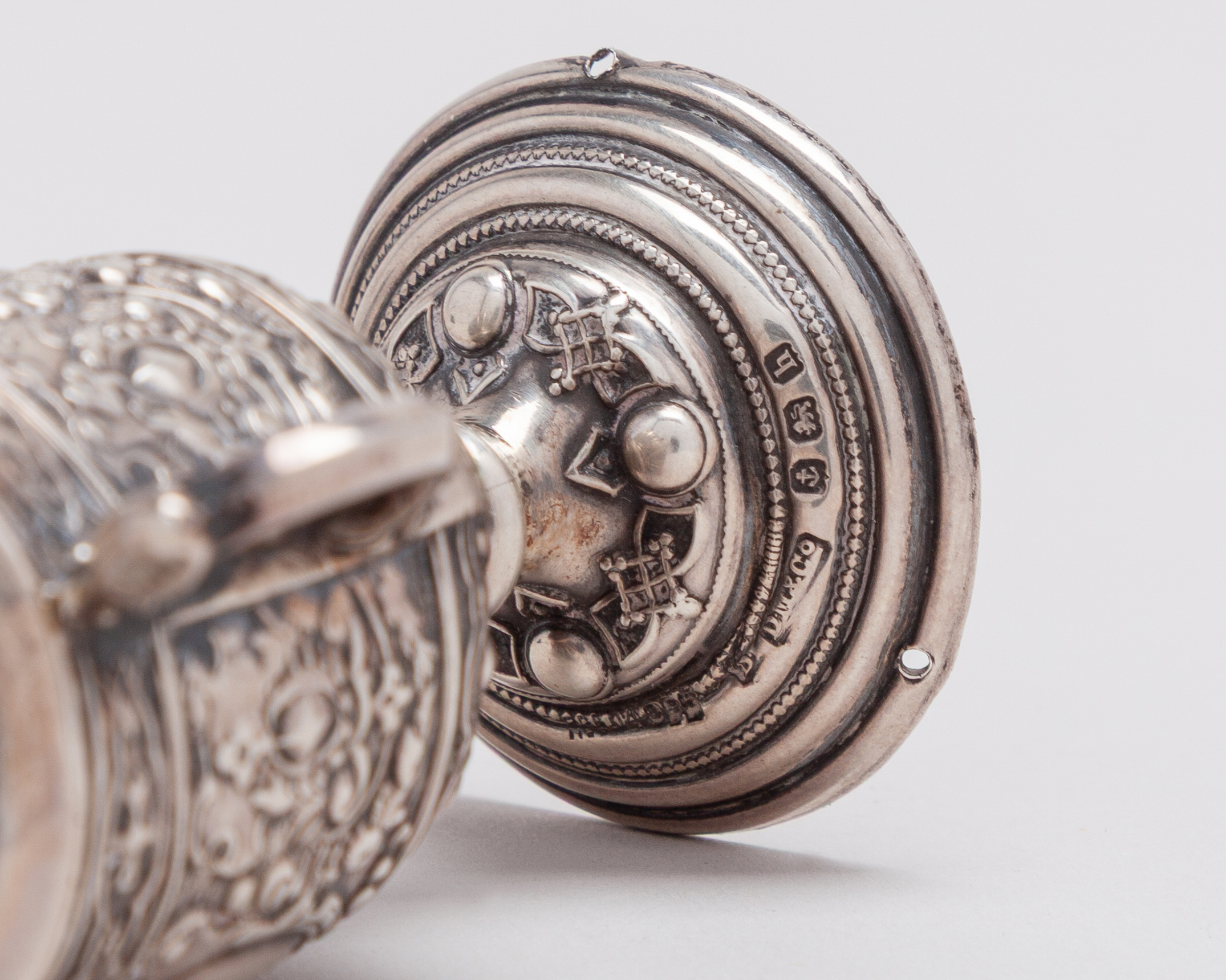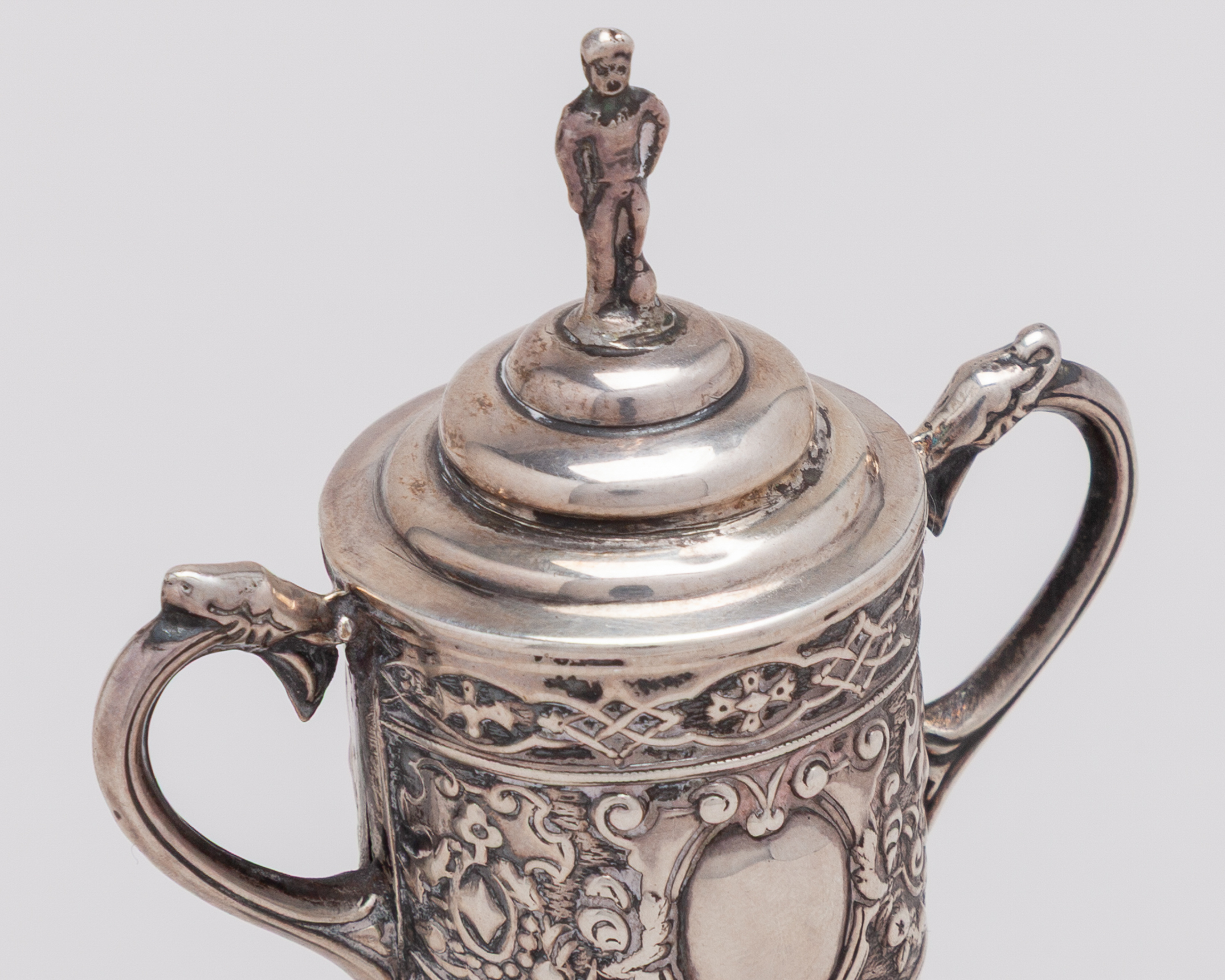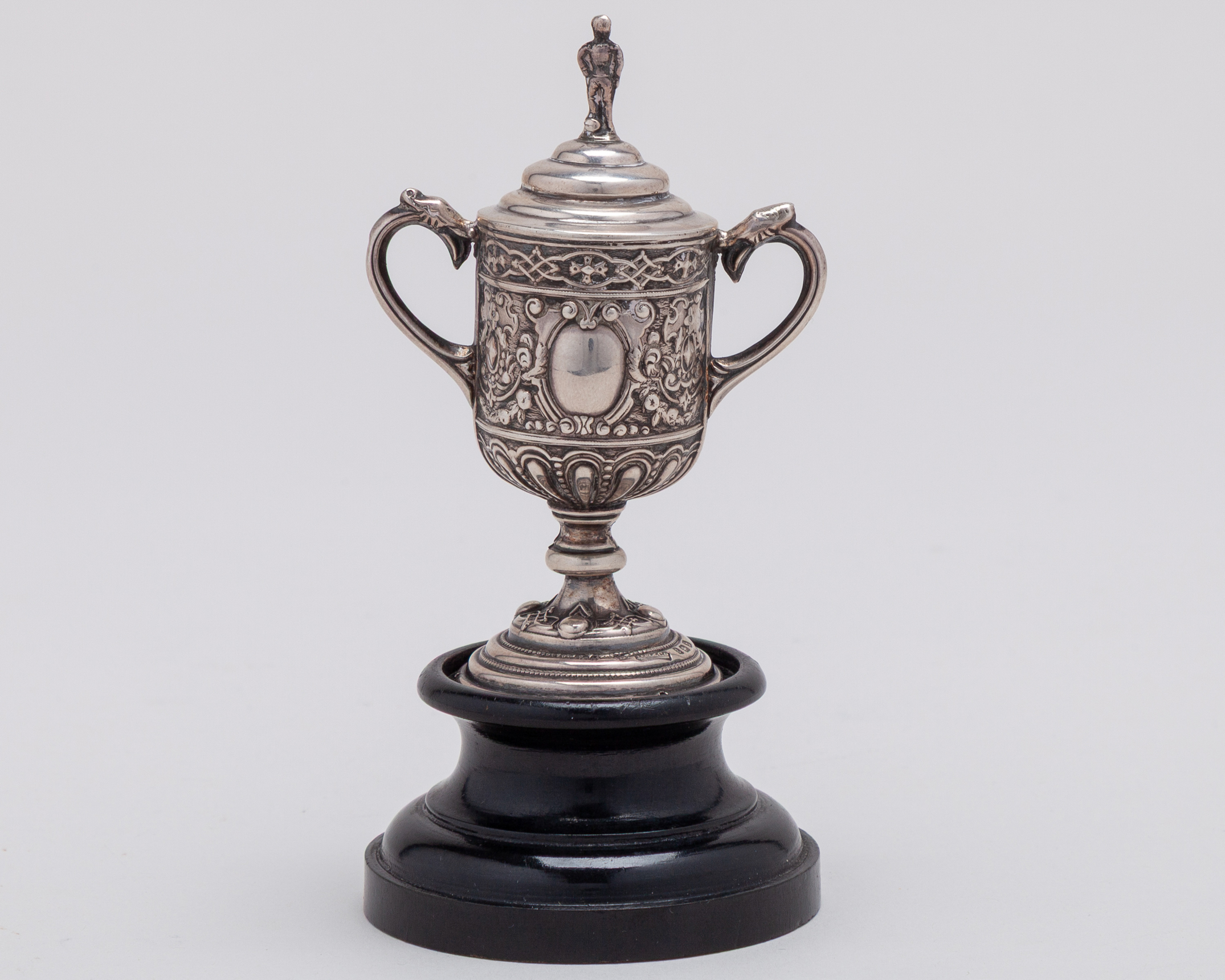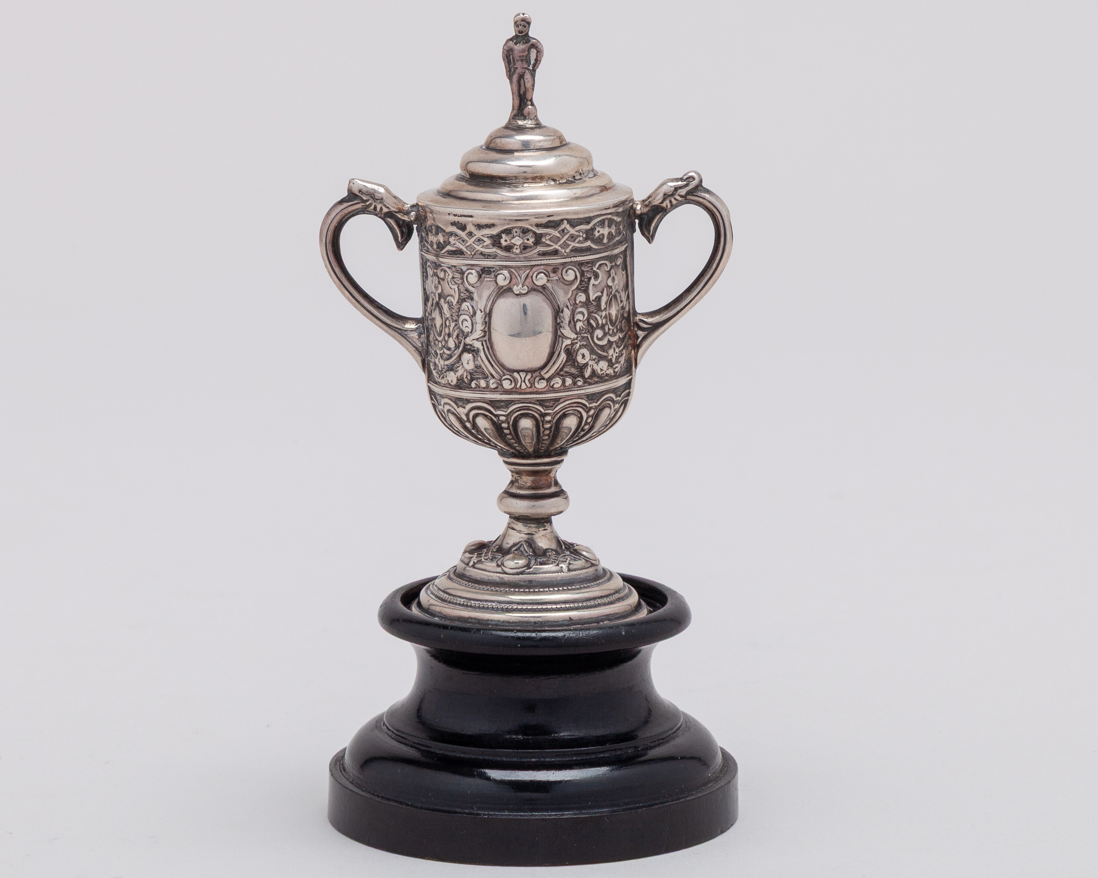 A rare miniature silver F.A.Cup Final trophy, Birmingham, 1907, cast with scrolling foliage, surmounted by figure of a footballer, 9cm high