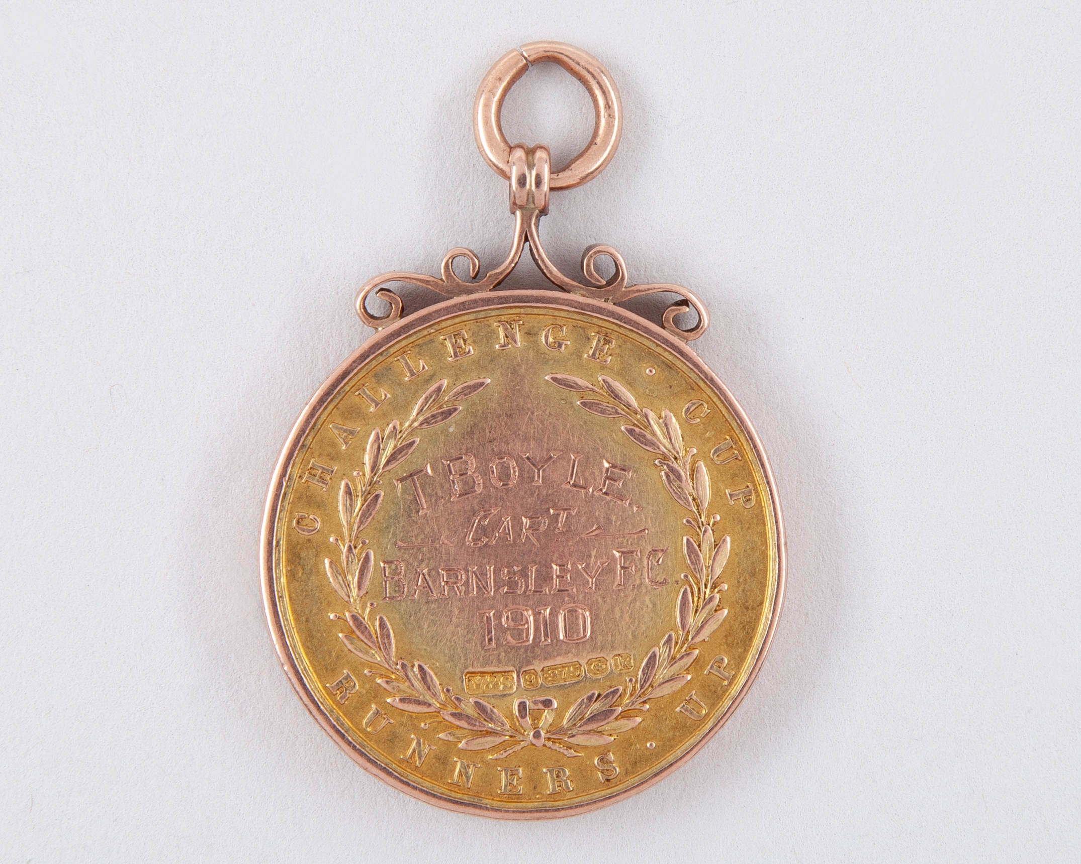 Tommy Boyle 9ct gold Barnsley v. Newcastle United F.A.Cup Runners-Up medal, 1910, the obverse inscribed The Football Association, the reverse inscribed CHALLENGE CUP RUNNERS UP T. BOYLE Capt, Barnsley F.C., 1910