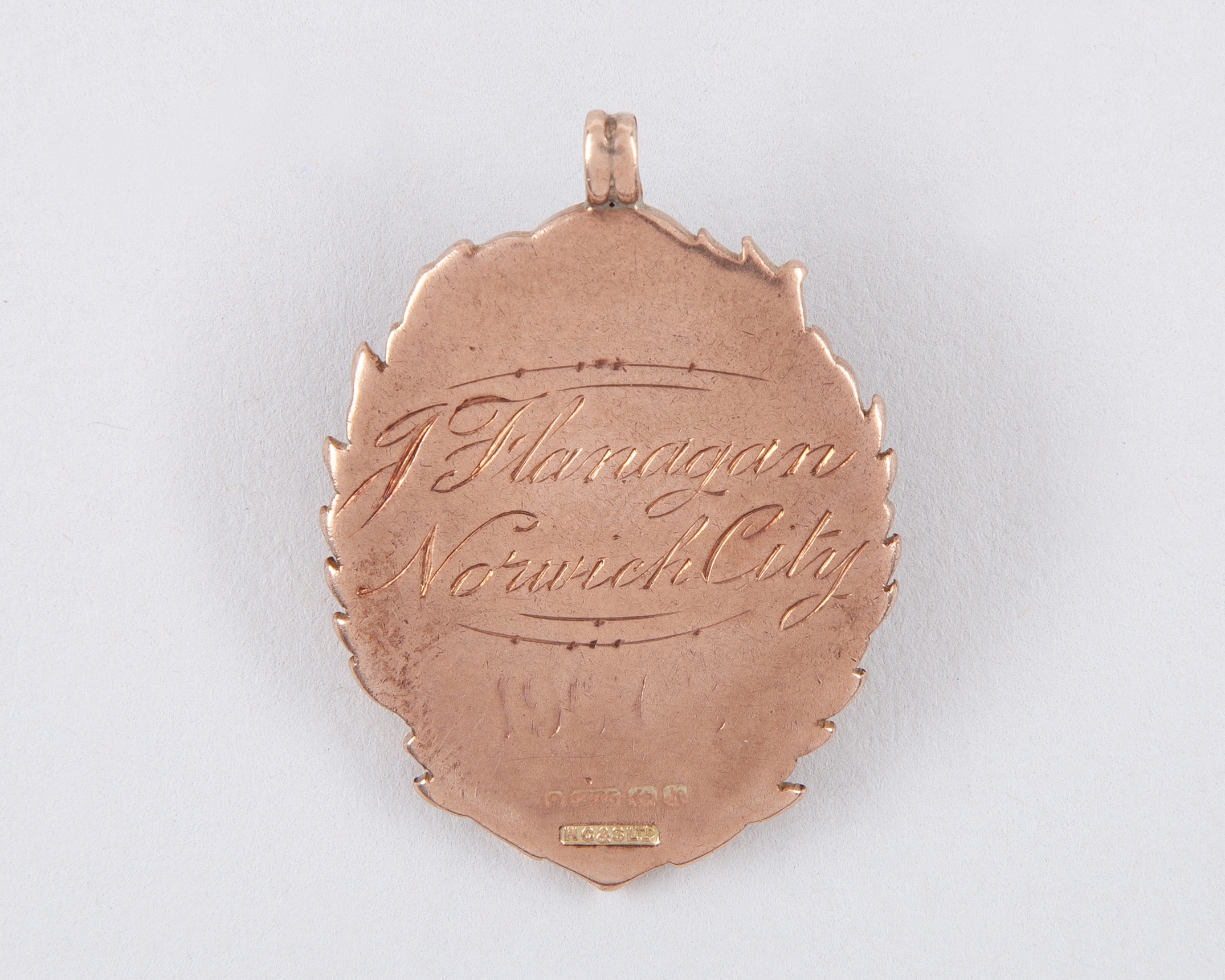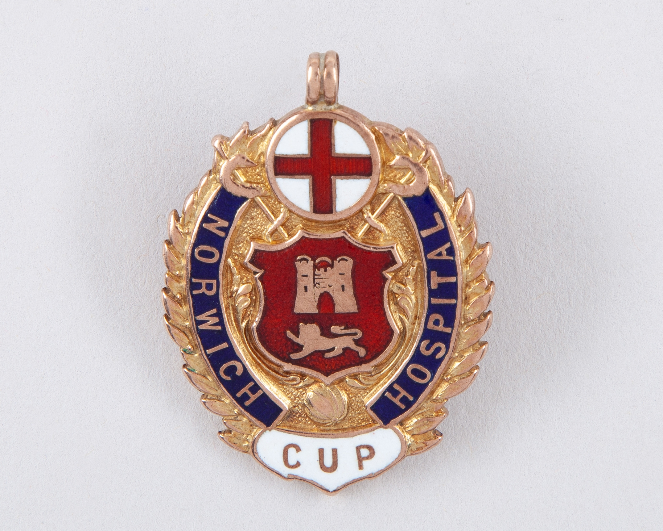Pat Flanagan 9ct gold and enamel Norwich Hospital Cup Winners medal, 1907-08, the obverse inscribed NORWICH HOSPITAL CUP, the reverse inscribed P Flanagan Norwich City, 1907-08, date rubbed, 15grms