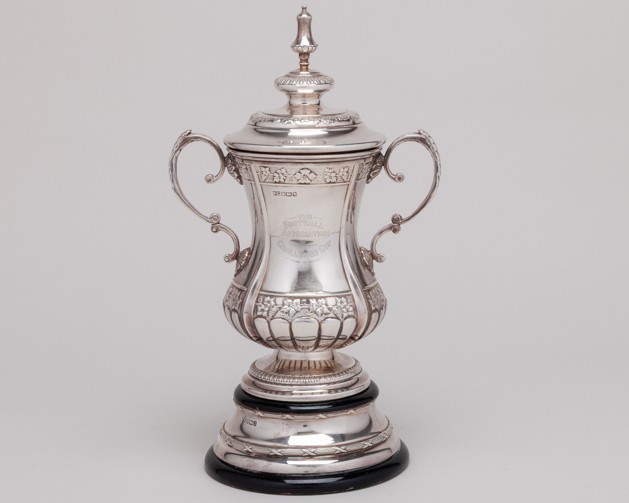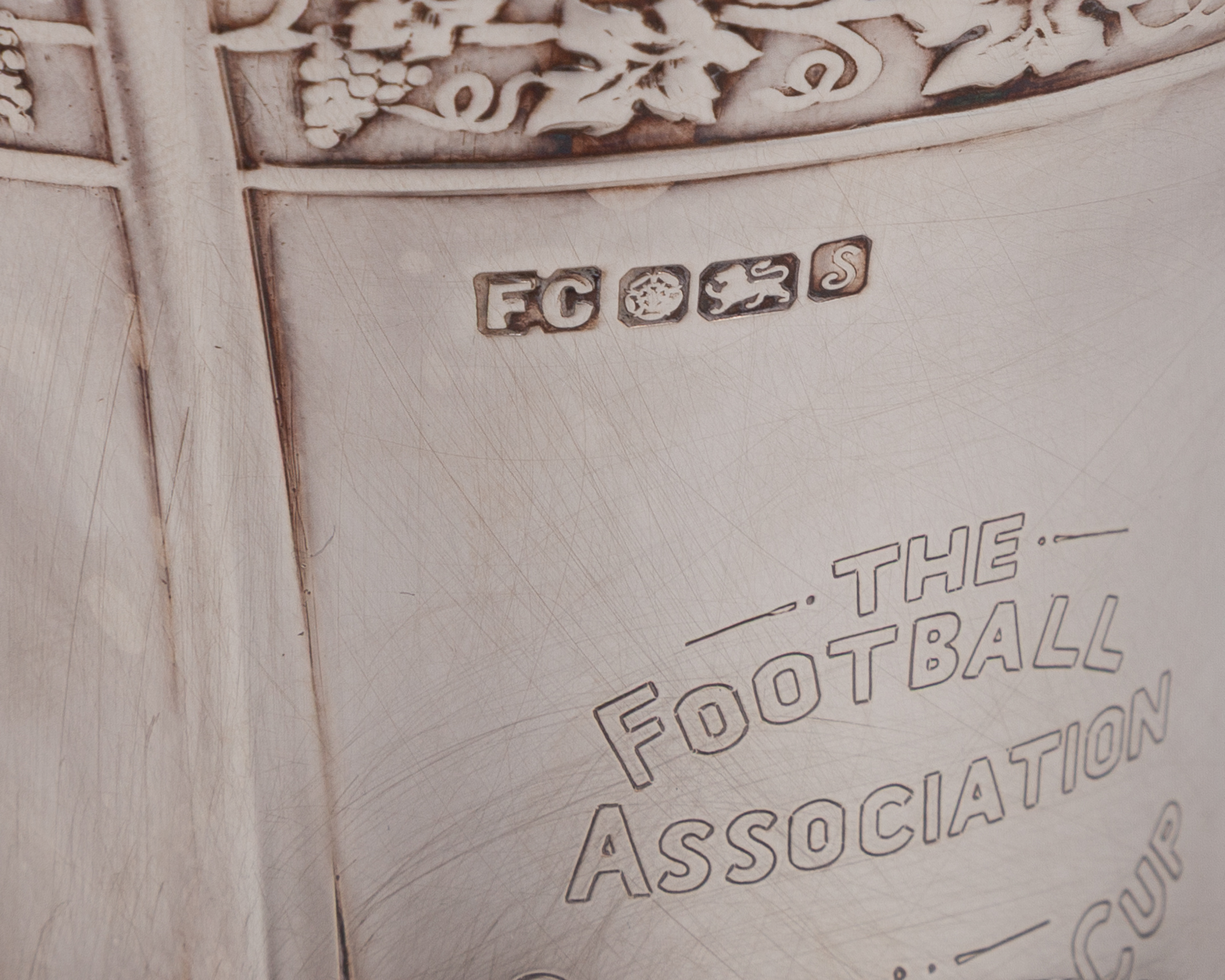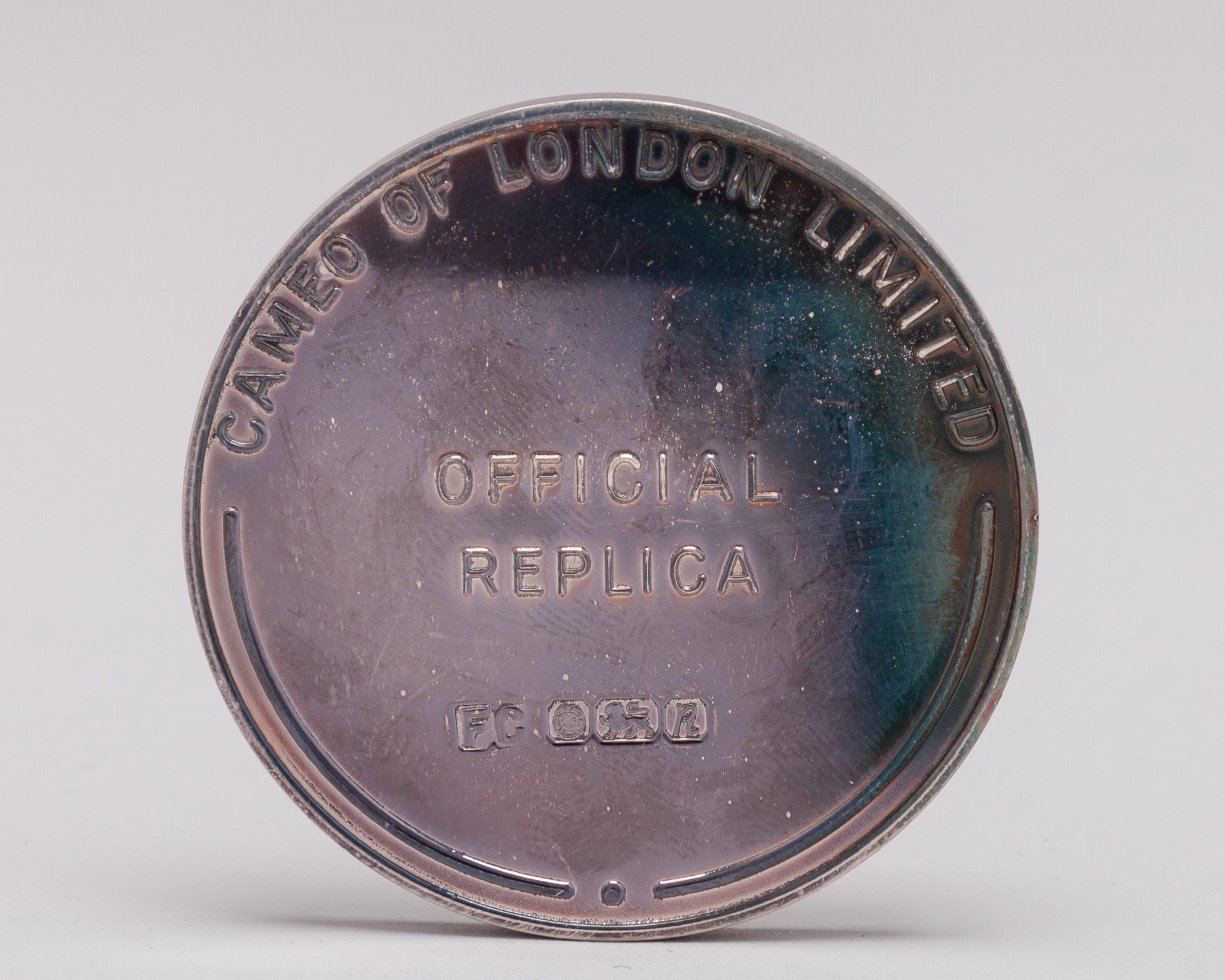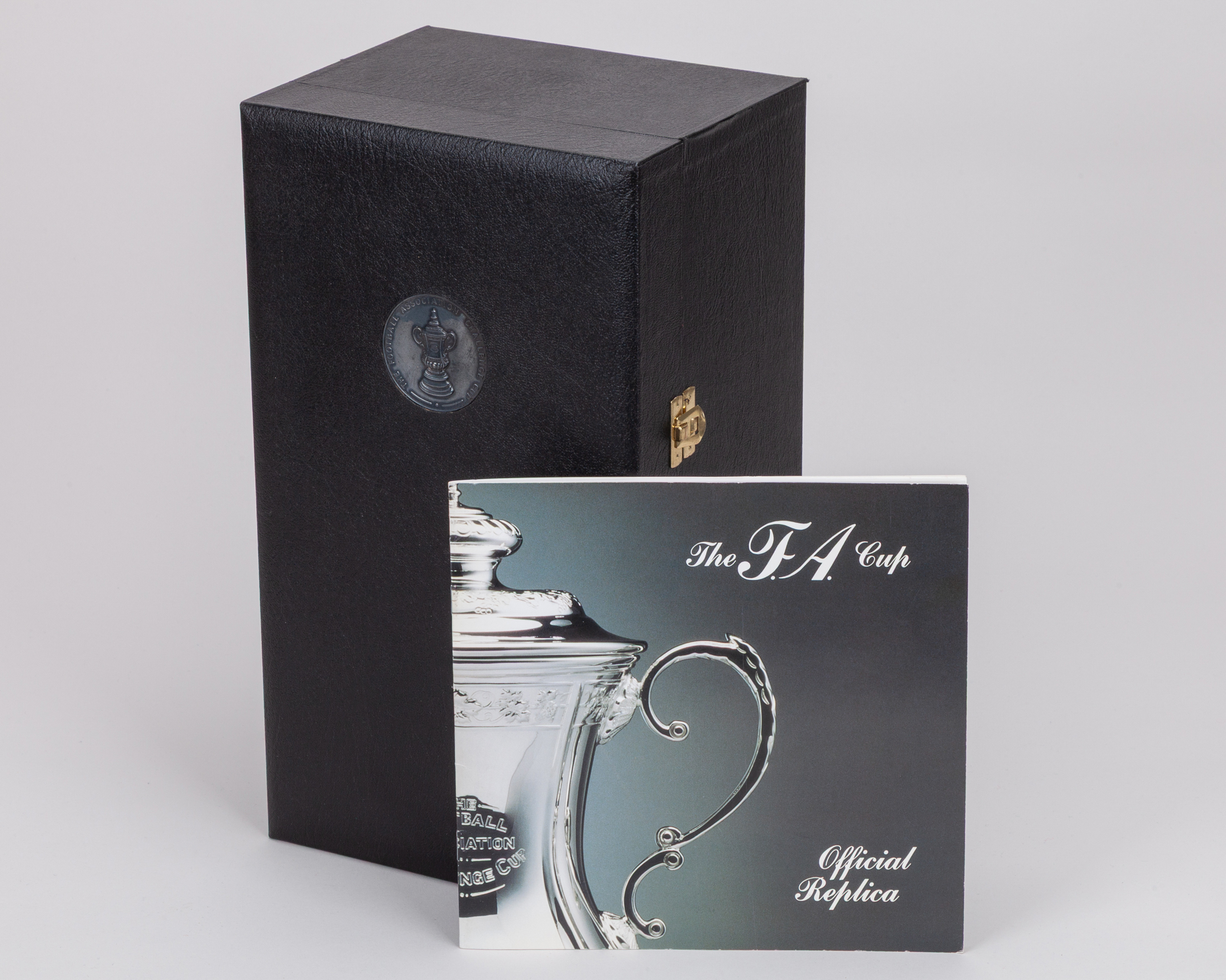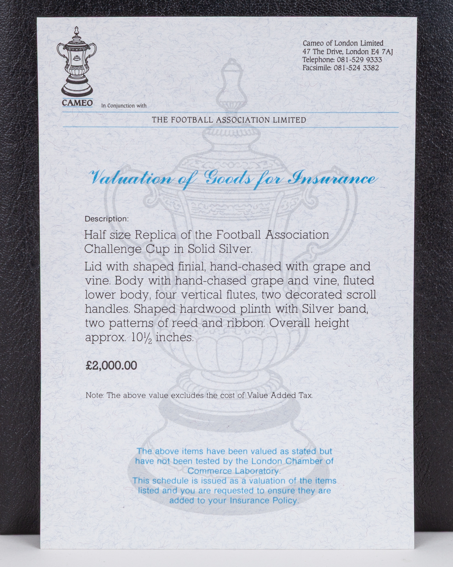 A silver scale-replica of the F.A. Cup trophy, hallmarked Frank Cobb & Co Ltd, Sheffield, 1992, faithfully modelled and inscribed THE FOOTBALL ASSOCIATION CHALLENGE CUP, on a turned wooden base, in original fitted box, overall height when on base 28cm, 544g without base, with a silver hallmarked coin inscribed THE FOOTBALL ASSOCIATION CHALLENGE CUP CAMEO OF LONDON LIMITED OFFICIAL REPLICA, 66g