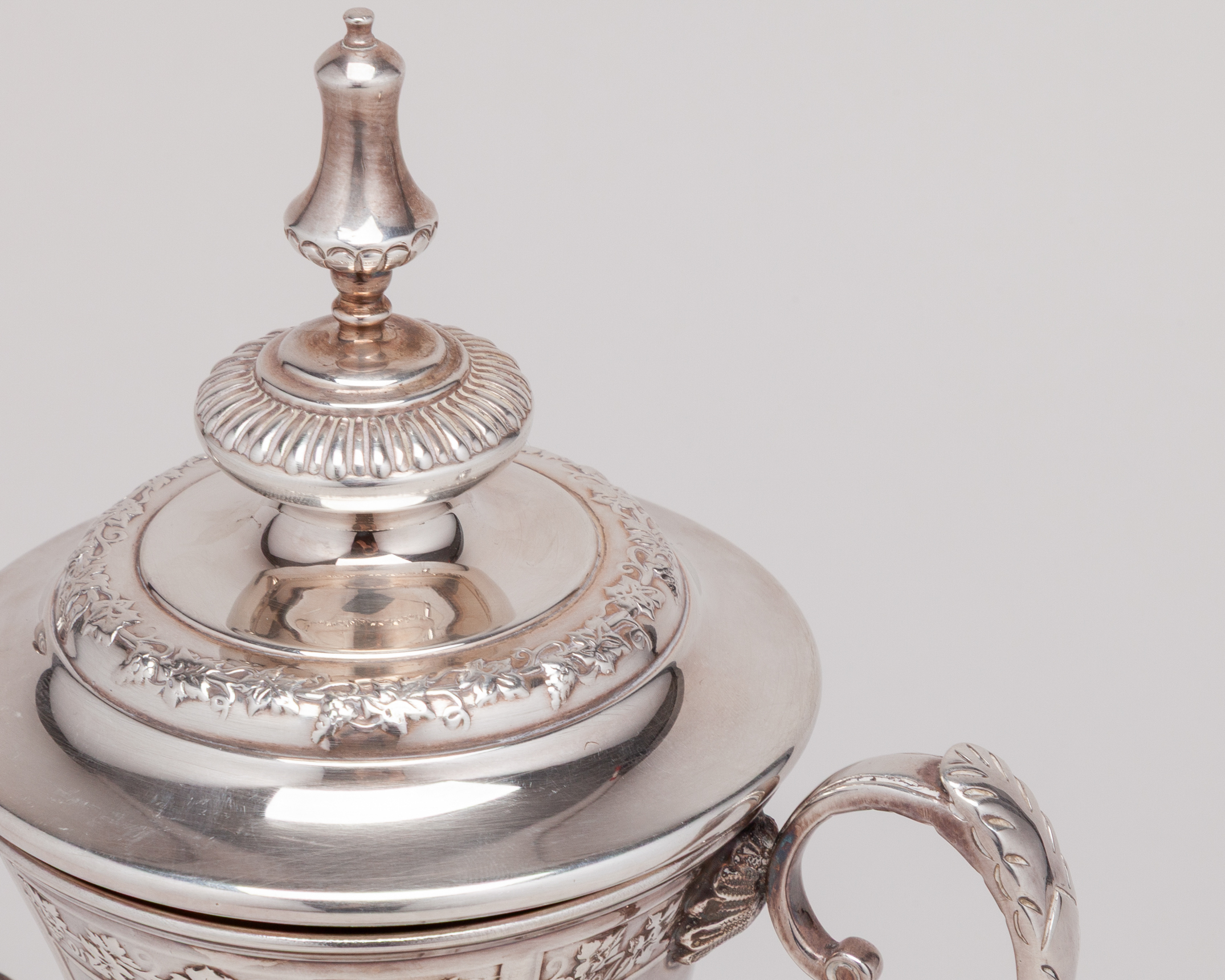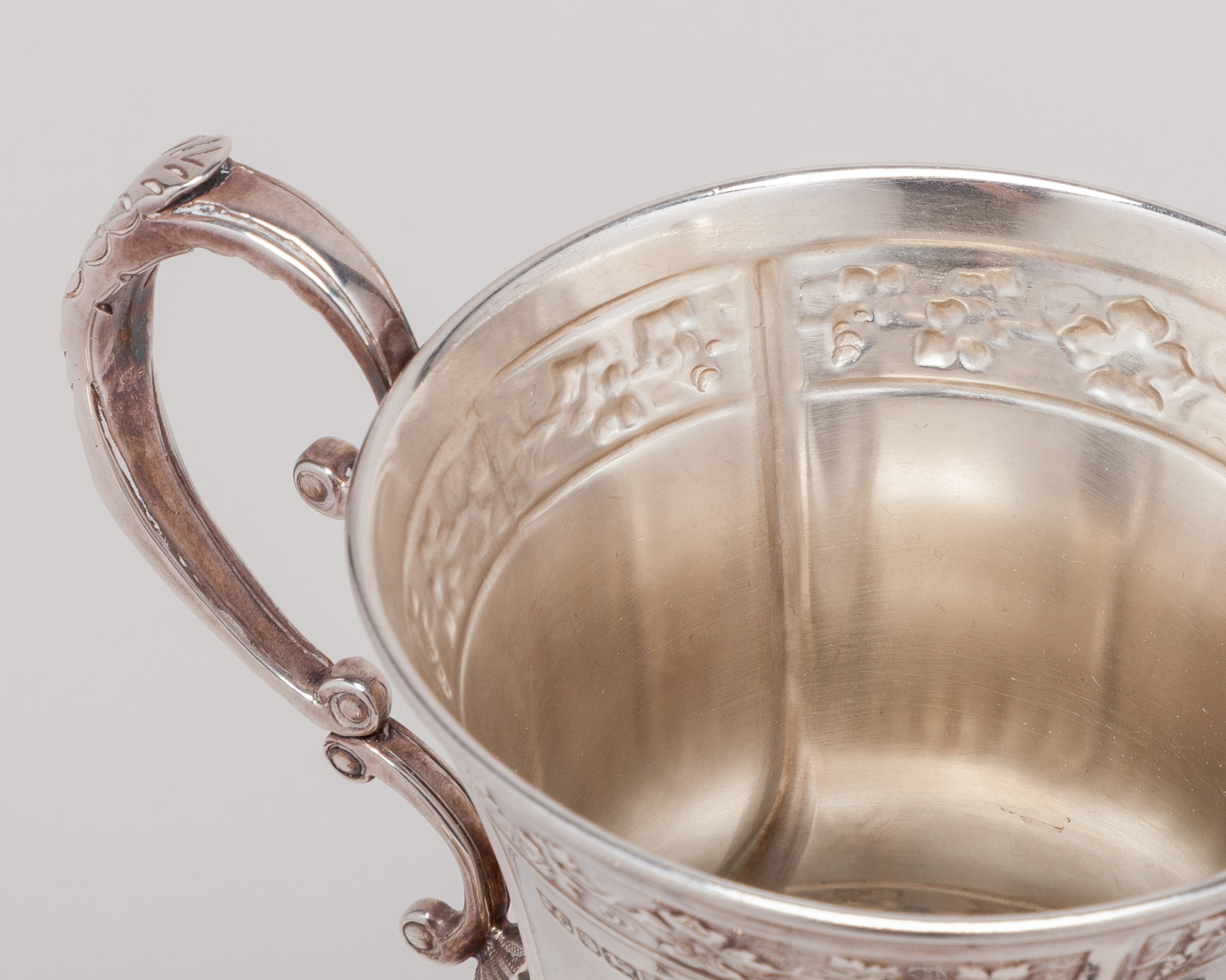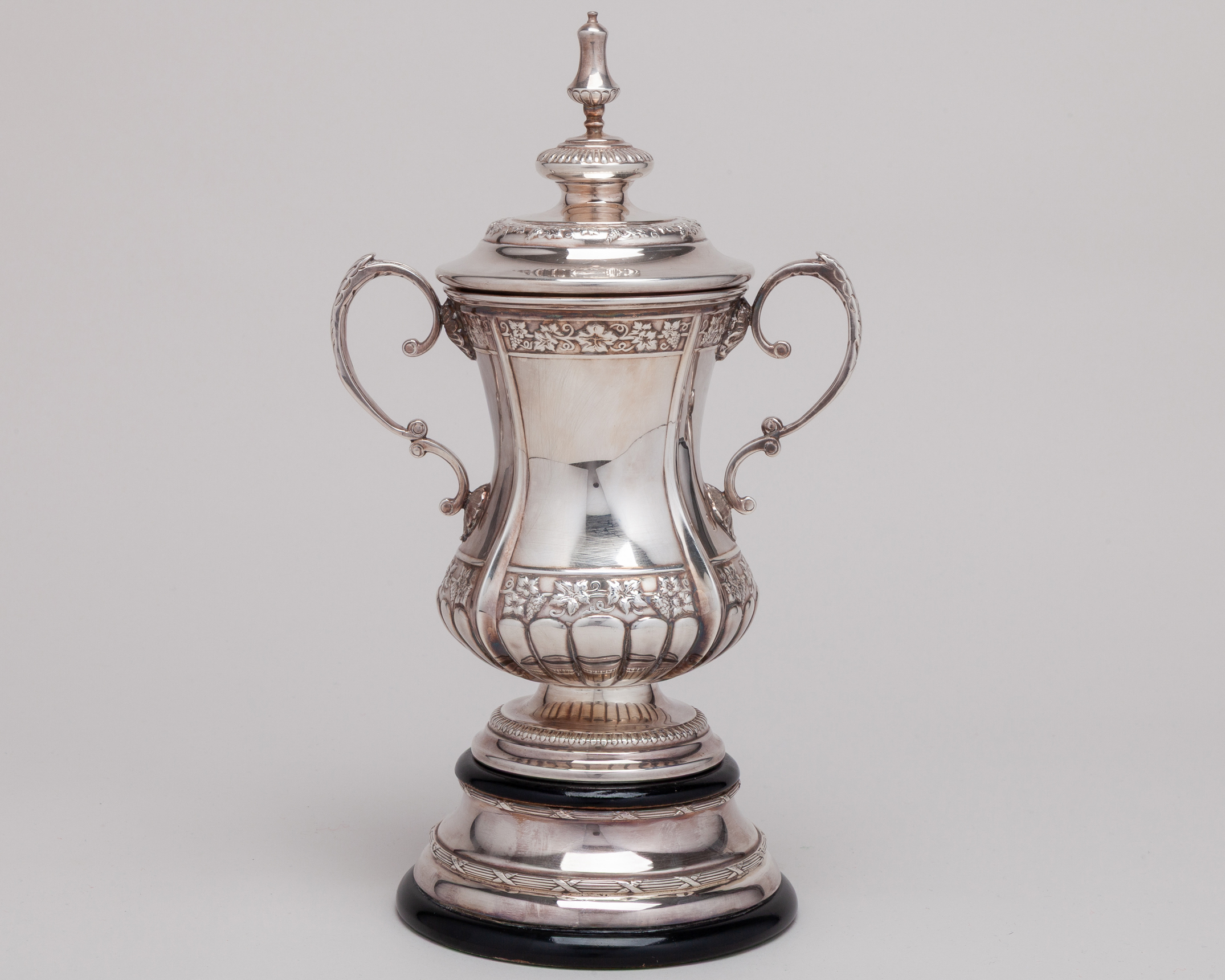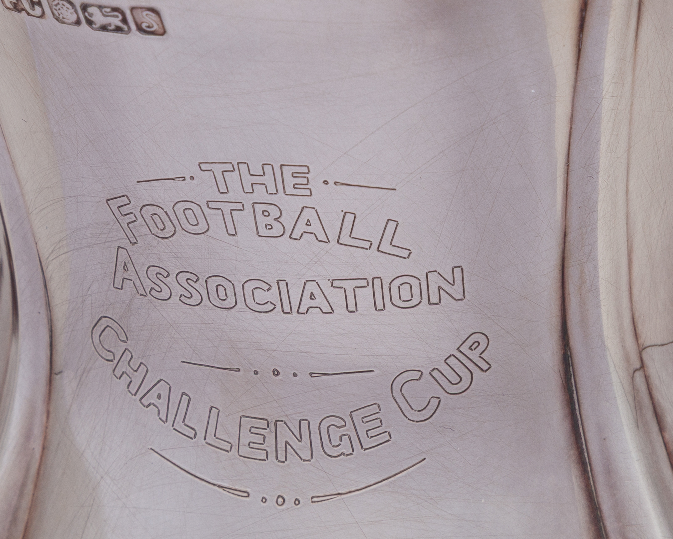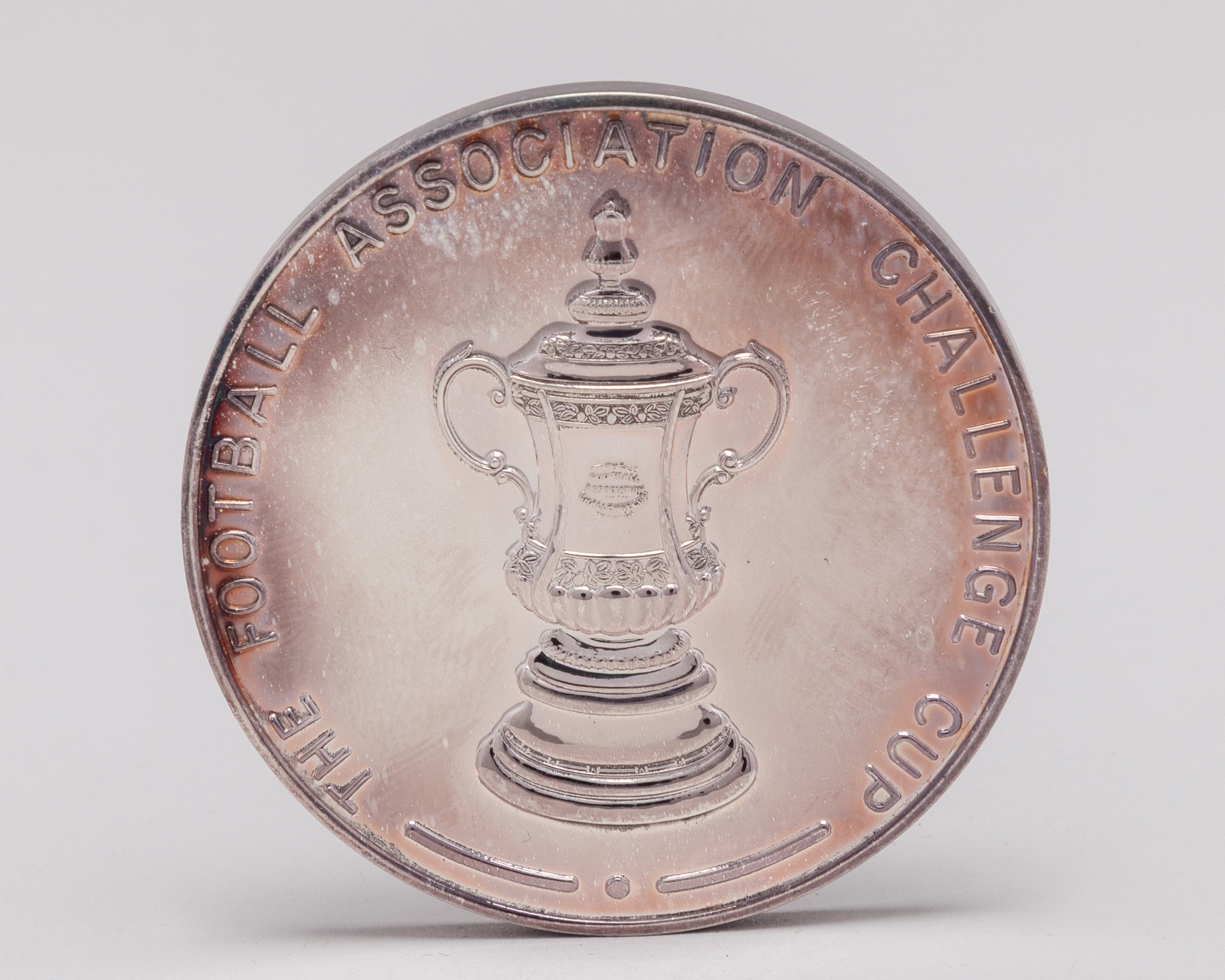 A silver scale-replica of the F.A. Cup trophy, hallmarked Frank Cobb & Co Ltd, Sheffield, 1992, faithfully modelled and inscribed THE FOOTBALL ASSOCIATION CHALLENGE CUP, on a turned wooden base, in original fitted box, overall height when on base 28cm, 544g without base, with a silver hallmarked coin inscribed THE FOOTBALL ASSOCIATION CHALLENGE CUP CAMEO OF LONDON LIMITED OFFICIAL REPLICA, 66g