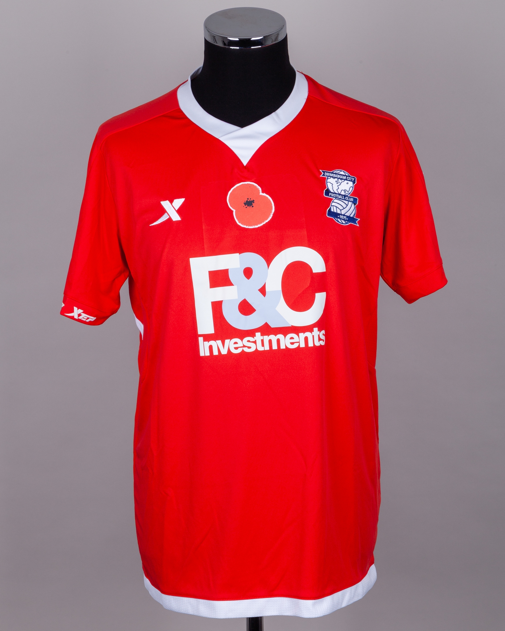 Alexander Hleb red and white No.22 Birmingham City v. Manchester City match worn short-sleeved shirt, 2010, M, with v-neck collar and embroidered badge inscribed BIRMINGHAM CITY FOOTBALL CLUB 1875, with poppy decal, the reverse lettered HLEB